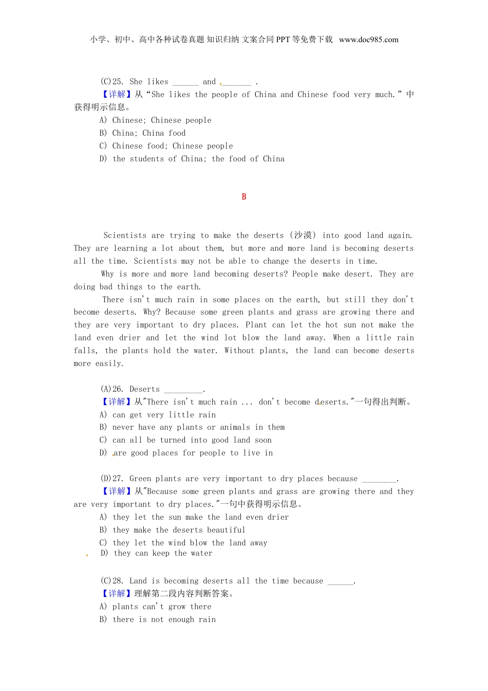 小学、初中、高中各种试卷真题知识归纳文案合同PPT等免费下载www.doc985.com阅读理解强化训练5AMaryisanEnglishgirl,butshelives(住)inChina.Sheissix.Hermothersaystoher,“Youaresixnow.Mary,youaregoingtoschool.Ithinkitisverygood.It'saniceschool.”“IsitanEnglishschool?”Maryasks.“Yes,itis,”hermothersays.ItisSeptember(九月)andthenewschoolyearbegins(开始).Marygoestoschooleveryday.Shelikesherlessonsandherclassmates(同班同学)verymuch..Herclassmateslikeher,too.MarycanspeakalittleChinese.ShelikesChina.ShelikesthepeopleofChinaandChinesefoodverymuch.(D)21.Marylivesin_______.【详解】从“MaryisanEnglishgirl,butshelives(住)inChina.”中获得明示信息。A)EnglandB)FranceC)CanadaD)China[来源:学科网](D)22.Marystudies(学习)in________.【详解】从““IsitanEnglishschool?”Maryasks.“Yes,itis,”中获得信息。A)aFrenchschoolB)aChineseschoolC)aJapaneseschoolD)anEnglishschool(B)23.Marylikesher_______and_______.【详解】从“Shelikesherlessonsandherclassmates(同伴同学)verymuch.”中获得明示信息。A)school;classB)lessons;classmatesC)students;lessonsD)teacher;school(A)24.Marycanspeakalittle________.【详解】从“MarycanspeakalittleChinese.”获得明示信息。A)ChineseB)EnglishC)JapaneseD)French[来源:Zxxk.Com]小学、初中、高中各种试卷真题知识归纳文案合同PPT等免费下载www.doc985.com(C)25.Shelikes______and_______.【详解】从“ShelikesthepeopleofChinaandChinesefoodverymuch.”中获得明示信息。A)Chinese;ChinesepeopleB)China;ChinafoodC)Chinesefood;ChinesepeopleD)thestudentsofChina;thefoodofChinaBScientistsaretryingtomakethedeserts(沙漠)intogoodlandagain.Theyarelearningalotaboutthem,butmoreandmorelandisbecomingdesertsallthetime.Scientistsmaynotbeabletochangethedesertsintime.Whyismoreandmorelandbecomingdeserts?Peoplemakedesert.Theyaredoingbadthingstotheearth.Thereisn'tmuchraininsomeplacesontheearth,butstilltheydon'tbecomedeserts.Why?Becausesomegreenplantsandgrassaregrowingthereandtheyareveryimportanttodryplaces.Plantcanletthehotsunnotmakethelandevendrierandletthewindlotblowthelandaway.Whenalittlerainfalls,theplantsholdthewater.Withoutplants,thelandcanbecomedesertsmoreeasily.(A)26.Deserts_________.【详解】从"Thereisn'tmuchrain...don'tbecomedeserts."一句得出判断。A)cangetverylittlerain[来源:学*科*网Z*X*X*K]B)neverhaveanyplantsoranimalsinthemC)canallbeturnedintogoodlandsoonD)aregoodplacesforpeopletolivein(D)27.Greenplantsareveryimportanttodryplacesbecause________.【详解】从"Becausesomegreenplantsandgrassaregrowingthereandtheyareveryimportanttodryplaces."一句中获得明示信息。A)theyletthesunmakethelandevendrierB)theymakethedesertsbeautifulC)theyletthewindblowthelandawayD)theycankeepthewater(C)28.Landisbecomingdesertsallthetimebecause______.【详解】理解第二段内容判断答案。A)plantscan'tgrowthereB)thereisnotenoughrain小学、初中、高中各种试卷真题知识归纳文案合同PPT等免费下载www.doc985.comC)peoplearedoingsomethingwrongtoitD)thereisn'tenoughrainandpeoplearedoingsomethingwrongtoit(B)29.Whichisthemainideaofthefirstparagraph?【详解】根据文章第一段的大意判断。A)ScientistsknownothingaboutthedesertsB)LandisbecomingthedesertsfasterthanpeoplecanstopitC)Scientistshavechangedallthedesertsintogoodland[来源:学|科|网]D)It'seasytochangedesertsintoland(A)30.Afterreadingthepassage,wewillknowthat_________.【详解】根据文章内容可知,植被能够保持水土,防止沙漠化。A)plantscanstopdrylandfrombecomingdesertsB)itisgoodtocutdownalltheplantsinthedesertC)allplaceswithou...