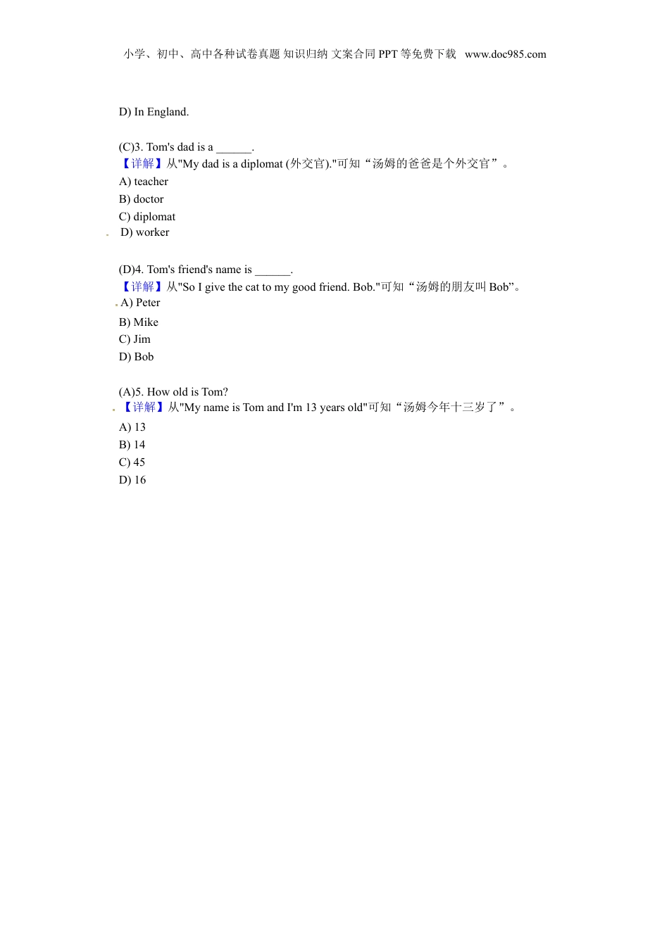 小学、初中、高中各种试卷真题知识归纳文案合同PPT等免费下载www.doc985.com阅读理解提高训练2AMikeandDickworkinthesameoffice.Theydon'tlikethecoldweather.AndonedaytheydecidedtotaketheirholidayinAustralia.TheirplanearrivedinSydneyatnineinthemorning.Theyhadagoodrestinahotel.Thenextmorningtheyrented(租借)acarinthecityandbegantheirtravel.[来源:Zxxk.Com][来源:学_科_网Z_X_X_K]Afewhourslaterthesunwasshiningintheskyandtherewerenoshadetrees(树荫)besidetheroad.Itwassohotthattheycouldhardlygoondriving.Theyhadtostoptolookaround.Mikefoundariveranditwasabouthalfakilometerawayfromthem.Theywerebothveryhappyanddrovethecarquickly.Soontheygottotheriver.Beforetheyjumpedintothewater,Dicksawaboyplayingunderabigtree.Heasked,"Arethereanysharksintheriver,boy?""No,therearen't."answeredtheboy.Sotheybegantoswimintheriver.Afterawhile,Dickfeltsomethinghitagainst(碰撞)hisleg.HetoldMikeaboutit.Theywereafraidandstoppedswimming.Dickaskedloudly,"Isittruethattherearen'tanysharksintheriver?""Yes,sir,"saidtheboy,"There'realotofcrocodiles(鳄鱼)inthewater.Allthesharks(鲨鱼)haveswumaway!"(A)1.MikeandDickwenttoAustralia______.【详解】根据TheirplanearrivedinSydneyatnineinthemorning.看出他们是坐的飞机去澳大利亚。A)byplane[来源:Zxxk.Com]B)bycarC)bytrainD)bymotorbike(C)2.ThetwoyoungmenwenttoAustraliato______.【详解】根据AndonedaytheydecidedtotaketheirholidayinAustralia.可知他们去澳大利亚是度假。A)swimintheriverB)studytodriveC)makeatravelD)findsomework(C)3.MikeandDickcouldn'tdriveanylongerbecause______.【详解】根据文章Afewhourslaterthesunwasshiningintheskyandtherewerenoshadetrees(树荫)besidetheroad.Itwassohotthattheycouldhardlygoondriving.可知因为天气太热又没有树荫他们不能继续开车。A)thesunwasshiningintheskyB)theweatherwasveryhotC)therewerenoshadetreesbesidetheroadD)theyweretootired小学、初中、高中各种试卷真题知识归纳文案合同PPT等免费下载www.doc985.com(B)4.Dickbecameafraidbecause______.【详解】根据文章Theywereafraidandstoppedswimming.Dickaskedloudly,"Isittruethattherearen'tanysharksintheriver?"可知Dick感到害怕是因为他觉得水里可能有鲨鱼。A)hesawasharkinthewaterB)hethoughtthatmaybeasharkhadhitagainsthislegC)hesawtheboylaughingat(嘲笑)themunderthebigtreeD)theboyhadtoldthemthatthereweresomesharksintheriver(D)5.Whentheyheardtheboy'swords,thetwoyoungmenbeganto______.【详解】那孩子说水里没有鲨鱼,只有鳄鱼,两个人年轻人听到后肯定会迅速从水里跑出来。A)catchthecrocodilesinthewaterB)lookforthecrocodilesthereC)runtobeattheAustraliaboyD)comeoutoftheriveratonceBHi!MynameisTomandI'm13yearsold.I'mfromAmerica.It'sourfirsttimetocometoChina.NowI'minamiddleschoolinBeijing.[来源:学#科#网]Thisismyfamily.Mymumisadoctor.Sheworksinachildren'shospital.Mydadisadiplomat(外交官).Hegoestomanycountries.Heoftentellsmeabouthisstoriesinthosecountries.Mysisterisastudent.Sheis15.Sheisverygoodatmath.Mymathisnotgood.Sheoftenhelpsmewithit.MysisterandIloveanimals.WehavealovelycatinourhomeinAmerica.Butwecannotbringitwithus.SoIgivethecattomygoodfriend,Bob.(B)1.HowmanypeoplearethereinTom'sfamily?【详解】根据文章可知:汤姆家有爸爸,妈妈,姐姐,和他自己。A)3B)4C)5D)6(A)2.Whereistheircat?【详解】从"WehavealovelycatinourhomeinAmerica.Butwecannotbringitwithus.SoIgivethecattomygoodfriend.Bob."(汤姆在美国有只猫,但他不能猫带到中国,就把猫给了自己的好朋友鲍勃)可知答案.A)InAmerica.B)InChina.C)InJapan.小学、初中、高中各种试卷真题知识归纳文案合同PPT等免费下载www.doc985.comD)InEngland.(C)3.Tom'sdadisa______.【详解】从"Mydadisadiplomat(外交官)."可知“汤姆的爸爸是个外交官”。A)teacherB)doctorC)diplomatD)worker(D)4.Tom'sfriend'snameis______.【详解】从"SoIgivethecattomygoodfriend.Bob."可知“汤姆的朋友叫Bob”。A)PeterB)MikeC)JimD)Bob(A)5.HowoldisTom?【详解】从"MynameisTomandI'm13yearsold"可知“汤姆今年十三岁了”。A)13B)14C)45[来源:学科网]D)16