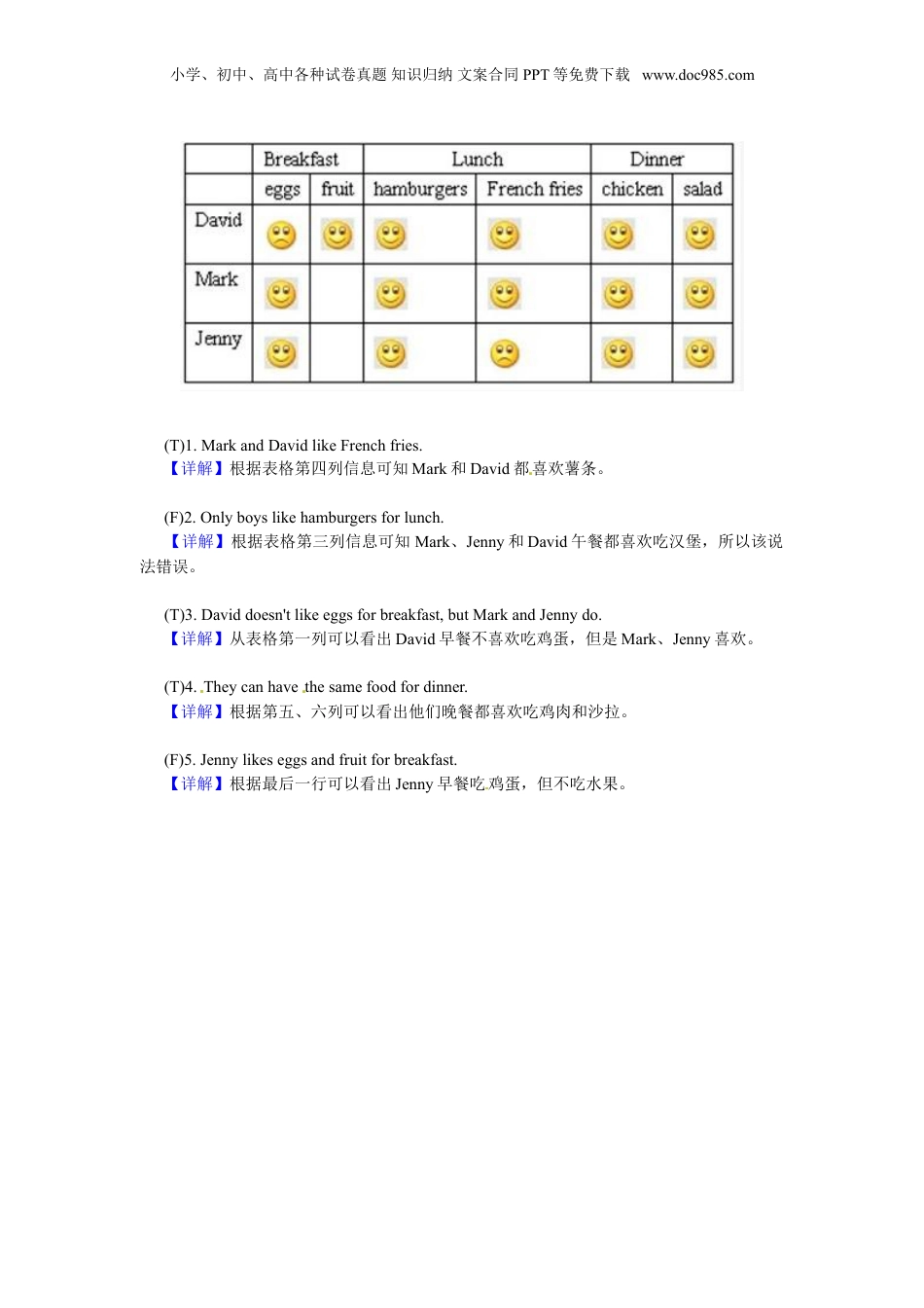 小学、初中、高中各种试卷真题知识归纳文案合同PPT等免费下载www.doc985.com阅读理解提高训练6AMr.SmithisanEnglishman.HeteachesEnglishwell.HisEnglishclassesareveryinteresting.Helikesusandwelikehim,too.Mr.Smithhastwochildren—TomandMary.Tomissevenandhissister,Mary,isfour.TomgoestoschoolbutMarydoesn't.Mr.SmithlikeswearingaT-shirtandjeans(牛仔裤).Footballishisfavoritesport.Afterschoolweoftenhaveabaseballmatch.SometimesMr.Smithwatchesandjoinsus.Heplaysbaseballjustforfun.(T)1.Mr.SmithisanEnglishteacher.【详解】根据短文中HeteachesEnglishwell.(他教英语教得很好)可知表述:Mr.SmithisanEnglishteacher.(他是一个英语老师)是正确的。(T)2.Mr.Smithhasonedaughter.【详解】根据短文中Mr.Smithhastwochildren—TomandMary.Tomissevenandhissister,Mary,isfour.(Smith老师有两个孩子---Tom和Mary.Tom七岁了,他的妹妹Mary四岁了。)可知表述:Mr.Smithhasonedaughter.(Smith老师有一个女儿。)是正确的。(F)3.Marydoesn'tgotoschoolbecauseshelikessports.[来源:学科网ZXXK]【详解】根据短文中hissister,Mary,isfour.TomgoestoschoolbutMarydoesn't.可推知Mary没有上学是因为她才四岁,没有达到上学的年龄;故表述:Marydoesn'tgotoschoolbecauseshelikessports.(Mary没有上学是因为她喜欢体育运动。)是错误的。(T)4.Mr.Smithlikestohavesports.[来源:Zxxk.Com]【详解】根据短文中Footballishisfavoritesport.(足球是他最喜欢的运动)可推知Smith老师喜欢运动,故表述:Mr.Smithlikestohavesports.(Smith老师喜欢运动)是正确的。(F)5.WeoftenplaybaseballwithMr.Smith.【详解】根据短文中Footballishisfavoritesport.Afterschoolweoftenhaveabaseballmatch.SometimesMr.Smithwatchesandjoinsus.Heplaysbaseballjustforfun.(足球是Smith老师最喜欢的运动;课后我们经常举行棒球比赛,有时Smith老师也会观看我们的比赛甚至参与我们,他打棒球只是为了娱乐。)可推知Smith老师只是偶尔会跟我们一起打棒球,故表述:WeoftenplaybaseballwithMr.Smith.(我们经常和Smith老师打棒球)是错误的。B[来源:学科网ZXXK]小学、初中、高中各种试卷真题知识归纳文案合同PPT等免费下载www.doc985.com(T)1.MarkandDavidlikeFrenchfries.【详解】根据表格第四列信息可知Mark和David都喜欢薯条。(F)2.Onlyboyslikehamburgersforlunch.【详解】根据表格第三列信息可知Mark、Jenny和David午餐都喜欢吃汉堡,所以该说法错误。[来源:学&科&网](T)3.Daviddoesn'tlikeeggsforbreakfast,butMarkandJennydo.【详解】从表格第一列可以看出David早餐不喜欢吃鸡蛋,但是Mark、Jenny喜欢。(T)4.Theycanhavethesamefoodfordinner.【详解】根据第五、六列可以看出他们晚餐都喜欢吃鸡肉和沙拉。(F)5.Jennylikeseggsandfruitforbreakfast.【详解】根据最后一行可以看出Jenny早餐吃鸡蛋,但不吃水果。[来源:学科网ZXXK]