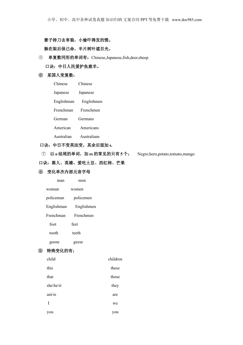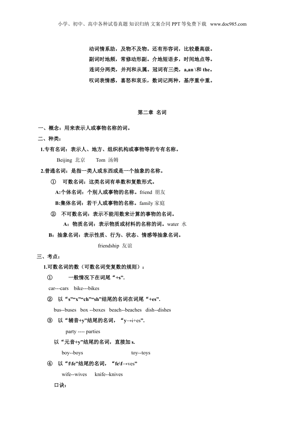 小学、初中、高中各种试卷真题知识归纳文案合同PPT等免费下载www.doc985.com第一章词类一、概念:根据词的形式、意义及其在句中的作用将词分为若干类,叫做词类。二、分类(10类):1:实词(有实义)①名词(noun,缩写为n.)是人和事物的名称。pen(钢笔),English(英语),life(生活)。②代词(pronoun,缩写为pron.)是用来代替名词、数词的词。we(我们),his(他的),all(全部)。③动词(verb,缩写为v)表示动作和状态的词。write(写),eat(吃),sing(唱歌)。④形容词(adjective,缩写为adj.)用来修饰名词或代词,表示人或事物的特征。great(伟大的),honest(诚实的),difficult(困难的)。⑤副词(adverb,缩写为。adv.)是修饰动词、形容词和副词的词。quickly(快),often(经常),very(很)。⑥数词(numeral,缩写为num.)是表示"多少"和"第几"的词。four(四),eighteen(十八),first(第一),eighth(十八),hundred(百),thousand(千)2:虚词(没有实义)①介词(preposition,缩写为prep.)说明词与词之间关系的词。from(从),in(在…内),between(在…之间)②连词(conjunction,缩写为conj.)是连接词与词或句与句的单词。and(和),because(因为),but(但是)。③冠词(article,缩写为art.)用在名词前,说明名词的意义。a,an(一个),the(这,那)。④感叹词(interjection,缩写为int.)表示喜怒哀乐感情的词。oh(噢),aha(啊哈),hi(嗨)。[注]不少词可以属于几个词类,如work(工作;动词和名词),fast(快;形容词和副词),since(自从;连词和介词)等。词类记忆口诀:英语十类词,一定要记住。名代动形副,介连冠感数。名词单复数,可数不可数。代词主宾格,以及所有格。小学、初中、高中各种试卷真题知识归纳文案合同PPT等免费下载www.doc985.com动词情系助,及物不及物。还有形容词,比较最高级。副词时地频,常修动形副。介地短语多,时间地点等。连词分两类,并列和从属。冠词有三类,a,an\和the。叹词表情感,喜怒和哀乐,数词记两种,基序重中重。第二章名词一、概念:用来表示人或事物名称的词。二、种类:1.专有名词:表示人、地方、组织机构或事物等的专有名称。Beijing北京Tom汤姆2.普通名词:是指一类人或东西或是一个抽象的名称。①可数名词:这类名词有单数和复数形式。A:个体名词:个别人或事物的名称。friend朋友B:集体名词:若干人或事物的名称。family家庭②不可数名词:表示不能用数来计算的事物的名词。A:物质名词:表示物质或材料的名称的词。water水B:抽象名词:表示性质、行为、状态、情感等抽象名词。friendship友谊三、考点:1.可数名词的数(可数名词变复数的规则):①一般情况下在词尾“+s”.car---carsbike---bikes②以“s”“x”“ch”“sh”结尾的名词在词尾“+es”.bus--busesbox--boxesbeach--beachesdish--dishes③以“辅音+y”结尾的名词,“y→i+es”.party----parties以“元音+y”结尾的名词,直接加s.boy--boystoy--toys④以“f\fe”结尾的名词,“fe\f→ves”wife--wivesknife--knives口诀:小学、初中、高中各种试卷真题知识归纳文案合同PPT等免费下载www.doc985.com妻子持刀去宰狼,小偷吓得发的慌。躲在架后保己命,半片树叶遮目光。⑤单复数同形的单词有:Chinese,Japanese,fish,deer,sheep口诀:中日人民爱护鱼鹿羊。⑥某国人变复数:ChineseChineseJapaneseJapaneseEnglishmanEnglishmenFrenchmanFrenchmenGermanGermansAmericanAmericansAustralianAustralians口诀:中日不变英法变,其余后面加s.⑦以o结尾的单词,加es的常见的只有5个:Negro,hero,potato,tomato,mango口诀:黑人、英雄、爱吃土豆、西红柿、芒果⑧变化单次内部元音字母manmenwomanwomenpolicemanpolicemenEnglishmanEnglishmenFrenchmanFrenchmenfootfeettoothteethgoosegeese⑨特殊变化的有:childchildrenthisthesethatthoseshe\he\ittheyam\isareIweyouyou小学、初中、高中各种试卷真题知识归纳文案合同PPT等免费下载www.doc985.com2.名词所有格①概念:表示所有关系的名词形式,译作“……的”。Tom'ssisterJim'sbike②形式:A:词尾加's\':多用于有生命的东西。Children...