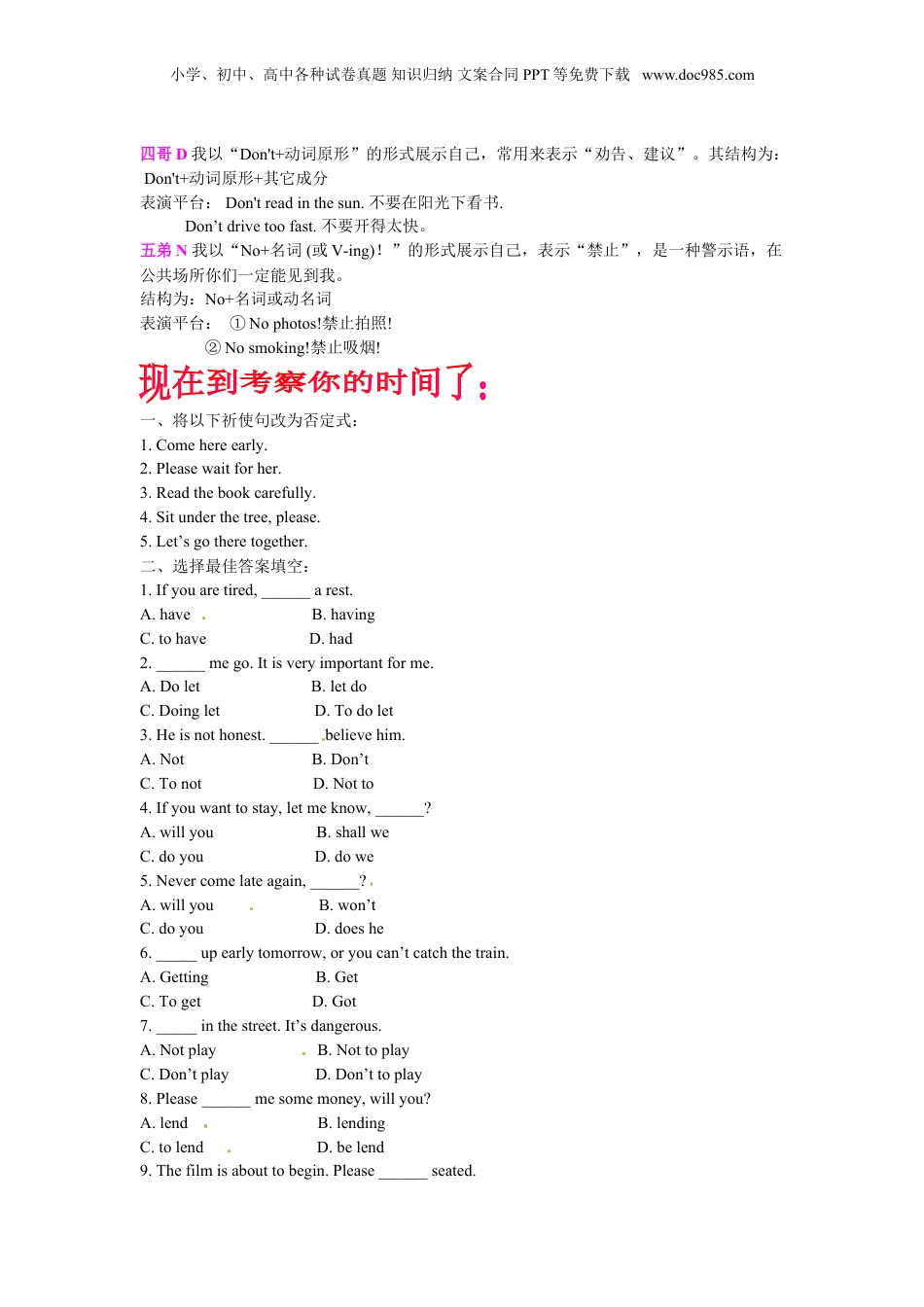 小学、初中、高中各种试卷真题知识归纳文案合同PPT等免费下载www.doc985.comUnit12祈使句家庭的“五兄弟”一、祈使句的自我介绍Hello,boysandgirls!我们祈使句家族的职责是用来表示命令、请求、建议或劝告等。我们常省略主语,谓语动词用原形。现在就让我们一起欣赏祈使句家族“五兄弟”的精彩表演吧。大哥V在我们这个家族里是经常出现的面孔,我以行为动词原形开头,表示请求、命令等。结构为:V(代表行为动词原形)+宾语+其它成分表演平台:Givemeanapple,Tom.给我一个苹果,汤姆。GivemesomeCoke,给我一些可乐。[来源:Zxxk.Com]二哥B我以“Be动词+形容词”的形式登场,表示请求,建议或提醒对方。结构为:Be+表语(名词/形容词等)+其它成分表演平台:Bequiet,please.请安静!Bequick.快点。[来源:学科网ZXXK][来源:学.科.网Z.X.X.K]三哥L我以Let(或Let's)开头,可以表示建议或请求。其结构为:Let+宾语(通常为第一或第三人称宾格)+动词原形+其它成分表演平台:Let'sgotoschool.咱们上学去吧。(表示建议)LetuswatchTV.让我们看电视吧。(表示请求)祈使句中如果有人名等称呼语,一定要用逗号“,”隔开,放在句首或者句尾,其不是句子的主语,只是称呼。祈使句中,表客气的please即可放在句首,又可放在句尾。please放在句尾时,其前要加上逗号。Pleasecomein.请进。Closethedoor,please.请把门关上。Let's包括对方Letus不包括对方小学、初中、高中各种试卷真题知识归纳文案合同PPT等免费下载www.doc985.com四哥D我以“Don't+动词原形”的形式展示自己,常用来表示“劝告、建议”。其结构为:Don't+动词原形+其它成分表演平台:Don'treadinthesun.不要在阳光下看书.Don’tdrivetoofast.不要开得太快。五弟N我以“No+名词(或V-ing)!”的形式展示自己,表示“禁止”,是一种警示语,在公共场所你们一定能见到我。结构为:No+名词或动名词表演平台:①Nophotos!禁止拍照!②Nosmoking!禁止吸烟!一、将以下祈使句改为否定式:1.Comehereearly.2.Pleasewaitforher.3.Readthebookcarefully.4.Situnderthetree,please.5.Let’sgotheretogether.二、选择最佳答案填空:1.Ifyouaretired,______arest.A.haveB.havingC.tohaveD.had2.______mego.Itisveryimportantforme.A.DoletB.letdoC.DoingletD.Todolet3.Heisnothonest.______believehim.A.NotB.Don’tC.TonotD.Notto4.Ifyouwanttostay,letmeknow,______?A.willyouB.shallweC.doyouD.dowe5.Nevercomelateagain,______?A.willyouB.won’tC.doyouD.doeshe6._____upearlytomorrow,oryoucan’tcatchthetrain.A.GettingB.GetC.TogetD.Got7._____inthestreet.It’sdangerous.A.NotplayB.NottoplayC.Don’tplayD.Don’ttoplay8.Please______mesomemoney,willyou?A.lendB.lendingC.tolendD.belend9.Thefilmisabouttobegin.Please______seated.小学、初中、高中各种试卷真题知识归纳文案合同PPT等免费下载www.doc985.comA.beB.areC.isD.being10._____theboxes.Youmayusethemlater.A.KeepB.KeepingC.TokeepD.Kept三、翻译下列各句。1.咱们一起玩吧!2.请不要迟到.[来源:学,科,网]3.回答这个问题.4.我来打开窗户好吗?5.你和我们一起去好吗?自我评估建议用时:15—20分钟实际用时:本部分共有题,正确题数,错误题数,正确率•正确率90%以上—Excellent•正确率80%以上—Good•正确率70%以上—Notbad•正确率60%以上—Soso•正确率不足60%—Let’sreadagain!Whenagroupofwomengotonthecar,everyseatwasalreadyoccupied(占领).Theconductornoticed(注意)amanwhoseemedtobeasleep,andfearing(担心)hemightmisshisstop,henudged(用肘轻轻地碰了碰)himandsaid:"Wakeup,sir!""Iwasn'tasleep,"themananswered."Notasleep?Butyouhadyoureyesclosed.""Iknow.Ijusthate(憎恨,反感)tolookatladiesstandingupbesidemeinacrowded(拥挤)car."你从文中找出一句祈使句吗?小学、初中、高中各种试卷真题知识归纳文案合同PPT等免费下载www.doc985.com答案一、1.Don’tcomehereearly.2.Pleasedon’twaitforher.3.Don’treadthebookcarefully.4.Don’tsitunderthetree,please.5.Don’tlet’sgotheretogether./Let’sdon’tgotheretogether.二、1.—5.AABAA6.—10.BCAAA三、1.Let'splaytogether![来源:Z,xx,k.Com]2.Don'tbelate.3.Answerthisquestion.4.ShallIopenthewindow?5.Willyougowithus?