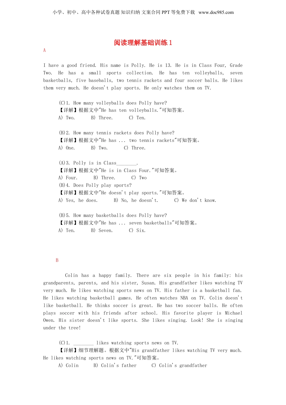 小学、初中、高中各种试卷真题知识归纳文案合同PPT等免费下载www.doc985.com阅读理解基础训练1AIhaveagoodfriend.HisnameisPolly.Heis13.HeisinClassFour,GradeTwo.Hehasasmallsportscollection.Hehastenvolleyballs,sevenbasketballs,fivebaseballs,twotennisracketsandfoursoccerballs.Helikesthemverymuch.Hedoesn'tplaysports.HeonlywatchesthemonTV.21cnjy.com(C)1.HowmanyvolleyballsdoesPollyhave?【详解】根据文中"Hehastenvolleyballs."可知答案。A)Two.B)Three.C)Ten.(B)2.HowmanytennisracketsdoesPollyhave?21·cn·jy·com【详解】根据文中"Hehas...twotennisrackets"可知答案。A)One.B)Two.C)Three.(A)3.PollyisinClass________.【详解】根据文中"HeisinClassFour."可知答案。A)Four.B)Three.C)Two(B)4.DoesPollyplaysports?【详解】根据文中"Hedoesn'tplaysports."可知答案。A)Yes,hedoes.B)No,hedoesn't.C)Wedon'tknow.(B)5.HowmanybasketballsdoesPollyhave?【详解】根据文中"Hehas...sevenbasketballs"可知答案。A)Ten.B)Seven.C)Six.BColinhasahappyfamily.Therearesixpeopleinhisfamily:hisgrandparents,parents,andhissister,Susan.HisgrandfatherlikeswatchingTVverymuch.HelikeswatchingsportsnewsonTV.Hisfatherisabasketballfan.Helikeswatchingbasketballgames.HeoftenwatchesNBAonTV.Colindoesn'tlikebasketball.Hethinkssoccerisgreat.Hehastwosoccerballs.Heoftenplayssoccerwithhisfriendsafterschool.HisfavoriteplayerisMichaelOwen.Hissisterdoesn'tlikesports.Shelikessinging.Look!Sheissingingunderthetree!(C)1.________likeswatchingsportsnewsonTV.21教育网【详解】细节理解题。根据文中"HisgrandfatherlikeswatchingTVverymuch.HelikeswatchingsportsnewsonTV."可知答案。www.21-cn-jy.comA)ColinB)Colin'sfatherC)Colin'sgrandfather小学、初中、高中各种试卷真题知识归纳文案合同PPT等免费下载www.doc985.com(C)2.Colinlikes________verymuch.【详解】细节理解题。根据文中"Hethinkssoccerisgreat."可知答案。A)basketballB)watchingTVC)soccer2·1·c·n·j·y(A)3.Colinoftenplayssoccerwith________.21·世纪*教育网【详解】细节理解题。根据文中"Heoftenplayssoccerwithhisfriendsafterschool."可知答案。www-2-1-cnjy-comA)hisfriendsB)hisparentsC)hissister21*cnjy*com(B)4.WhichisRIGHT?【详解】推理判断题。根据文中"Hisfatherisabasketballfan."可知答案。A)Colinhastwobasketballs.B)Colin'sfatherlikesbasketballverymuch.【来源:21·世纪·教育·网】C)SusanlikeswatchingNBAonTVverymuch.2-1-c-n-j-y(A)5.WhichisNOTright?【详解】细节理解题。根据文中"HisfavoriteplayerisMichaelOwen.Hissisterdoesn'tlikesports.Shelikessinging.Look!Sheissingingunderthetree!"可知答案。21世纪教育网版权所有A)MichaelOwenisSusan'sfavoriteplayer.B)Susanisunderthetree.C)Susanlikessingingverymuch.