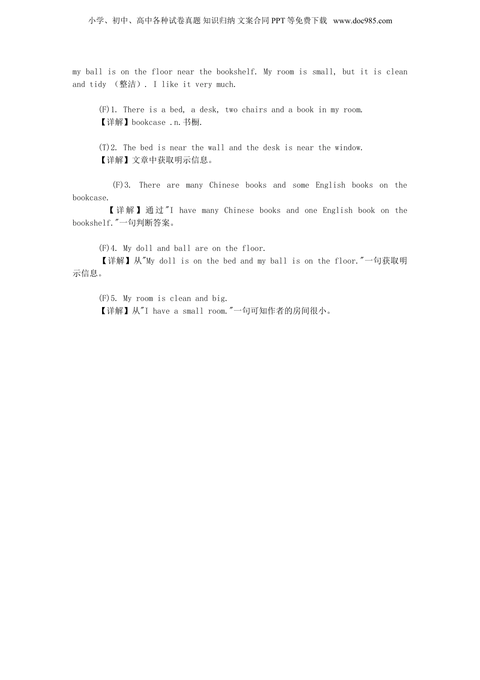 小学、初中、高中各种试卷真题知识归纳文案合同PPT等免费下载www.doc985.com阅读理解基础训练13AThesetwogirlsareLucyandLily.Theyaretwins(双胞胎).Theyare9.Thisisthetwins'room.It'saniceroom.Thewallsarewhite.Thetwobedslookthesame.They'rered.Theyhaveonedeskandtwochairs.Lucy'shatisonherbed.Lily'shatisontheclothestree.Thebooksandpencilcasesareinthedesk.Thebagsarebehindthechairs.Theroomisverynice.21教育网(D)1.LucyandLilyare___________.【详解】从文中第二、三句可知:Theyaretwins.Theyare9.A)sixB)sevenC)eightD)ninewww.21-cn-jy.com(B)2.WhereisLily'shat?【详解】从文中"Lily'shatisontheclothestree."可知答案。A)Onthebed.C)Onthechair.D)Onthedesk.(A)3.Wherearethebooksandpencilcases?【详解】从文中"Thebooksandpencilcasesareinthedesk."可知答案。A)Inthedesk.B)Onthedesk.C)Inthebag.D)Behindthechairs.2·1·c·n·j·y(C)4.Theroomis___________.【详解】从文中"Theroomisverynice."可知答案。A)whiteB)redC)niceD)notnice【来源:21·世纪·教育·网】(C)5.LucyandLilyare___________.【详解】从文中"ThesetwogirlsareLucyandLily.Theyaretwins(双胞胎)"可知答案。21·世纪*教育网A)boysB)brothersC)sistersD)friends(A)6.Thisisapictureofa___________.【详解】根据内容可知图中有床,可推断是卧室。A)bedroomB)classroomC)kitchenD)dining-roomBIhaveasmallroom.InmyroomIhaveabed,adesk,twochairsandabookcase.Thebedisnearthewall.Thedeskisnearthewindow.Onechairisatthedeskandtheotherisnearthebed.ThebookshelfisbesidethedeskandIhavemanyChinesebooksandoneEnglishbookonthebookshelf.Ihavealsoagoodpicture.Itisonthewallnearthebed.Mydoll(娃娃)isonthebedand小学、初中、高中各种试卷真题知识归纳文案合同PPT等免费下载www.doc985.commyballisonthefloornearthebookshelf.Myroomissmall,butitiscleanandtidy(整洁).Ilikeitverymuch.21·cn·jy·com(F)1.Thereisabed,adesk,twochairsandabookinmyroom.【详解】bookcase.n.书橱.(T)2.Thebedisnearthewallandthedeskisnearthewindow.【详解】文章中获取明示信息。(F)3.TherearemanyChinesebooksandsomeEnglishbooksonthebookcase.【详解】通过"IhavemanyChinesebooksandoneEnglishbookonthebookshelf."一句判断答案。21世纪教育网版权所有(F)4.Mydollandballareonthefloor.【详解】从"Mydollisonthebedandmyballisonthefloor."一句获取明示信息。21cnjy.com(F)5.Myroomiscleanandbig.【详解】从"Ihaveasmallroom."一句可知作者的房间很小。