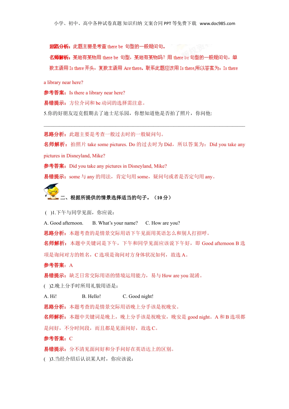 小学、初中、高中各种试卷真题知识归纳文案合同PPT等免费下载www.doc985.com小升初英语重点题型训练-11情景交际(解析版)一、根据所给情景写句子。(10分)1.你告诉老师,你的理想是成为一名工程师,你说:_______________________________________________________________________________思路分析:本题主要考查wantto的句型。名师解析:“理想;梦想”可以用dream表示,当一名工程师是beanengineer。所以联系起来应该为:Mydreamistobeanengineer.。参考答案:Mydreamistobeanengineer.易错提示:want后面跟动词不定式需注意。2.你想知道Sarah有多重,你应该问Sarah:_______________________________________________________________________________思路分析:此题主要是考查对重量的提问。名师解析:英语中询问重量用howheavy。故应译为:Howheavyareyou?参考答案:Howheavyareyou?易错提示:用Howheavy询问与weight的不同。3.你想知道John周末打算干什么,你应该问John:_______________________________________________________________________________思路分析:此题主要是考查一般将来时的常用句型。名师解析:一般将来时的构成是begoingtodo.询问的时候用特殊疑问词:what。.在周末为固定短语ontheweekend.所以该句翻译为Whatareyougoingtodoontheweekend?参考答案:Whatareyougoingtodoontheweekend?易错提示:注意将来时词组begoingtodo的用法。4.你想知道这附近有没有图书馆,你说:_______________________________________________________________________________小学、初中、高中各种试卷真题知识归纳文案合同PPT等免费下载www.doc985.comalibrarynearhere?参考答案:Istherealibrarynearhere?易错提示:方位介词和be动词的选择需注意。5.你的好朋友迈克假期去了迪士尼乐园,你想知道他是否拍了照片,你问他:_______________________________________________________________________________思路分析:此题主要是考查一般过去时的一般疑问句。名师解析:拍照片takesomepictures.Do的过去时为Did,所以答案为:DidyoutakeanypicturesinDisneyland,Mike?参考答案:DidyoutakeanypicturesinDisneyland,Mike?易错提示:some与any的用法,肯定句用some,疑问句或者是否定句用any。二、根据所提供的情景选择适当的句子。(10分)()1.下午与同学见面,你应说:A.Goodafternoon.B.What’syourname?C.Howareyou?思路分析:本题考查的是情景交际用语下午见面用英语怎么和别人打招呼。名师解析:本题中关键词是下午,下午和同学见面应该说下午好,即GoodafternoonB选项是询问对方的姓名,C选项是询问对方身体状况如何,故选A。参考答案:A易错提示:缺乏日常交际用语的情境运用能力,易与Howareyou混淆。()2.晚上分手时所用礼貌用语是:A.Hi!B.Hello!C.Goodnight!思路分析:本题考查的是情景交际用语晚上分手该是祝晚安。名师解析:本题中关键词是晚上,晚上分手该是祝晚安,晚安是goodnight。A和B选项都是问好,不分时间段,而且都是见面问好,故选C。参考答案:C易错提示:分不清见面问好和分手问好在英语达上的区别。()3.当经介绍后认识某人时,你应该说:小学、初中、高中各种试卷真题知识归纳文案合同PPT等免费下载www.doc985.comA.Goodmorning.B.Pleasesitdown.C.Thankyou.D.Nicetomeetyou.思路分析:本题考查的是情景交际用语经别人介绍后认识他人该如何打招呼。名师解析:本题中关键词是和某人认识后应该问好“见到你很高兴”,A选项是早上见到他人问好,不需要他人介绍,B选项是请坐下,C选项是谢谢,故选D。参考答案:D易错提示:易按照汉语逻辑,经人介绍认识他人后请他人坐下,选错答案B。()4.上课铃响了,教师走进教室,班长应该说:A.Pleasecomein.B.Goodmorning.C.Standup.思路分析:本题考查的是情景交际用语上课后班长该说起立,起立用英语怎么表达。名师解析:本题中关键词是上课铃响,教师进教室,班长应该说起立,而起立是standup。A选项是请进,B选项是早上好,故选C。参考答案:C易错提示:审题不清,只看到“走进教室”,单纯的认为是请进,选错...