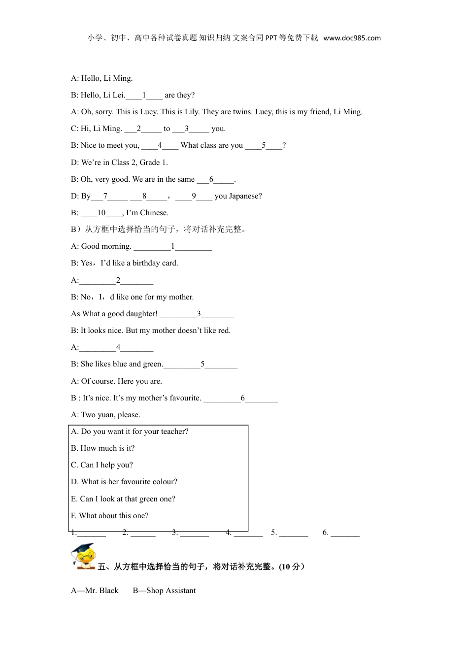 小学、初中、高中各种试卷真题知识归纳文案合同PPT等免费下载www.doc985.com小升初英语重点题型训练-11情景交际(原卷)一、根据所给情景写句子。(10分)1.你告诉老师,你的理想是成为一名工程师,你说:_______________________________________________________________________________2.你想知道Sarah有多重,你应该问Sarah:_______________________________________________________________________________3.你想知道John周末打算干什么,你应该问John:_______________________________________________________________________________4.你想知道这附近有没有图书馆,你说:_______________________________________________________________________________5.你的好朋友迈克假期去了迪士尼乐园,你想知道他是否拍了照片,你问他:_______________________________________________________________________________二、根据所提供的情景选择适当的句子。(10分)()1.下午与同学见面,你应说:A.Goodafternoon.B.What’syourname?C.Howareyou?()2.晚上分手时所用礼貌用语是:A.Hi!B.Hello!C.Goodnight!()3.当经介绍后认识某人时,你应该说:A.Goodmorning.B.Pleasesitdown.C.Thankyou.D.Nicetomeetyou.()4.上课铃响了,教师走进教室,班长应该说:A.Pleasecomein.B.Goodmorning.C.Standup.()5.想知道对方的年龄,应怎样问?A.Howoldareyou?B.Howareyou?C.Howdoyoudo?小学、初中、高中各种试卷真题知识归纳文案合同PPT等免费下载www.doc985.com三、阅读下面的对话,根据上下文,从所给的七个句子中选择五个句子,将对话补充完整,并将该选项前面的字母编号写在相应的横线上。(10分)Tom:Hello,thisisTom.CanIspeaktoMimi,please?Mimi’smum:Hello,Tom.1__________Mimiisdoingthedishesinthekitchen.Tom:OK.Thankyou.Mimi’smum:Mimi,2__________.Mimi:Thankyou,Mum.(Mimicomesandanswersthephone.)Mimi:Hello,Tom.It’sMimi.Tom:Mimi,let’sgotothelibrarytomorrow.Mimi:Oh,sorry,Tom.Ican’tgowithyou.Iamgoingtocookdinnertomorrow.Tom:Butwhy?Mimi:3__________Tom:Oh,yourmum’sbirthday!4__________Mimi:Iamgoingtocooksomenoodles.Tom:5__________Mimi:It’seasy.First,putsomewaterinthepotandthenputthenoodles.Inseveralminutes,theyareready.Tom:Wow!Youaregreat.Haveaniceweekend.Mimi:Thankyou.Bye.四、情境交际。(20分)A)根据上下文内容在每个空格内填入一个适当的单词。A.Howdoyoudothat?B.Sorry,youcan’t.C.Holdon,please.D.Whatareyoucookingforher?E.Whatareyougoingtocookforher?F.Becauseit’smymum’sbirthdayG.Thereisacallforyou.小学、初中、高中各种试卷真题知识归纳文案合同PPT等免费下载www.doc985.comA:Hello,LiMing.B:Hello,LiLei.____1____arethey?A:Oh,sorry.ThisisLucy.ThisisLily.Theyaretwins.Lucy,thisismyfriend,LiMing.C:Hi,LiMing.___2_____to___3_____you.B:Nicetomeetyou,____4____Whatclassareyou____5____?D:We’reinClass2,Grade1.B:Oh,verygood.Weareinthesame___6_____.D:By___7________8_____,____9____youJapanese?B:____10____,I’mChinese.B)从方框中选择恰当的句子,将对话补充完整。A:Goodmorning._________1_________B:Yes,I’dlikeabirthdaycard.A:_________2________B:No,I,dlikeoneformymother.AsWhatagooddaughter!_________3________B:Itlooksnice.Butmymotherdoesn’tlikered.A:_________4________B:Shelikesblueandgreen._________5________A:Ofcourse.Hereyouare.B:It’snice.It’smymother’sfavourite._________6________A:Twoyuan,please.A.Doyouwantitforyourteacher?B.Howmuchisit?C.CanIhelpyou?D.Whatisherfavouritecolour?E.CanIlookatthatgreenone?F.Whataboutthisone?1._______2.______3._______4._______5._______6._______五、从方框中选择恰当的句子,将对话补充完整。(10分)A—Mr.BlackB—ShopAssistant小学、初中、高中各种试卷真题知识归纳文案合同PPT等免费下载www.doc985.comA:Goodmo...