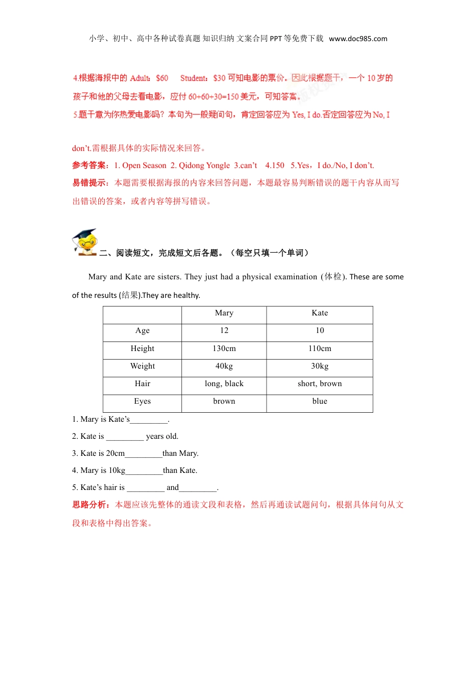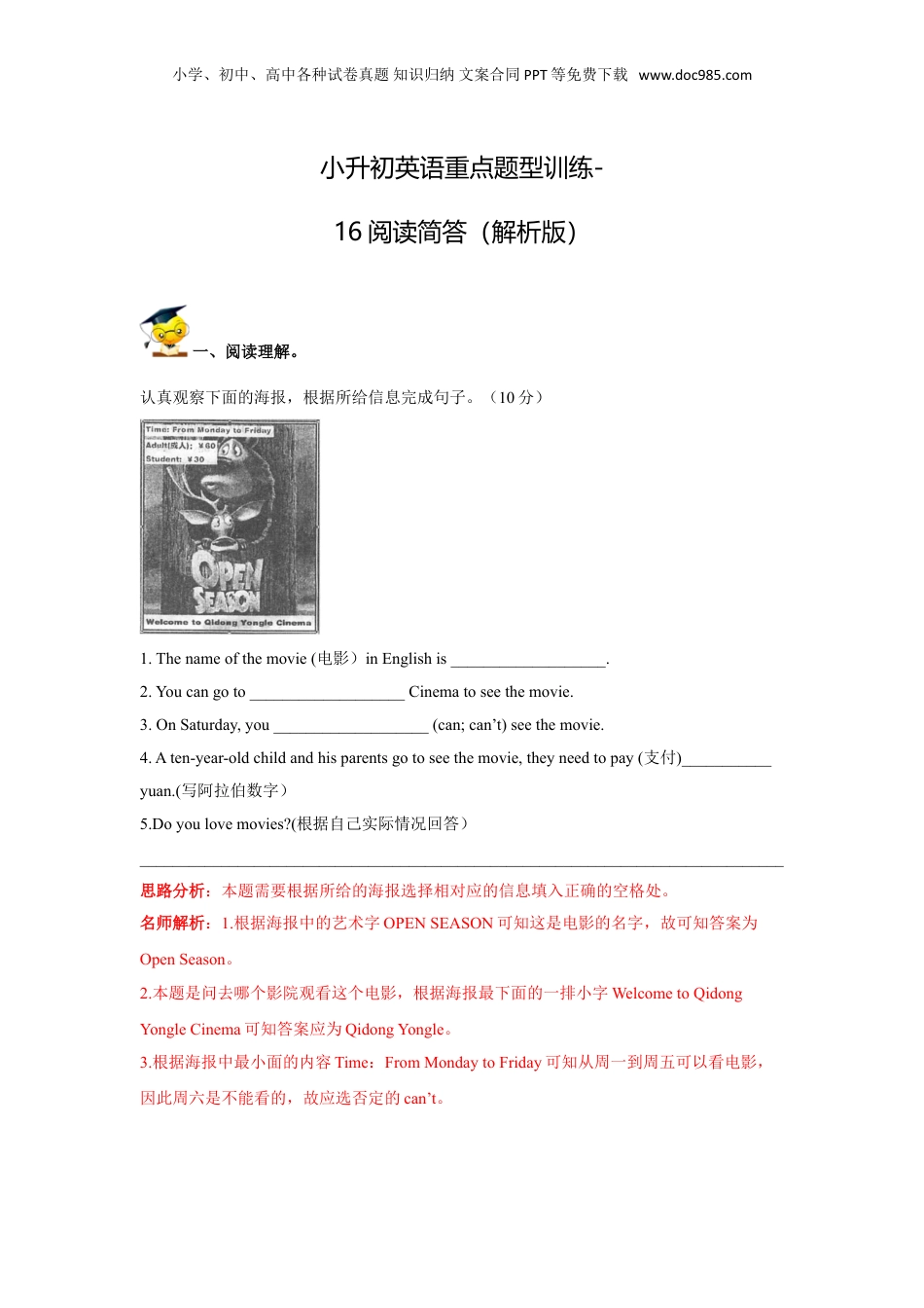 小学、初中、高中各种试卷真题知识归纳文案合同PPT等免费下载www.doc985.com小升初英语重点题型训练-16阅读简答(解析版)一、阅读理解。认真观察下面的海报,根据所给信息完成句子。(10分)1.Thenameofthemovie(电影)inEnglishis___________________.2.Youcangoto___________________Cinematoseethemovie.3.OnSaturday,you___________________(can;can’t)seethemovie.4.Aten-year-oldchildandhisparentsgotoseethemovie,theyneedtopay(支付)___________yuan.(写阿拉伯数字)5.Doyoulovemovies?(根据自己实际情况回答)_______________________________________________________________________________思路分析:本题需要根据所给的海报选择相对应的信息填入正确的空格处。名师解析:1.根据海报中的艺术字OPENSEASON可知这是电影的名字,故可知答案为OpenSeason。2.本题是问去哪个影院观看这个电影,根据海报最下面的一排小字WelcometoQidongYongleCinema可知答案应为QidongYongle。3.根据海报中最小面的内容Time:FromMondaytoFriday可知从周一到周五可以看电影,因此周六是不能看的,故应选否定的can’t。小学、初中、高中各种试卷真题知识归纳文案合同PPT等免费下载www.doc985.comdon’t.需根据具体的实际情况来回答。参考答案:1.OpenSeason2.QidongYongle3.can’t4.1505.Yes,Ido./No,Idon’t.易错提示:本题需要根据海报的内容来回答问题,本题最容易判断错误的题干内容从而写出错误的答案,或者内容等拼写错误。二、阅读短文,完成短文后各题。(每空只填一个单词)MaryandKatearesisters.Theyjusthadaphysicalexamination(体检).Thesearesomeoftheresults(结果).Theyarehealthy.MaryKateAge1210Height130cm110cmWeight40kg30kgHairlong,blackshort,brownEyesbrownblue1.MaryisKate’s_________.2.Kateis_________yearsold.3.Kateis20cm_________thanMary.4.Maryis10kg_________thanKate.5.Kate’shairis_________and_________.思路分析:本题应该先整体的通读文段和表格,然后再通读试题问句,根据具体问句从文段和表格中得出答案。小学、初中、高中各种试卷真题知识归纳文案合同PPT等免费下载www.doc985.com参考答案:1.sister2.103.shorter4.heavier5.short;brown易错提示:注意第5小题提问的是头发hair不是眼睛eye。三、阅读短文,回答问题。Lookatthephoto.ItisMr.Lee’shouse.Therewasasofabesidethewindow.Nowitisbesidethedesk.Themirrorwasabovethesofa.Nowthereisamapabovethesofa.Therewasagreenrug(地毯)inthesitting-room.Nowthereisabluerug.Theshelfisontheright.Therewasaradioonit.Butnowthere’snoradio.Therearesomebooksonit.Mr.Leelikedmusic.Nowhelikesreading.1.Whosehouseisthis?___________________________________________________________________________2.Whereisthesofanow?___________________________________________________________________________3.Isthereamirrorabovethesofanow?___________________________________________________________________________4.Whatcolourwastherug?___________________________________________________________________________5.DidMr.Leelikemusic?___________________________________________________________________________思路分析:本题应该先整体的通读文段,然后再通读试题问句,根据具体问句从文章中得出答案。名师解析:1.问题是这是谁的房子?由第二句ItisMr.Lee’shouse.它是李先生的房子。可知小学、初中、高中各种试卷真题知识归纳文案合同PPT等免费下载www.doc985.com答案是ItisMr.Lee’shouse。2.问题是现在沙发在哪儿?由第三四句Therewasasofabesidethewindow.Nowitisbesidethedesk.(以前沙发在窗户旁边,现在在桌子旁边。)therewas是过去时,表示以前,问现在用一般现在时。可知答案是:Nowitisbesidethedesk。3.问题是现在镜子在沙发上面吗?由句子Nowthereisamapabovethesofa.现在沙发上面有一幅地图。可知答案是No,thereisn’t.。4.问题是地毯以前是什么颜色的...