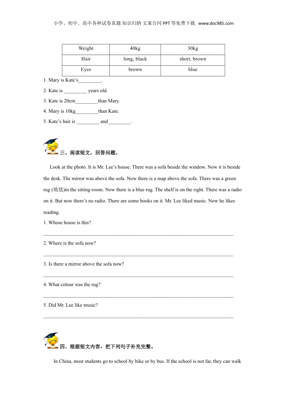 小学、初中、高中各种试卷真题知识归纳文案合同PPT等免费下载www.doc985.com小升初英语重点题型训练-16阅读简答(原卷)一、阅读理解。认真观察下面的海报,根据所给信息完成句子。(10分)1.Thenameofthemovie(电影)inEnglishis___________________.2.Youcangoto___________________Cinematoseethemovie.3.OnSaturday,you___________________(can;can’t)seethemovie.4.Aten-year-oldchildandhisparentsgotoseethemovie,theyneedtopay(支付)___________yuan.(写阿拉伯数字)5.Doyoulovemovies?(根据自己实际情况回答)_______________________________________________________________________________二、阅读短文,完成短文后各题。(每空只填一个单词)MaryandKatearesisters.Theyjusthadaphysicalexamination(体检).Thesearesomeoftheresults(结果).Theyarehealthy.MaryKateAge1210Height130cm110cm小学、初中、高中各种试卷真题知识归纳文案合同PPT等免费下载www.doc985.comWeight40kg30kgHairlong,blackshort,brownEyesbrownblue1.MaryisKate’s_________.2.Kateis_________yearsold.3.Kateis20cm_________thanMary.4.Maryis10kg_________thanKate.5.Kate’shairis_________and_________.三、阅读短文,回答问题。Lookatthephoto.ItisMr.Lee’shouse.Therewasasofabesidethewindow.Nowitisbesidethedesk.Themirrorwasabovethesofa.Nowthereisamapabovethesofa.Therewasagreenrug(地毯)inthesitting-room.Nowthereisabluerug.Theshelfisontheright.Therewasaradioonit.Butnowthere’snoradio.Therearesomebooksonit.Mr.Leelikedmusic.Nowhelikesreading.1.Whosehouseisthis?___________________________________________________________________________2.Whereisthesofanow?___________________________________________________________________________3.Isthereamirrorabovethesofanow?___________________________________________________________________________4.Whatcolourwastherug?___________________________________________________________________________5.DidMr.Leelikemusic?___________________________________________________________________________四、根据短文内容,把下列句子补充完整。InChina,moststudentsgotoschoolbybikeorbybus.Iftheschoolisnotfar,theycanwalk小学、初中、高中各种试卷真题知识归纳文案合同PPT等免费下载www.doc985.comtoschooleveryday.Fewstudentsarelateforschool.Butthingsaredifferentinothercountries.InmanyWesterncountries,studentslivefarfromtheirschoolsandtheyhavedifferentwaystogettoschool.Manyofthemgobysubway.Insomecities,therearedouble-deckbuses.Thiskindofbushastwofloorsanditcancarrymorepeople.So,someStudentscantakeadouble-deckbustoschool.Insomecoldcountries,itoftensnows.Thestudentsintownmaytakeaschoolbus.Butthestudentsinvillagesfarfromtheschoolhavetogobysledge(雪橇)becausethereissnoweverywhere.Sometimes,thestudentsmaybelateforschool.Ifitsnowsheavily,thestudentscanonlystudyathome.Guess,inwhichcountry,studentsmaygotoschoolbybus?1.Inthispage,wecanfind_______waystogoto_______.2.InChina,ifthestudentsliveneartheschool,theygotoschool______________everyday.3.The______________cantakemorepeople.4.Insomecoldcountries,thestudentsgotoschoolbysledgebecausethereis______________.5.InsomeWesterncountries,manystudentsgotoschool______________.五、阅读对话,回答问题。(TodayisChildren’sDay:TomandLucyaregoingtoseeafilm.Nowthey’reontheirwaytotheOldMacDonaldCinema.)Tom:Hurryup!We’llbelate.Lucy:What’sthetimenow?Tom:Sorry,Idon’thaveawatch.Let’saskthemanoverthere.Lucy:Whichman?Tom:Theonebesidethecar.Lucy:OK.Let’sgo.Excuseme,what’sthetimebyyourwatch,please?Man:Letmesee.It’saboutseventen.Lucy:Seventen?Good!Westillhaveenough(足够的)timetowalkthere.Tom&Lucy:Thankyou,sir.Man:Youarewelcome.Tom:Now,let’sgoandgetsomesoftdrinks.1.WhatareTomandLucygoingtodo?______________________________________________小学、初中、高中各种试卷真题知识归纳文案合同PPT等免费下载www.doc985.com2.Wherearetheynow?__________________________________________________________3.Aretheygoingtothecinemabybus?______________________________________________4.DoesTomhaveawatch?________________________________________________________5.Whatdateisittoday?___________________________________________________________小学、初中、高中各种试卷真题知识归纳文案合同PPT等免费下载www.doc985.com