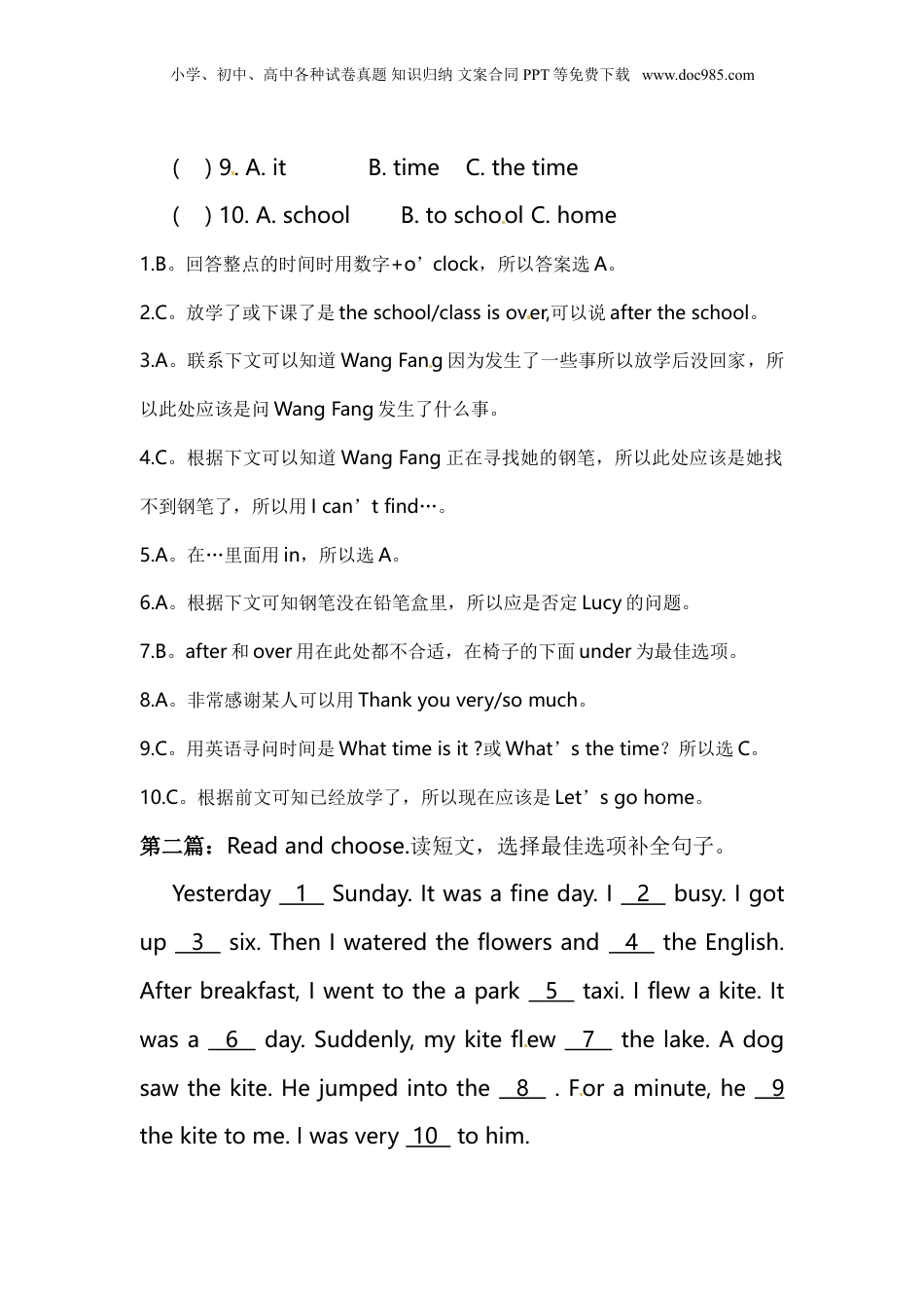 小学、初中、高中各种试卷真题知识归纳文案合同PPT等免费下载www.doc985.com第一篇:Readandchoose.读短文,选择最佳选项补全句子。Nowit’saboutfive1.Theschoolis2.LilyandLucyareleavingschool.ButWangMeiisstillintheclass.Lily:WangMei,what’sthe3?WangMei:Oh,Ican’t4mypencil.Lucy:Isit5yourpencil-box?WangMei:6,mypencil-boxisathome.Lily:Isitontheteacher’sdesk?WangMei:No,Ican’tseeit.Lucy:It’sthere,7LiPing’schair.WangMei:Thankyou8much.What’s9?Lily:Letmesee,oh,it’sfiveo’clock.Lucy:Let’sgo10now.()1.A.timeB.o’clockC.clock()2.A.afterB.closeC.over()3.A.matterB.pencilC.matters[来源:学.科.网Z.X.X.K]()4.A.lookB.seeC.find()5.A.inB.onC.by()6.A.NoB.OKC.Yes()7.A.afterB.underC.over()8.A.veryB.howC.too小学、初中、高中各种试卷真题知识归纳文案合同PPT等免费下载www.doc985.com()9.A.itB.timeC.thetime()10.A.schoolB.toschoolC.home1.B。回答整点的时间时用数字+o’clock,所以答案选A。2.C。放学了或下课了是theschool/classisover,可以说aftertheschool。3.A。联系下文可以知道WangFang因为发生了一些事所以放学后没回家,所以此处应该是问WangFang发生了什么事。4.C。根据下文可以知道WangFang正在寻找她的钢笔,所以此处应该是她找不到钢笔了,所以用Ican’tfind…。5.A。在…里面用in,所以选A。6.A。根据下文可知钢笔没在铅笔盒里,所以应是否定Lucy的问题。7.B。after和over用在此处都不合适,在椅子的下面under为最佳选项。[来源:学科网]8.A。非常感谢某人可以用Thankyouvery/somuch。9.C。用英语寻问时间是Whattimeisit?或What’sthetime?所以选C。10.C。根据前文可知已经放学了,所以现在应该是Let’sgohome。第二篇:Readandchoose.读短文,选择最佳选项补全句子。Yesterday1Sunday.Itwasafineday.I2busy.Igotup3six.ThenIwateredtheflowersand4theEnglish.Afterbreakfast,Iwenttotheapark5taxi.Iflewakite.Itwasa6day.Suddenly,mykiteflew7thelake.Adogsawthekite.Hejumpedintothe8.Foraminute,he9thekitetome.Iwasvery10tohim.小学、初中、高中各种试卷真题知识归纳文案合同PPT等免费下载www.doc985.com()1.A.isB.areC.was()2.A.amB.wasC.were()3.A.onB.atC.in[来源:Z§xx§k.Com]()4.A.readsB.studyC.studied()5.A.inB.onC.by[来源:Zxxk.Com]()6.A.windyB.sunnyC.rainy()7.A.onB.underC.into()8.A.parkB.lakeC.kite()9.A.giveB.returnC.returned()10.A.happyB.gladC.grateful1.C。开头已经点明时间是yesterday,所以此处应该用过去时态,答案为C。2.B。此题同上一题,同时I后的系动词过去时为was。3.B。表示时间的介词是at。4.C。A和B都为一般现在时,此处应该用过去时。5.C。乘某种交通工具用by。6.A。根据下文可知,风筝掉进了水里,由此可见,昨天天气应该是有风的。7.C。飞进湖里,具体到某一地点,用into,根据下文Hejumpedintothelake也可以提取到信息。8.B。风筝掉进了湖里,狗看见了,所以他跳进湖里去捞风筝。9.C。归还某人东西用return…to,同时要考虑到用过去时态,所以选C。10.C。对于狗的这种行为,“我”应该是非常感激的,grateful。[来源:学科网]