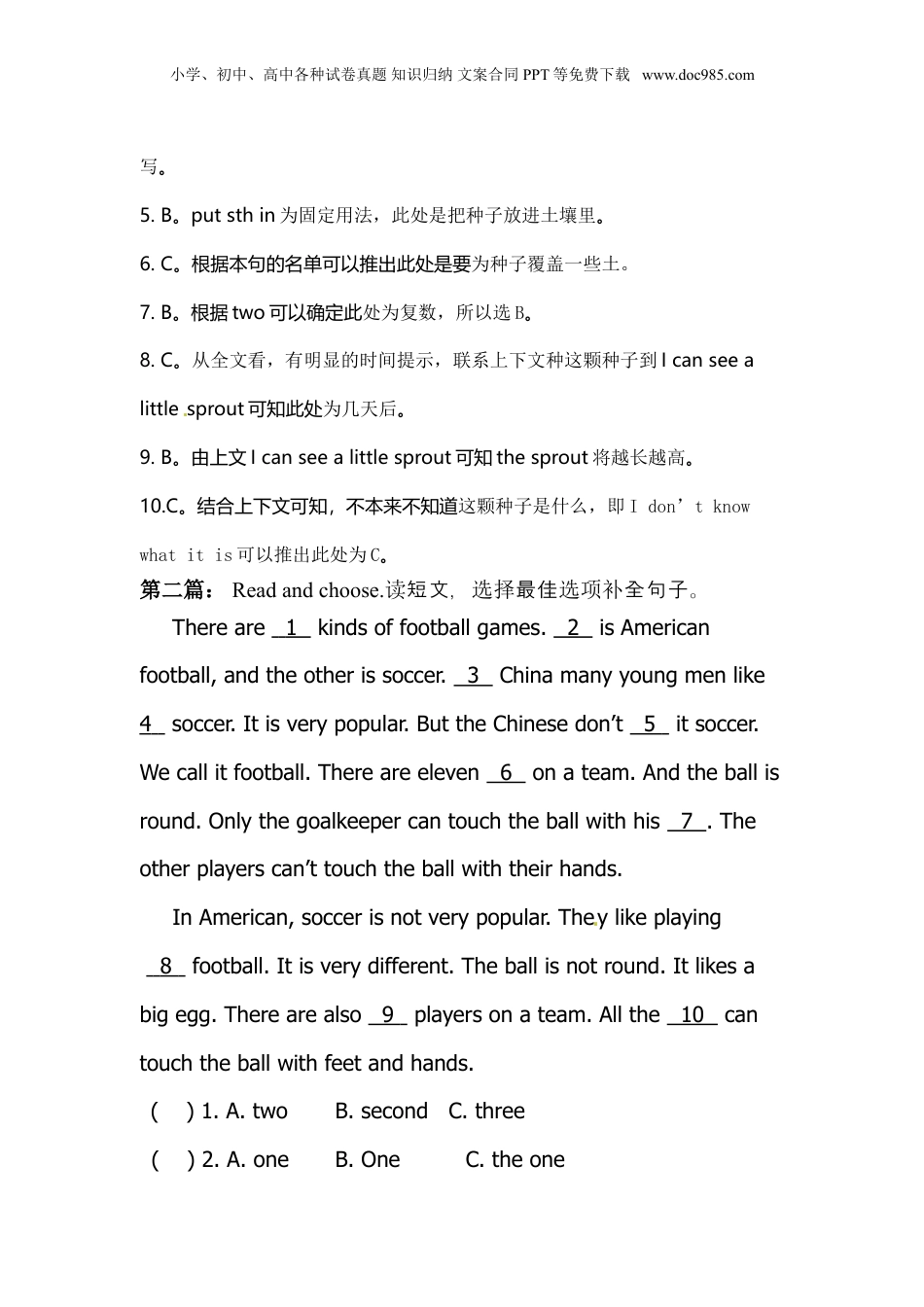 小学、初中、高中各种试卷真题知识归纳文案合同PPT等免费下载www.doc985.com第一篇:Readandchoose.读短文,选择最佳选项补全句子。Ilikeflowersverymuch.NowIhavea1.ButIdon’tknow2itis.SoIdecide3plantitinthegarden.4,Idigthesoil.ThenIputtheseed5thesoilandcovertheseedwith6.Afterthat,Iwateriteverytwo7.Makesureitcangetlotsofsun.Somedays8,Icanseealittlesprout.Iamsoexcited.Thetimeisgoing.Thelittle9becomestallerandtaller.Itwillgrowandgrow.AndIwill10whatitis.()1.A.seedB.seedsC.flowers()2.A.whatB.howC.where()3.A.doB.inC.to()4.A.FirstB.firstC.one[来源:学科网]()5.A.onB.inC.under()6.A.flowerB.plantC.soil()7.A.dayB.daysC.week()8.A.agoB.lateC.later()9.A.seedB.sproutC.flowers()10.A.doB.seedC.know1.A。根据冠词a可以确定此处为单数。2.A。根据下文我要种这颗种子,可以知道此处应该是我不知道它是什么。3.C。decide后面跟todo,所以选C。4.A。根据下文提示词then可以确定此处为firs,考虑到句子首单词,所以要大小学、初中、高中各种试卷真题知识归纳文案合同PPT等免费下载www.doc985.com写。5.B。putsthin为固定用法,此处是把种子放进土壤里。6.C。根据本句的名单可以推出此处是要为种子覆盖一些土。7.B。根据two可以确定此处为复数,所以选B。8.C。从全文看,有明显的时间提示,联系上下文种这颗种子到Icanseealittlesprout可知此处为几天后。9.B。由上文Icanseealittlesprout可知thesprout将越长越高。10.C。结合上下文可知,不本来不知道这颗种子是什么,即Idon’tknowwhatitis可以推出此处为C。[来源:Zxxk.Com]第二篇:Readandchoose.读短文,选择最佳选项补全句子。Thereare1kindsoffootballgames.2isAmericanfootball,andtheotherissoccer.3Chinamanyyoungmenlike4soccer.Itisverypopular.ButtheChinesedon’t5itsoccer.Wecallitfootball.Thereareeleven6onateam.Andtheballisround.Onlythegoalkeepercantouchtheballwithhis7.Theotherplayerscan’ttouchtheballwiththeirhands.InAmerican,soccerisnotverypopular.Theylikeplaying8football.Itisverydifferent.Theballisnotround.Itlikesabigegg.Therearealso9playersonateam.Allthe10cantouchtheballwithfeetandhands.()1.A.twoB.secondC.three()2.A.oneB.OneC.theone[来源:Zxxk.Com]小学、初中、高中各种试卷真题知识归纳文案合同PPT等免费下载www.doc985.com()3.A.withB.inC.In()4.A.playB.playsC.playing()5.A.nameB.callC.calls()6.A.playB.playersC.player()7.A.footB.headC.hands()8.A.americaB.EnglandC.American()9.A.elevenB.tenC.twelve()10.A.teamB.playersC.hands1.A。根据one…theother和下文只介绍了两种足球可知此处为A。2.B。由theother可以推出此处为one,考虑到开头第一个单词首字母大写所以选B。3.C。在哪一个国家用in,同时此处为句中首单词,所以选C。4.C。喜欢做某事为likedoing。5.B。由下文Wecallitfootball可以推出此处为B。[来源:学,科,网]6.B。根据本句句意可以知道一个队里有11名队员。7.C。由下文Theotherplayerscan’ttouchtheballwiththeirhands.可知此处为C。8.C。上文已经介绍了soccer,所以此处要介绍另外一种足球Americanfootball。9.A。由also可以推出此种足球也有11名队员。10.B。由Theotherplayerscan’ttouchtheballwiththeirhands.可以小学、初中、高中各种试卷真题知识归纳文案合同PPT等免费下载www.doc985.com推理出此处为B。[来源:学科网ZXXK]