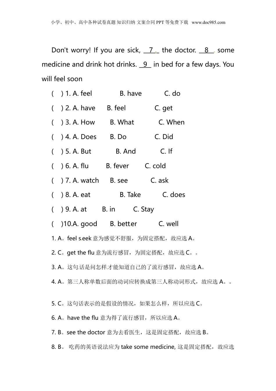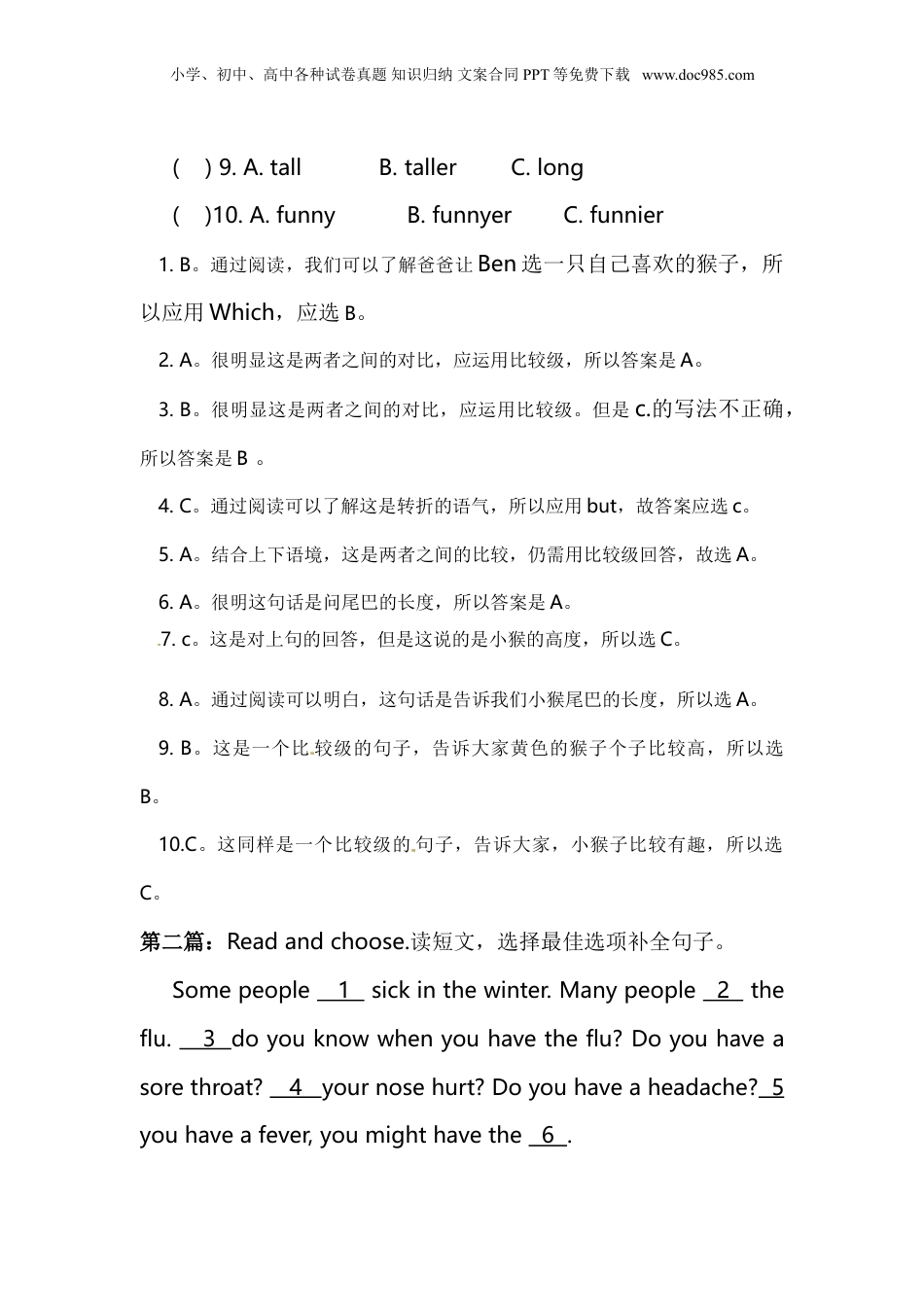 小学、初中、高中各种试卷真题知识归纳文案合同PPT等免费下载www.doc985.com第一篇:Readandchoose.读短文,选择最佳选项补全句子。Dad:1monkeydoyoulike,Ben?Ben:Iliketheyellowone,It’s2thanthebrownone.Dad:Whichmonkeyisstronger?Ben:Thebrownmonkeyis3,4theyellowmonkeyistaller.Dad:Ilikethelittlemonkey.It’s5andfunnier.Ben:How6isitstail?Dad:Ithinkthelittlemonkeyisonly40cm7.Itstailisabout30cm8.Ben:Ithinktheyellowmonkeyis150cmtall.Dad:Theyellowmonkeyis9butthelittlemonkeyis10.()1.A.WhoB.WhichC.What[来源:Z_xx_k.Com]()2.A.tallerB.tallC.long()3.A.strongB.strongerC.strongger()4.A.thenB.andC.but()5.A.youngerB.youngC.old()6.A.longB.longerC.tall()7.A.tallerB.longC.tall()8.A.longB.tallC.longer小学、初中、高中各种试卷真题知识归纳文案合同PPT等免费下载www.doc985.com()9.A.tallB.tallerC.long()10.A.funnyB.funnyerC.funnier1.B。通过阅读,我们可以了解爸爸让Ben选一只自己喜欢的猴子,所以应用Which,应选B。2.A。很明显这是两者之间的对比,应运用比较级,所以答案是A。3.B。很明显这是两者之间的对比,应运用比较级。但是c.的写法不正确,所以答案是B。4.C。通过阅读可以了解这是转折的语气,所以应用but,故答案应选c。5.A。结合上下语境,这是两者之间的比较,仍需用比较级回答,故选A。6.A。很明这句话是问尾巴的长度,所以答案是A。7.c。这是对上句的回答,但是这说的是小猴的高度,所以选C。8.A。通过阅读可以明白,这句话是告诉我们小猴尾巴的长度,所以选A。9.B。这是一个比较级的句子,告诉大家黄色的猴子个子比较高,所以选B。10.C。这同样是一个比较级的句子,告诉大家,小猴子比较有趣,所以选C。第二篇:Readandchoose.读短文,选择最佳选项补全句子。Somepeople1sickinthewinter.Manypeople2theflu.3doyouknowwhenyouhavetheflu?Doyouhaveasorethroat?4yournosehurt?Doyouhaveaheadache?5youhaveafever,youmighthavethe6.小学、初中、高中各种试卷真题知识归纳文案合同PPT等免费下载www.doc985.comDon'tworry!Ifyouaresick,7thedoctor.8somemedicineanddrinkhotdrinks.9inbedforafewdays.Youwillfeelsoon()1.A.feelB.haveC.do()2.A.haveB.feelC.get()3.A.HowB.WhatC.When()4.A.DoesB.DoC.Did()5.A.ButB.AndC.If()6.A.fluB.feverC.cold()7.A.watchB.seeC.ask()8.A.eatB.TakeC.does()9.A.atB.inC.Stay[来源:学&科&网Z&X&X&K]()10.A.goodB.betterC.well1.A。feelseek意为感觉不舒服,为固定搭配,故应选A。2.C。gettheflu意为流行感冒,为固定搭配,故应选C。。3.A。这句话是问怎样才能知道自己的了流行感冒,故应选A。4.A。第三人称单数后面的动词应转换成第三人称动词形式,故应选A。。[来源:学§科§网]5.C。这句话表示的是假设的情况,如果怎么样,所以应选C。6.A。havetheflu意为得了流行感冒,所以应选A。[来源:学+科+网][来源:学科网]7.B。seethedoctor意为去看医生,这是固定搭配,故应选B。8.B。吃药的英语说法应为takesomemedicine,这是固定搭配,故应选小学、初中、高中各种试卷真题知识归纳文案合同PPT等免费下载www.doc985.comB。9.C。stayinbed意为呆在床上别动,多休息几天,最适合此处的说法,所以选C。10.B。本体所考察的是比以前好多了,所以应用比较级,故应选B。