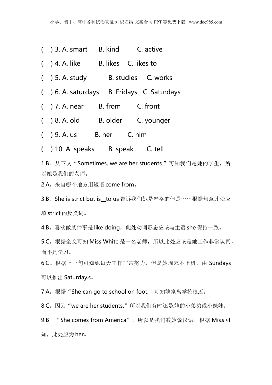 小学、初中、高中各种试卷真题知识归纳文案合同PPT等免费下载www.doc985.com第一篇:Readandchoose.读短文,选择最佳选项补全句子。TodayisSaturday.Saturday1myfavouriteday.Mymothergoestoworkasusual.Butmyfatheris2home.AndI3gotoschool.Ioftendomy4inthemorning,thenIplaycomputergames5anhour.Myfatheroftengoestothepark6themorning.Thenhe7booksathome.Mymothergetshomeatfiveo’clock.Sheoften8manyfoodfromthesuper-market.Thenmyfather,mymotherandI9dinner.Wehaveagood10.()1.A.isB.areC.comes()2.A.onB.inC.at()3.A.don’tB.doesn’tC.do()4.A.houseworkB.homeworkC.study()5.A.forB.inC.at()6.A.onB.inC.at()7.A.readB.readsC.reading()8.A.buysB.buyingC.tobuy()9.A.doB.haveC.has()10.A.timeB.lifeC.dinner[来源:学.科.网]1.A。此处系动词应与主语保持一致。小学、初中、高中各种试卷真题知识归纳文案合同PPT等免费下载www.doc985.com2.C。在家里是beathome,所以答案为C。3.A。根据上文可知今天是星期六,所以是Idon’tgotoschool。4.B。此处应为domyhomework,做我的家庭作业。5.A。此处为时间持续的长短,所以用介词for。6.B。在早上用in。7.B。he为第三人称单数,所以动词时态为与第三人称单数一致的一般现在时。8.A。此题同7题。[来源:学科网ZXXK]9.根据上文可知,妈妈买回许多食物应该是为晚餐做准备,所以接下来是我们一家人吃晚餐,此处动词形式应与I保持一致。[来源:学科网]10.A。此处应为time,意思为我们一家人度过了一个美好的时光。第二篇:Readandchoose.读短文,选择最佳选项补全句子。MissWhiteisourEnglish1.Shecomes2America.She’stallandthin.Sheisstrictbutis3tous.She4dancingandsinging.ShelikesChinesefood,too.She5veryhardeveryday.Butshedoesn’tworkon6andSundays.Herhomeis7ourschool.Shecangotoschoolonfoot.Sometimes,weareherstudents.Sometimes,weareher8brothersorsisters.Weliketoteach9Chinese.Now,shecan10alittleChinese.()1.A.studentB.teacherC.book()2.A.fromB.inC.to[来源:学科网]小学、初中、高中各种试卷真题知识归纳文案合同PPT等免费下载www.doc985.com()3.A.smartB.kindC.active()4.A.likeB.likesC.likesto()5.A.studyB.studiesC.works()6.A.saturdaysB.FridaysC.Saturdays()7.A.nearB.fromC.front()8.A.oldB.olderC.younger()9.A.usB.herC.him()10.A.speaksB.speakC.tell1.B。从下文“Sometimes,weareherstudents.”可知我们是她的学生,所以她是我们的老师。2.A。来自哪个地方用短语comefrom。3.B。Sheisstrictbutistous告诉我们她是严格的但是……根据句意此处应填strict的反义词。4.B。喜欢做某件事是likedoing,此处动词形态应该与主语she保持一致。5.C。根据全文可知MissWhite是一名老师,所以此处应该是她工作非常认真,而不是学习。6.C。根据上一句可知她每天工作非常努力,但是她周末不上班,由Sundays可以推出Saturdays。7.A。根据“Shecangotoschoolonfoot.”可知她家离学校很近。8.C。因为“weareherstudents.”所以我们有时还是她的小弟弟或小妹妹。9.B。“ShecomesfromAmerica”,所以是我们教她说汉语,根据Miss可知,此处应为her。小学、初中、高中各种试卷真题知识归纳文案合同PPT等免费下载www.doc985.com10.B。说某种语言用speak,再考虑到can后跟动词原形,所以选B。[来源:学科网ZXXK]