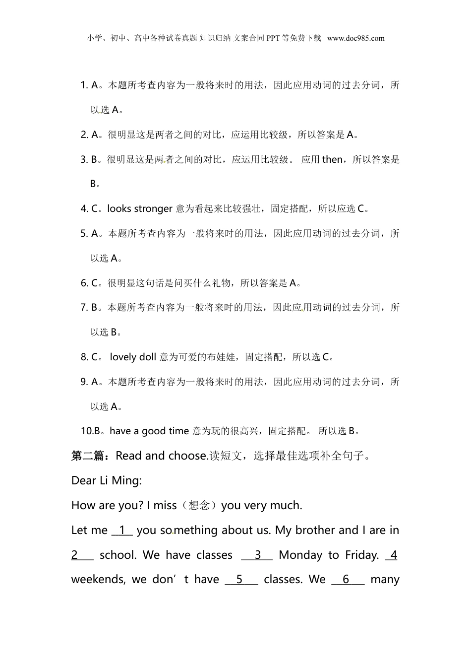 小学、初中、高中各种试卷真题知识归纳文案合同PPT等免费下载www.doc985.com第一篇:Readandchoose.读短文,选择最佳选项补全句子。Lastweekendwe1abirthdaypartyforourclassmateZhangXiaohui.Sheis2thanme,butIamshorter3her.Andshe4stronger.Andsheisheavierthanme.We5toashoptobuyapresentforXiaohui.6didwebuy?We7adollforher.Becauseshetoldme“Ihaven’tgota8doll.”Whenshegotourpresentshelookedexcited.Shewasveryhappy.Wewenttothezoo.Wesawelephants.WewantedtorowaboutinDamingpark,butitwaslater,we9togohome.Wehad10atimeonthatday.()1.A.hadB.haveC.has()2.A.youngerB.youngC.old()3.A.butB.thanC.and()4.A.seeB.lookC.looks()5.A.wentB.goC.goes()6.A.WhoB.WhenC.What()7.A.buyedB.boughtC.buy()8.A.lovesB.loveC.lovely()9.A.hadB.haveC.has()10.A.betterB.goodC.well小学、初中、高中各种试卷真题知识归纳文案合同PPT等免费下载www.doc985.com1.A。本题所考查内容为一般将来时的用法,因此应用动词的过去分词,所以选A。2.A。很明显这是两者之间的对比,应运用比较级,所以答案是A。3.B。很明显这是两者之间的对比,应运用比较级。应用then,所以答案是B。4.C。looksstronger意为看起来比较强壮,固定搭配,所以应选C。5.A。本题所考查内容为一般将来时的用法,因此应用动词的过去分词,所以选A。6.C。很明显这句话是问买什么礼物,所以答案是A。7.B。本题所考查内容为一般将来时的用法,因此应用动词的过去分词,所以选B。8.C。lovelydoll意为可爱的布娃娃,固定搭配,所以选C。9.A。本题所考查内容为一般将来时的用法,因此应用动词的过去分词,所以选A。10.B。haveagoodtime意为玩的很高兴,固定搭配。所以选B。第二篇:Readandchoose.读短文,选择最佳选项补全句子。DearLiMing:Howareyou?Imiss(想念)youverymuch.[来源:Z§xx§k.Com]Letme1yousomethingaboutus.MybrotherandIarein2school.Wehaveclasses3MondaytoFriday.4weekends,wedon’thave5classes.We6many小学、初中、高中各种试卷真题知识归纳文案合同PPT等免费下载www.doc985.comAmericanfriendsnow.Weoftenplaygamestogether(一起)7school.TheyhelpuswithourEnglish.Howmanyclassesdoyou89week?Doyoulikeit?[来源:学科网ZXXK]Please10mesoon.Jenny[来源:学科网ZXXK]()1.A.sayB.speakC.tell()2.A.differentB.sameC.thesame()3.A.fromB.onC.between()4.A.InB.OnC.Between()5.A.someB.manyC.any()6.A.arehavingB.haveC.has()7.A.behindB.afterC.from()8.A.teachB.playC.have()9.A.everyB.theC.an()10.A.speaktoB.tellC.writeto1.C。本题考查内容为tellyousomesth告诉你关于什么的事情,此为固定搭配,所以应选C。[来源:Zxxk.Com][来源:Z|xx|k.Com]2.C。inthesameschool在同一所学校,前面加the表示特定的学校。所以选C。3.A。fromto意为从那一天到那一天,为固定搭配,所以选A。4.B。onweekends为固定搭配,意为在周末。所以选B。小学、初中、高中各种试卷真题知识归纳文案合同PPT等免费下载www.doc985.com5.C。在否定句式中,我们通常会用any来表示一些。所以选C。6.A。此题考查的是现在进行时的用法,bedoingsth故应选A。7.B。afterschool意为放学后,固定搭配用法,所以应选B。8.C。本题所考察的是问句你每周有多少节课?所以应选C。9.A。everycounty指的是每个周末,是固定搭配,所以A。10.C。writetome指的是给我写信,只是写信时常用到的格式。所以应选C。