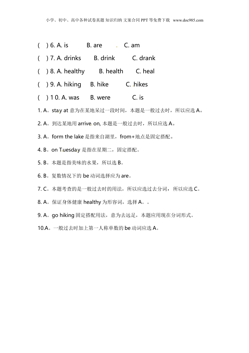 小学、初中、高中各种试卷真题知识归纳文案合同PPT等免费下载www.doc985.com第一篇:Readandchoose.读短文,选择最佳选项补全句子。There1sixfriendsintheGreenWoods.Theyarehappy.Thebirdisthe2.She3songsinthetree.Thedogisanartist.Hedrawspictures4theground.Lookatthemonkey.Heisso5.He6theanimalshappy.Whatdoeshedo?He'san7.Thestreetissoclean.Whoisthecleaner?Thebearis8thefallenleaves.Theparrot(鹦鹉)isareporter.Shereportsnewseveryday.9doestheblackcatdo?Look!Heispatrolling(巡逻)Withhishandgun(手枪)10hismotorcycle.He'sapoliceman.()1.A.isB.amC.are()2.A.singB.singerC.singing()3.A.singsB.singingC.sang()4.A.inB.withC.on()5.A.funnierB.funnyC.fun()6.A.madeB.makesC.make()7.A.actB.actorC.actress()8.A.sweepingB.sweepC.sweeps()9.A.WhenB.WhatC.Who()10.A.inB.byC.on1.C。therebe句型的考察,本题主语为they,所以应选C。[来源:学&科&网Z&X&X&K]小学、初中、高中各种试卷真题知识归纳文案合同PPT等免费下载www.doc985.com2.B。本题指鸟是歌唱家,所以应选名词形式。3.A。本题考查的是第三人称单数形式。4.C。ontheground意为在草地上,为固定搭配。5.B。本题意为他很有趣,所以应选B。6.B。makesbhappy意为使某人快乐,此处应用第三人称单数形式。7.B。本题指他是演员,所以应选名词形式。8.A。本题考查的是现在进行时,所以应选A。9.B。本题意为黑猫在干什么,所以应选B。10.B。bymotorcycle意为骑着摩托车,固定搭配。第二篇:Readandchoose.读短文,选择最佳选项补全句子。We1atabeautifulsmallvillage.We2onMonday,andatesomefreshfish3thelake.4Tuesdaywehadsome5fruit.Grapes6myfavourite.OnWednesdaywetastedsomenewvegetables.OnThursdayI7somecarrotjuice.Itwasfreshand8.OnFridayIwent9withmyfriends.I10veryhappythisholiday.()1.A.stayedB.stayingC.stays()2.A.arrivedB.arrivesC.arriving()3.A.fromB.onC.with()4.A.withB.onC.by()5.A.tastingB.tastyC.taste小学、初中、高中各种试卷真题知识归纳文案合同PPT等免费下载www.doc985.com()6.A.isB.areC.am()7.A.drinksB.drinkC.drank()8.A.healthyB.healthC.heal()9.A.hikingB.hikeC.hikes[来源:学科网]()10.A.wasB.wereC.is1.A。stayat意为在某地呆过一段时间,本题是一般过去时,所以应选A。2.A。到达某地用arriveon,本题是一般过去时,所以应选A。3.A。formthelake是指来自湖里,from+地点是固定搭配。[来源:学,科,网Z,X,X,K]4.B。onTuesday是指在星期二,固定搭配。5.B。本题是指美味的水果,所以选B。6.B。复数情况下的be动词选择应为are。[来源:学科网ZXXK]7.C。本题考查的是一般过去时的用法,所以应选过去分词,所以应选C。8.A。保证身体健康healthy为形容词,选择A。。[来源:学科网ZXXK]9.A。gohiking固定搭配用法,意为去远足,本题应用现在分词形式。10.A。一般过去时加上第一人称单数的be动词应选A。