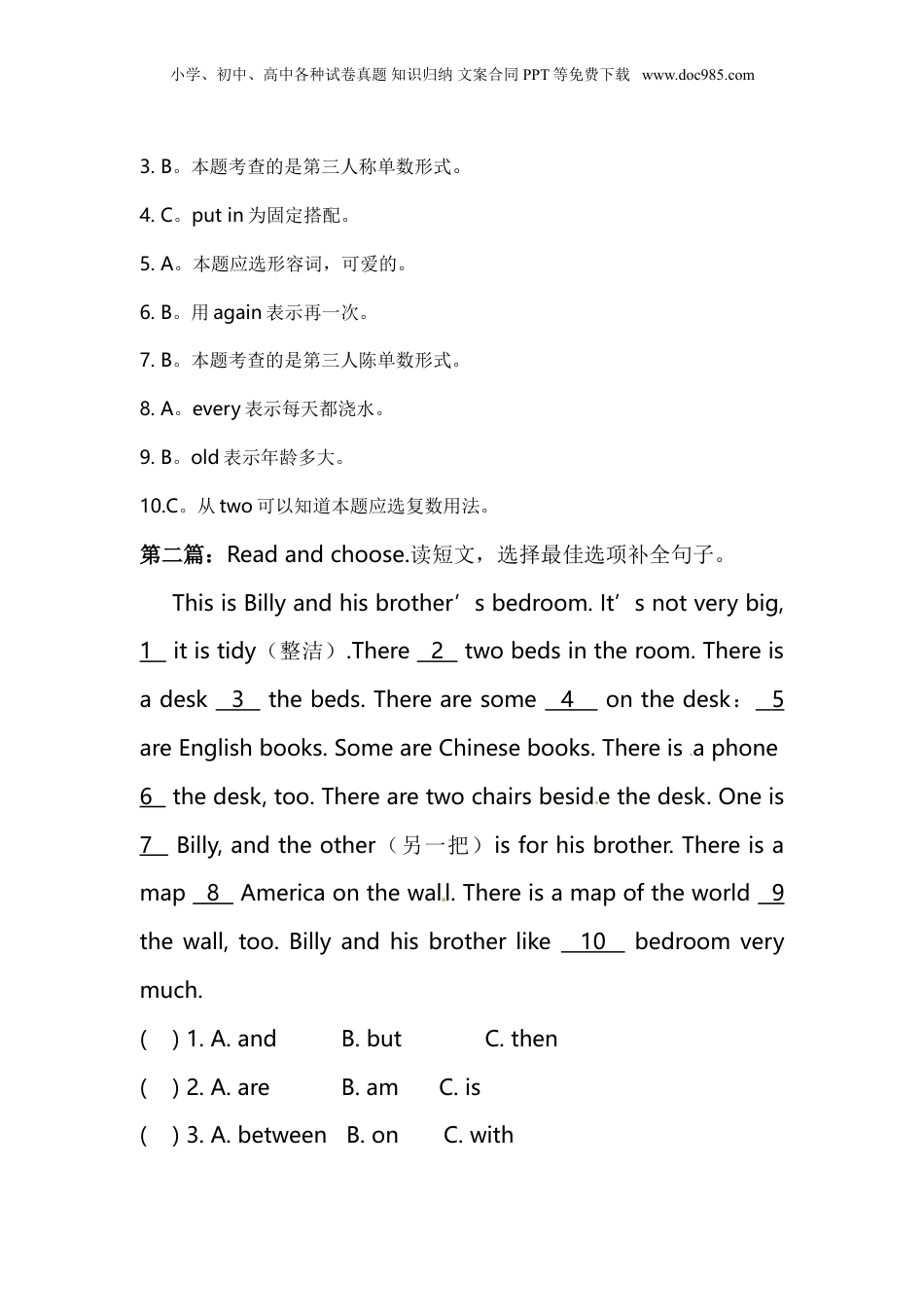 小学、初中、高中各种试卷真题知识归纳文案合同PPT等免费下载www.doc985.com第一篇:Readandchoose.读短文,选择最佳选项补全句子。1doIplantaflower?TodayisMarch3.Iputsomeseeds2apot.ThenI3itand4thepotinthesun.TodayisMarch12.Icanseea5sprout.Iwaterit6.TodayisMarch23.Myplant7someleaves.Iwaterit8.TodayisApril4.Myplantisonemonth9!Wow!Ithastwo10now.()1.A.WhatB.HowC.Who()2.A.inB.toC.into()3.A.putB.waterC.waters()4.A.inB.withC.put[来源:学,科,网Z,X,X,K]()5.A.lovelyB.loveC.loves()6.A.tooB.againC.to()7.A.haveB.hasC.had()8.A.everydayB.everyC.day()9.A.olderB.oldC.year()10.A.leafB.flowerC.flowers1.B。本题意为怎样种花,故应选B。2.C。putinto意为把某物放入什么中,所以应选C。[来源:学科网]小学、初中、高中各种试卷真题知识归纳文案合同PPT等免费下载www.doc985.com3.B。本题考查的是第三人称单数形式。4.C。putin为固定搭配。5.A。本题应选形容词,可爱的。6.B。用again表示再一次。7.B。本题考查的是第三人陈单数形式。8.A。every表示每天都浇水。9.B。old表示年龄多大。10.C。从two可以知道本题应选复数用法。第二篇:Readandchoose.读短文,选择最佳选项补全句子。ThisisBillyandhisbrother’sbedroom.It’snotverybig,1itistidy(整洁).There2twobedsintheroom.Thereisadesk3thebeds.Therearesome4onthedesk:5areEnglishbooks.SomeareChinesebooks.Thereisaphone6thedesk,too.Therearetwochairsbesidethedesk.Oneis7Billy,andtheother(另一把)isforhisbrother.Thereisamap8Americaonthewall.Thereisamapoftheworld9thewall,too.Billyandhisbrotherlike10bedroomverymuch.()1.A.andB.butC.then()2.A.areB.amC.is()3.A.betweenB.onC.with[来源:学科网ZXXK]小学、初中、高中各种试卷真题知识归纳文案合同PPT等免费下载www.doc985.com()4.A.bookB.booksC.newspaper()5.A.OneB.SomeC.Two()6.A.onB.withC.to()7.A.ofB.forC.with()8.A.withB.forC.of()9.A.onB.toC.in()10.A.theyB.theirC.them1.B。本句表达的是转折意思,故选B。2.A。therebe句型表示有某物,本句用的是复数,故选A。3.A。between表示在两物之间,用在此处正好。4.B。本题前面用一些表示,故应选复数。5.B。本题some代之一些书。应在此处正好。6.A。在桌子上用onthedesk表示,固定搭配用法。7.B。for表示是某人的,用在此处表示床是Billy的。8.C。ofAmerica表示美国的,固定搭配用法。[来源:学科网]9.A。onthewall表示在墙上,用在此处正好。[来源:学科网ZXXK]10.B。本题表示他们的,故应选B。