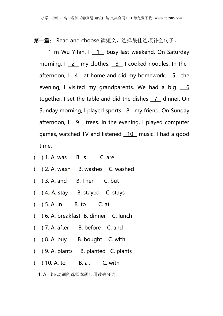 小学、初中、高中各种试卷真题知识归纳文案合同PPT等免费下载www.doc985.com第一篇:Readandchoose.读短文,选择最佳选项补全句子。I’mWuYifan.I1busylastweekend.OnSaturdaymorning,I2myclothes.3Icookednoodles.Intheafternoon,I4athomeanddidmyhomework.5theevening,Ivisitedmygrandparents.Wehadabig6together,Isetthetableanddidthedishes7dinner.OnSundaymorning,Iplayedsports8myfriend.OnSundayafternoon,I9trees.Intheevening,Iplayedcomputergames,watchedTVandlistened10music.Ihadagoodtime.()1.A.wasB.isC.are()2.A.washB.washesC.washed[来源:学科网ZXXK]()3.A.andB.ThenC.but()4.A.stayB.stayedC.stays()5.A.InB.toC.at()6.A.breakfastB.dinnerC.lunch()7.A.afterB.beforeC.and()8.A.buyB.boughtC.with[来源:学+科+网Z+X+X+K]()9.A.plantsB.plantedC.plants()10.A.toB.atC.with1.A。be动词的选择本题应用过去分词。小学、初中、高中各种试卷真题知识归纳文案合同PPT等免费下载www.doc985.com2.C。本题考查的是一般过去时,故应选择过去分词。3.B。本题意为然后我开始做面条,所以A和B都不合适。[来源:学科网ZXXK]4.B。本题考查的是一般过去时,故应选择过去分词。5.A。Intheevening固定搭配,在晚上。6.B。联系上文得知这是在晚上,所以应该是晚饭。7.A。本题意为晚饭结束后,所以应选A。8.B。根据上下文的动词时态可知,应用过去分词。9.B。此题同8题。10.A。listento为固定搭配,听音乐的意思。第二篇:Readandchoose.读短文,选择最佳选项补全句子。Tomisa1boy,andheisonly2sevenold.Onedayhe3tothecinema.Itisthe4timeforhimtodothat.Heboughtaticketandthen5in.Butaftertwoorthreeminuteshe6out,boughtasecondticketandwentin7.Afterafewminuteshecameoutagainandboughtathirdticket.Two8threeminuteslatehecameoutandasked9anotherticket.Thenthegirlintheticketofficeaskedhim,"Whydoyoubuysomanytickets?Howmanyfriendsdoyoumeet?"Tom10,"No,Ihavenofriendhere.Butabigboyalwaysstopsmeatthedoorandtears(撕)mytickettopieces."小学、初中、高中各种试卷真题知识归纳文案合同PPT等免费下载www.doc985.com()1.A.loveB.smallC.little()2.A.yearsB.yearC.over()3.A.goB.wentC.goes()4.A.andB.firstC.find()5.A.wentB.goC.by()6.A.comeB.cameC.comes()7.A.afterB.tooC.again[来源:Zxxk.Com]()8.A.veryB.orC.too()9.A.forB.toC.with()10.A.answerB.answeredC.answers1.C。由后面可知,小孩只有7岁,所以选C最合适。2.A。yearsold意为几岁了,固定搭配。3.B。本题考察的是一般过去时,故应选B。4.B。联系上下文得知,小孩是第一次来电影院。5.A。goin固定搭配,意为进去,此处应选过去分词。6.B。本题考察的是一般过去时,故应选B7.C。再一次应用again表示。8.B。twoorthere意为两三分钟。[来源:Zxxk.Com]9.A。askfor意为要某物,固定搭配。10.B。本题考察的是一般过去时,故应选B。小学、初中、高中各种试卷真题知识归纳文案合同PPT等免费下载www.doc985.com