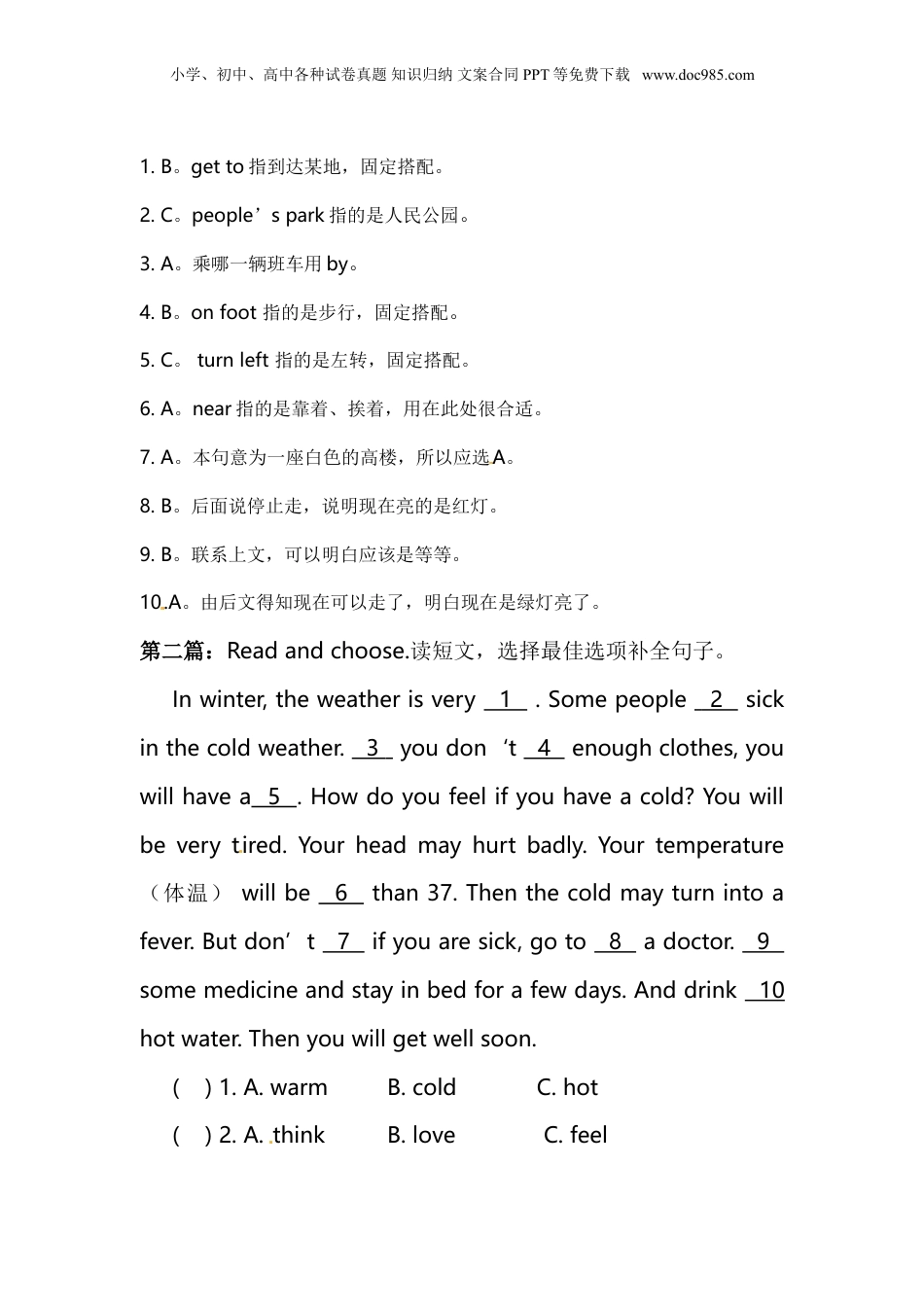 小学、初中、高中各种试卷真题知识归纳文案合同PPT等免费下载www.doc985.com第一篇:Readandchoose.读短文,选择最佳选项补全句子。Zhang:Excuseme,howdowe1tothe2Park?Man:Youcangothere3theNo.5bus,oryoucangoonfoot.Zhang:Howdowego4foot?Man:It’seasy.5leftatthetrafficlights.Theparkis6atalloffice7.John:Thankyouverymuch.Hurryup,ZhangPeng!Zhang:No!Thelightis8.Stop!John:That’sright.Wehaveto9.Zhang:Nowit’s10.Let’sgo!()1.A.gettingB.getC.go()2.A.nearB.PeopleC.People’s()3.A.byB.atC.on()4.A.byB.onC.with()5.A.PlayB.GoC.Turn()6.A.nearB.withC.on()7.A.buildingB.buildingsC.flower()8.A.yellowB.redC.green()9.A.goB.waitC.on()10.A.greenB.yellowC.red小学、初中、高中各种试卷真题知识归纳文案合同PPT等免费下载www.doc985.com1.B。getto指到达某地,固定搭配。2.C。people’spark指的是人民公园。3.A。乘哪一辆班车用by。4.B。onfoot指的是步行,固定搭配。5.C。turnleft指的是左转,固定搭配。6.A。near指的是靠着、挨着,用在此处很合适。[来源:学+科+网]7.A。本句意为一座白色的高楼,所以应选A。8.B。后面说停止走,说明现在亮的是红灯。9.B。联系上文,可以明白应该是等等。[来源:学#科#网Z#X#X#K]10.A。由后文得知现在可以走了,明白现在是绿灯亮了。[来源:学科网ZXXK]第二篇:Readandchoose.读短文,选择最佳选项补全句子。Inwinter,theweatherisvery1.Somepeople2sickinthecoldweather.3youdon‘t4enoughclothes,youwillhavea5.Howdoyoufeelifyouhaveacold?Youwillbeverytired.Yourheadmayhurtbadly.Yourtemperature(体温)willbe6than37.Thenthecoldmayturnintoafever.Butdon’t7ifyouaresick,goto8adoctor.9somemedicineandstayinbedforafewdays.Anddrink10hotwater.Thenyouwillgetwellsoon.[来源:学。科。网Z。X。X。K]()1.A.warmB.coldC.hot()2.A.thinkB.loveC.feel小学、初中、高中各种试卷真题知识归纳文案合同PPT等免费下载www.doc985.com()3.A.butB.IfC.and()4.A.byB.wearC.with()5.A.coldB.hotC.cool()6.A.higherB.highC.good[来源:学科网ZXXK]()7.A.worryB.eatC.drink()8.A.lookB.seeC.watch()9.A.HaveB.eatC.Take()10.A.muchB.moreC.draw1.B。因为是在冬天,所以天气是很冷。2.C。感觉不舒服,应选择用feel。3.B。本句是表示假设,所以应选If4.B。wearclothes固定搭配,穿衣服的意思。5.A。haveacold是指患上感冒,固定搭配。6.A。比37度高,比较级,所以应选A。7.A。don’tworry意为不要害怕,固定搭配用法。8.B。seeadoctor意为看医生,固定搭配用法。9.C。Takemedicine意为吃药,固定搭配用法。10.B。本句意为多喝热水,用more最合适。