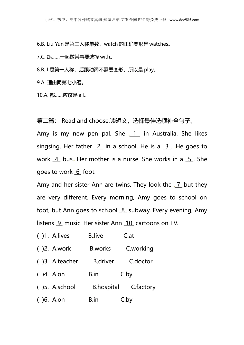 小学、初中、高中各种试卷真题知识归纳文案合同PPT等免费下载www.doc985.com第一篇:Readandchoose.读短文,选择最佳选项补全句子。Onweekends,wedon't1school.Mikeoften2football.ZhangPengoften3hismomdosomehousework.Johnoften4ping-pong.ChenJie5booksathome.LiuYunoften6TV7hisfatherandmotherafterdinner.Ioften8computergames9myfriends.We10likeweekends.()1.A.goB.toC.goto()2.A.playB.playingC.plays()3.A.helpsB.helpC.helping()4.A.playsB.playingC.play()5.A.readB.readesC.reads()6.A.watchsB.watchesC.watch()7.A.andB.byC.with()8.A.playsB.playC.playing()9.A.withB.andC.by()10.A.allB.togetherC.also1.C。gotoschool固定搭配。2.C.Mike是第三人称单数,动词需要变形为plays。3.A.ZhangPeng是第三人称单数,动词help要变成helps。[来源:学,科,网Z,X,X,K]4.A.John是第三人称单数,动词play要变成plays。5.C.ChenJie是第三人称单数,read要变成reads。[来源:学科网ZXXK]小学、初中、高中各种试卷真题知识归纳文案合同PPT等免费下载www.doc985.com6.B.LiuYun是第三人称单数,watch的正确变形是watches。7.C.跟……一起做某事要选择with。8.B.I是第一人称,后跟动词不需要变形,所以是play。9.A.理由同第七小题。10.A.都……应该是all。第二篇:Readandchoose.读短文,选择最佳选项补全句子。Amyismynewpenpal.She1inAustralia.Shelikessingsing.Herfather2inaschool.Heisa3.Hegoestowork4bus.Hermotherisanurse.Sheworksina5.Shegoestowork6foot.AmyandhersisterAnnaretwins.Theylookthe7,buttheyareverydifferent.Everymorning,Amygoestoschoolonfoot,butAnngoestoschool8subway.Everyevening,Amylistens9music.HersisterAnn10cartoonsonTV.()1.A.livesB.liveC.at()2.A.workB.worksC.working[来源:学_科_网Z_X_X_K]()3.A.teacherB.driverC.doctor()4.A.onB.inC.by()5.A.schoolB.hospitalC.factory()6.A.onB.inC.by小学、初中、高中各种试卷真题知识归纳文案合同PPT等免费下载www.doc985.com()7.A.sameB.differentC.equal()8.A.onB.inC.by[来源:学科网ZXXK]()9.A/B.toC.with()10.A.watchB.watchsC.watches1.A.She是第三人称单数,动词live需要变成lives。2.B.Herfather是第三人称单数,动词work要变成works。3.A.联系上文,父亲在学校工作,排除掉司机和医生之后只剩下teacher。4.C.bybus固定搭配。5.B.联系上文母亲是个护士,排除掉工厂和学校,只剩下hospital。6.A.onfoot固定搭配。[来源:学科网ZXXK]7.A.双胞胎应该看起来很像,所以选same。8.C.bysubway固定搭配。9.B.listenstomusic固定搭配。10.C.Ann是第三人称单数,动词watch的正确变形是watches。