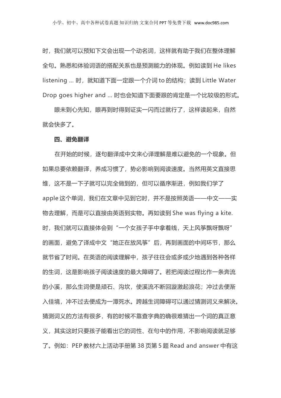 小学、初中、高中各种试卷真题知识归纳文案合同PPT等免费下载www.doc985.com小学生英语阅读理解题型过关技巧指导阅读一是要读得懂,二是要读得快,读而不懂不行,懂而太慢也不行,作为阅读的基本要求,如何才能帮助我们的学生们打好阅读的基础呢?一、培养正确的阅读习惯有许多孩子在长期的学习中往往形成了各种阅读习惯,如一个词一个词地读,且常伴有一些习惯动作:用手指、摆头等,这就是速读的障碍,并且可能影响到孩子一生的阅读。有些不良的习惯会影响到他们正常的阅读,我们应注意纠正他们以下的不良方式:(1)用手指或笔指词阅读;(2)逐词阅读;(3)复读;(4)声读;(5)心译。这些做法的结果往往是降低阅读速度,不利于把注意力集中在作者要表达的思想或传递的信息上。应当指出,孩子在平常的阅读中都会出现个别的、有意识的复视或回视,但过分的回视则会影响阅读的速度乃至对文章有效的理解。二、加强按意群阅读的训练按意群阅读是一种科学的阅读方法。它首先要求把所读的句子尽可能分成意义较完整的组群,目光要尽可能少地停顿。试比较:(1)I/usually/go/to/school/by/bike.(目光停顿7次),(2)Iusually/gotoschool/bybike.(目光停3次)。其中,(1)为逐词读,(2)为按意群读。具体说来,读的时候我们要指导学生,不要把目光停在某一个词上,而应该用两眼余光看这个词两侧的词,眼睛不要盯在字行上,要高一些,这样,映入眼帘的便是词组而不是单个的词;读的时候要少眨眼、不摆头,只要眼球来回转动就可以了;保持坐姿端正,书本应放到眼睛正前方,眼睛与小学、初中、高中各种试卷真题知识归纳文案合同PPT等免费下载www.doc985.com书本距离大约一尺为宜,这样才能保证同一适当距离、同一视角范围内尽可能多地摄入文字信息,正确的读书写字姿势,如下图:关键在于它既不是默读(心读)更不是朗读,而是通过目光在外语与大脑之间建立直接的联系,即外语思维。这是一个简捷快速的过程,非经过大量阅读训练的妙手岂能偶而得之?因此,我们在平常可以教给学生试试以下两个方法:1.快速朗读已经熟悉的课文等文字材料(最好朗读到能够熟练背诵的程度)。通过这种练习,对什么是意群,怎样区分意群,如何把注意力放在一个意群的中心词上,逐步就会有所实际地感受。2.把课文或阅读过的材料按意群分行抄写下来,再用目光扫读,使眼睛习惯于一扫一段。随着阅读的深入,熟练的孩子在阅读过程中能根据自己的阅读目的、阅读内容和文体调整阅读速度,并利用头脑中已有的相关知识,借助尽可能少的文字信息进行选择、推测和推理,必要时还能跳出文段客观地判断作者意图。也就是说一些孩子能过渡到跳读和略读环节。我们必须明确地告诉孩子,跳读和略读的关键是要抓住文章的开头和结尾以及各段的关键词和主题句。主题句可能在各段开头也可能出现在结尾。三、培养语言预测能力所谓语言预测,就是根据词语的搭配习惯以及语法知识(词法和句法),凭借上文,猜测出下文可能出现的内容,达到“未睹先知”的目的。例如,利用词法的搭配习惯,在读到Igotoschoolby...时,我们就能猜到下文要出现一个交通工具的单词;利用句法知识,在我们读到Thankyoufor...小学、初中、高中各种试卷真题知识归纳文案合同PPT等免费下载www.doc985.com时,我们就可以预知下文会出现一个动名词,这样就有助于我们在整体理解全句。熟悉和体验词语的搭配关系也是预测能力的体现。例如读到Helikeslistening...时,就知道下面一定跟一个介词to的结构;读到LittleWaterDropgoeshigherand...时也会知道下面要跟的肯定是一个比较级的形式。眼未到心先知,眼再到时得到证实一闪而过就行了,这样读起来,自然就会快多了。四、避免翻译在开始的时候,逐句翻译成中文来心译理解是难以避免的一个现象。但如果总要依赖翻译,养成习惯了,势必影响到阅读速度。当然用英文直接思维,这不是一下子就可以完全做到的,但可以循序渐进,例如我们学了apple这个单词,我们在文章中见到它时,并不是按照英语——中文——实物去理解,而是可以直接由英语到实物。再如读到Shewasflyingakite.时,我们就可以直接体会到“一个女...