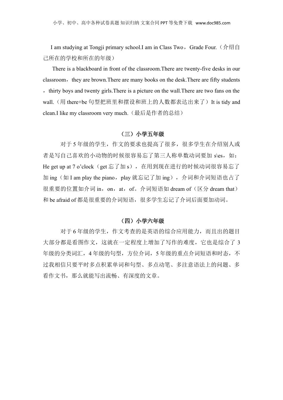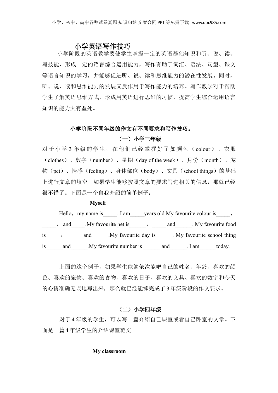 小学、初中、高中各种试卷真题知识归纳文案合同PPT等免费下载www.doc985.com小学英语写作技巧小学阶段的英语教学要使学生掌握一定的英语基础知识和听、说、读、写技能,形成一定的语言综合运用能力,写作有助于词汇、语法、句型、课文等语言知识的学习,并能够促进听、说、读和思维能力的潜在性发展。同时,听、说、读和思维能力的发展又反作用于写作能力的培养。写作教学对于帮助学生了解英语思维方式,形成用英语进行思维的习惯,提高学生综合运用语言知识的能力大有益处。小学阶段不同年级的作文有不同要求和写作技巧。(一)小学三年级对于小学3年级的学生,在他们已经掌握好了如颜色(colour)、衣服(clothes)、数字(number)、星期(dayoftheweek)、月份(month)、宠物(pet)、情感(feeling)、身体部位(body)、文具(schoolthings)的基础上进行文章的填空,如果学生能够按照文章的要求写进相关的信息,那就已经很不错了。下面是一个自我介绍的简单例子:MyselfHello,mynameis_____.Iam_____yearsold.Myfavouritecolouris_____,_____,and_____.Myfavouritepetis______,_____and______.Myfavouritefoodis_____,______and______.Myfavouritedayis______.Myfavouriteschoolthingis______and______.Myfavouritenumberis______and______.Iam______today.上面的这个例子,如果学生能够依次能吧自己的姓名、年龄、喜欢的颜色、喜欢的宠物、喜欢的食物、喜欢的日子、喜欢的文具、喜欢的数字和今天的心情准确无误地写出来,那么就已经能够完成了3年级阶段的作文要求。(二)小学四年级对于4年级的学生,可以写一篇介绍自己课室或者自己卧室的文章。下面是一篇4年级学生的介绍课室范文。Myclassroom小学、初中、高中各种试卷真题知识归纳文案合同PPT等免费下载www.doc985.comIamstudyingatTongjiprimaryschool.IaminClassTwo,GradeFour.(介绍自己所在的学校和所在的年级)Thereisablackboardinfrontoftheclassroom.Therearetwenty-fivedesksinourclassroom,theyarebrown.Therearemanybooksonthedesk.Therearefiftystudents,thirtyboysandtwentygirls.Thereisapictureonthewall.Therearetwofansonthewall.(用there+be句型把班里和摆设和班上的人数都表达出来了)Itistidyandclean.Ilikemyclassroomverymuch.(最后是作者的总结)(三)小学五年级对于5年级的学生,作文的要求也提高了很多,很多学生在介绍别人或者是写自己喜欢的小动物的时候很容易忘了第三人称单数动词要加s\es,如:Hegetupat7o’clock(get忘了加s),在用到现在进行的时候动词很容易忘了加ing(如Iamplaythepiano,play就忘记了加ing),介词和介词短语也占了很重要的位置如介词in,on,at,of。介词短语如dreamof(区分dreamthat)和beafraidof都是很重要的介词短语,很多学生忘记了介词后面要加动词。(四)小学六年级对于6年级的学生,作文考查的是英语的综合应用能力,而且出的题目大部分都是看图作文,这就在一定程度上增加了写作的难度,它也是综合了3年级的分类词汇,4年级的句型,方位介词,5年级的重点介词短语和时态,不过我相信只要平时多点积累单词和句型、多点动笔、多注意语法上的问题、多看作文书,那么就能写出流畅、有深度的文章。