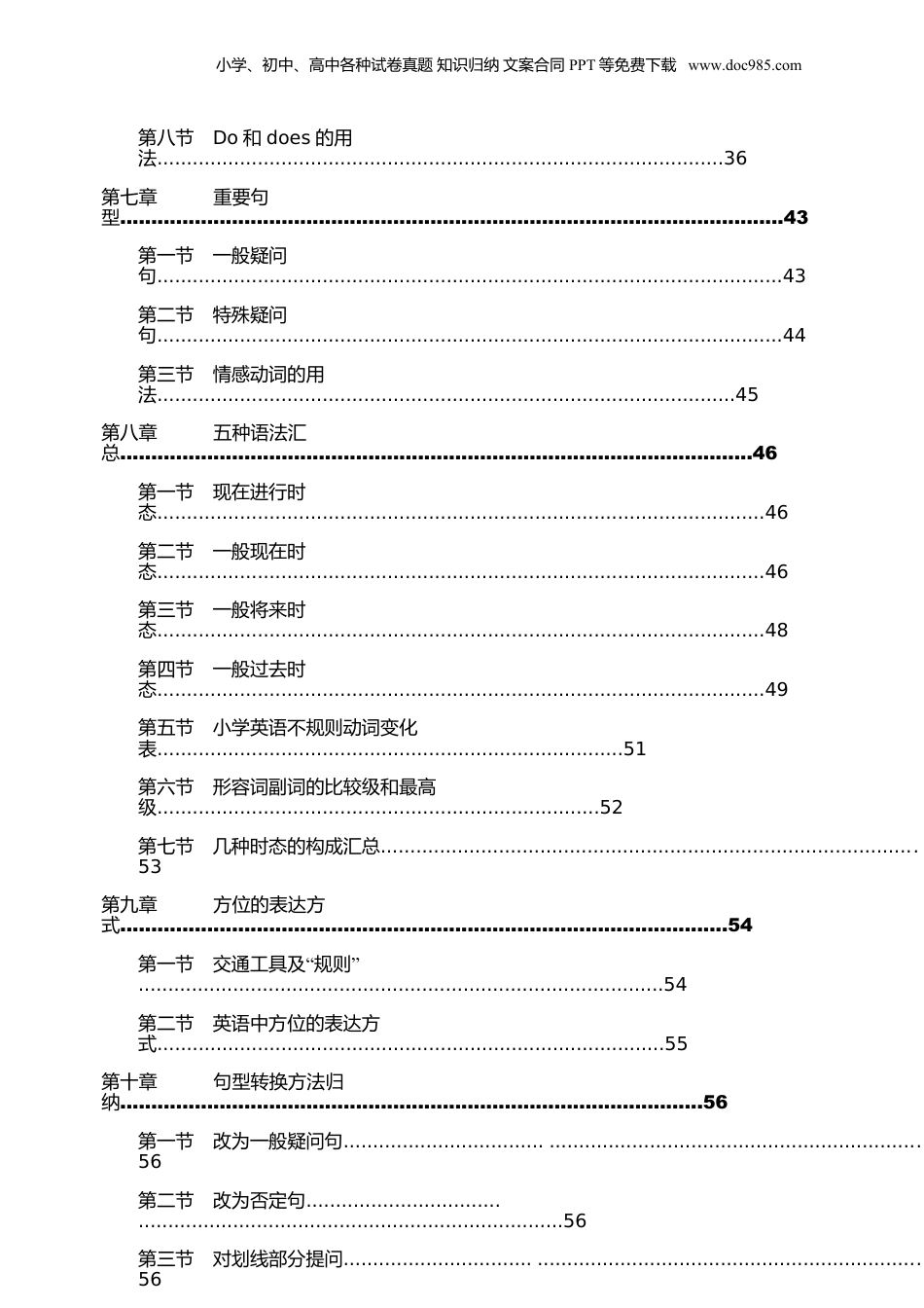 小学、初中、高中各种试卷真题知识归纳文案合同PPT等免费下载www.doc985.com小学英语知识点汇总目录第一章词汇分类集中复习..............................................................................................2第二章常用短语汇总........................................................................................................10第一节动词短语...............................................................................................................10第二节介词短语...............................................................................................................11第三节特殊疑问词..........................................................................................................12第四节缩写词...................................................................................................................12第五节时间词和短语.....................................................................................................12第六节常见介词...............................................................................................................13第七节时间介词at、on、in的用法....................................................................................13第三章日常用语..............................................................................................................13第一节小学生口语100句...............................................................................................14第二节英语日常用语.......................................................................................................15第三节日常用语分类......................................................................................................18第四章主要问句汇总.....................................................................................................20第五章常用词性............................................................................................................23第一节名词.....................................................................................................................23第二节冠词......................................................................................................................28第三节介词......................................................................................................................34小学、初中、高中各种试卷真题知识归纳文案合同PPT等免费下载www.doc985.com第六章常见介词(连接词)的用法.................................................................................38第一节系动词Be的用法.................................................................................................38第二节Do的作用............................................................................................................39第三节介词for的用法.....................................................................................................40第四节With的用法.........................................................................................................40第五节Some与any的用法.............................................................................................41第六节Howmany与howmuch的区别与用法.............................................................42第七节Have和has的用法...............................................................................................4...