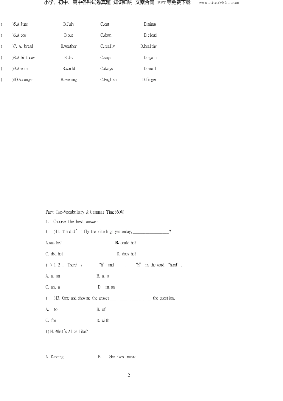 小学、初中、高中各种试卷真题知识归纳文案合同PPT等免费下载www.doc985.com()1.A.palaceB.magicC.ManyD.parent()2.A.cerealB.messyC.reuseD.Protect()3.A.ApnlB.medicmeC.fmallyD.fooUsh()4.A.don,tB.prajectC.welcomeD.honey小升初衔接班精品课程目录学大教育暑期课程入学测评(初一..................................................2第一讲音标元音、辅音................................................................9第二讲词性的讲解一冠词..........................................................23第三讲词性的讲解一形容词、副词.........................................29第四讲词性的讲解一代词.........................................................41.第五讲小学时态的讲解............................................................47第六讲句型的用法(一)..........................................................53第七讲句型的用法(二)..........................................................632016学大教育暑期课程期中测试(初一)....................................69第八讲7AU1Thisisme!知识点讲解.......................................74第九讲一般现在时讲解............................................................81第十讲U2Let’splaysports知识点讲解...................................86第十一一般现在时深度讲解......................................................90第十二讲U3Welcometoourschool讲解.....................................101第十三讲人称代词讲解................................................................111第十四讲U4Myday知识点讲解.....................................................119第十五讲介词的深入讲解........................................................124第十六讲结课总复习.................................................................1322016学大教育暑期课程结课测评(初一)..................................142参考答案...........................................................................................1501小升初衔接班精品课程学大教育暑期课程入学测评(初-)英语试题考试时间:80分钟PartOne-SoundTime(10%)Judgethenumberofthedifferentpronunciations.(A.lB.2C.3D.4)小学、初中、高中各种试卷真题知识归纳文案合同PPT等免费下载www.doc985.com()5.A.JuneB.JulyC.cutD.minus()6.A.cowB.outC.downD.cloud()7.A.breadB.weatherC.reallyD.healthy()8.A.birthdavB.davC.saysD.again()9.A.wormB.worldC.dwaysD.small()lO.A.dangerB.eveningC.EnglishD.fingerPartTwo-Vocabulary&GrammarTime(60%)1.Choosethebestanswer()11.Timdidn’tflythekitehighyesterday,_________________?A.washe?B.couldhe?C.didhe?D.doeshe?()12.There’s_______“h”and_________“n”intheword“hand”.A.a,anB.a,aC.an,aD.an,an()13.Comeandshowmetheanswer____________________thequestion.A.toB.ofC.forD.with()14.-What?sAlicelike?A.DancingB.Shelikesmusic2小学、初中、高中各种试卷真题知识归纳文案合同PPT等免费下载www.doc985.com小升初衔接班精品课程C.SheislikemusicD.Sheisnice()15.---_________isthatbrownshirt?---It’s115yuan.A.HowmuchB.HowmanyC.HowaboutD.Howmoney()16.1don’tlikethat_________book.Ifeel___________.A.bored,boredB.boring,boringC.boring,boredD.bored,boring()17.Whoseisthisnicebedroom?-it’s________________.A.Tim’sandJim’sB.TimandJimC.Tim’sandJimD.TimandJim’s()18.Thesupermarketisn’t________________before9:30onweekdays.A.openB.closingC.openingD.close()19.__________everybody_____________atthebirthdayparty?A.Are,haveagoodtimeB.Does,haveagoodtimeC.Do,havefunD.Will,havingfun()20.There________afootballmatchthisweekend.A.willhaveB.isgoingtohaveC.willb...