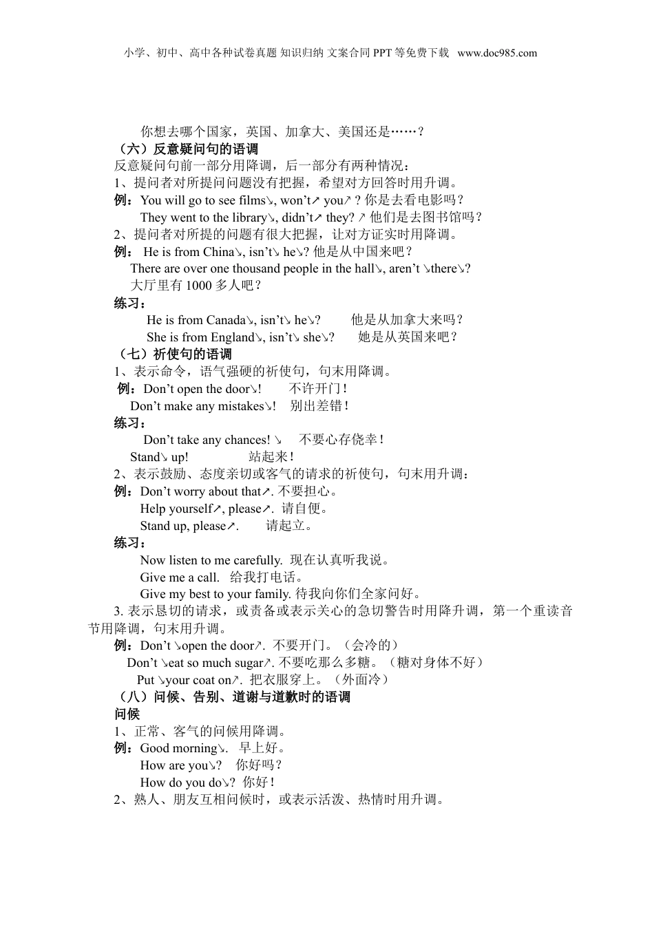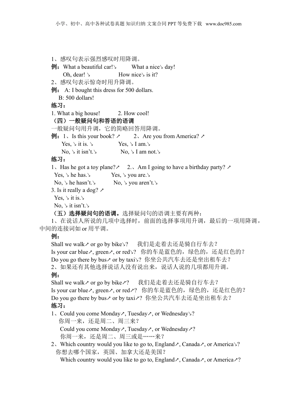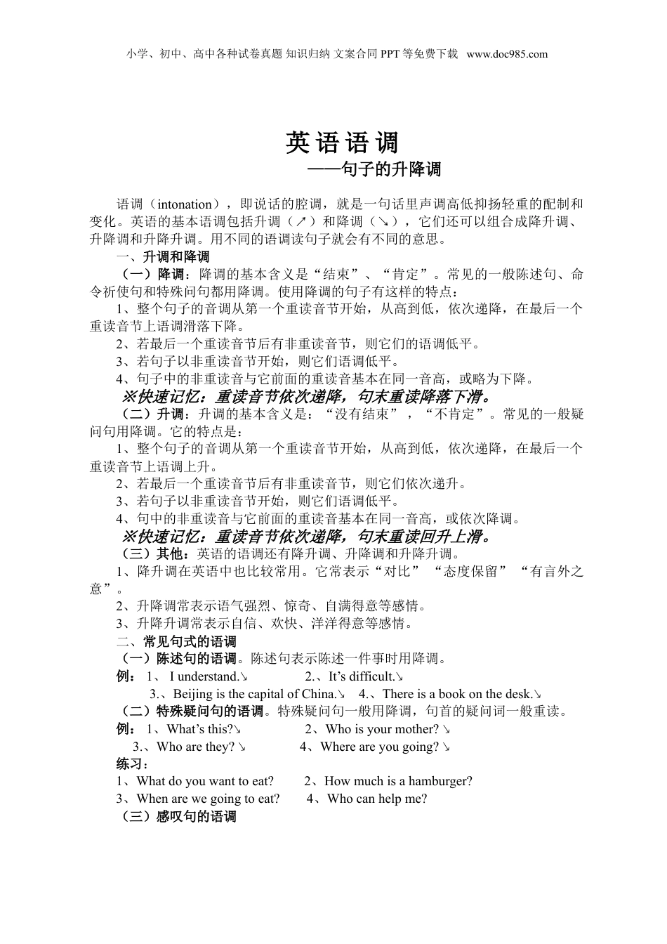 小学、初中、高中各种试卷真题知识归纳文案合同PPT等免费下载www.doc985.com英语语调——句子的升降调语调(intonation),即说话的腔调,就是一句话里声调高低抑扬轻重的配制和变化。英语的基本语调包括升调(↗)和降调(↘),它们还可以组合成降升调、升降调和升降升调。用不同的语调读句子就会有不同的意思。一、升调和降调(一)降调:降调的基本含义是“结束”、“肯定”。常见的一般陈述句、命令祈使句和特殊问句都用降调。使用降调的句子有这样的特点:1、整个句子的音调从第一个重读音节开始,从高到低,依次递降,在最后一个重读音节上语调滑落下降。2、若最后一个重读音节后有非重读音节,则它们的语调低平。3、若句子以非重读音节开始,则它们语调低平。4、句子中的非重读音与它前面的重读音基本在同一音高,或略为下降。※快速记忆:重读音节依次递降,句末重读降落下滑。(二)升调:升调的基本含义是:“没有结束”,“不肯定”。常见的一般疑问句用降调。它的特点是:1、整个句子的音调从第一个重读音节开始,从高到低,依次递降,在最后一个重读音节上语调上升。2、若最后一个重读音节后有非重读音节,则它们依次递升。3、若句子以非重读音节开始,则它们语调低平。4、句中的非重读音与它前面的重读音基本在同一音高,或依次降调。※快速记忆:重读音节依次递降,句末重读回升上滑。(三)其他:英语的语调还有降升调、升降调和升降升调。1、降升调在英语中也比较常用。它常表示“对比”“态度保留”“有言外之意”。2、升降调常表示语气强烈、惊奇、自满得意等感情。3、升降升调常表示自信、欢快、洋洋得意等感情。二、常见句式的语调(一)陈述句的语调。陈述句表示陈述一件事时用降调。例:1、Iunderstand.↘2.、It’sdifficult.↘3.、BeijingisthecapitalofChina.↘4.、Thereisabookonthedesk.↘(二)特殊疑问句的语调。特殊疑问句一般用降调,句首的疑问词一般重读。例:1、What’sthis?↘2、Whoisyourmother?↘3.、Whoarethey?↘4、Whereareyougoing?↘练习:1、Whatdoyouwanttoeat?2、Howmuchisahamburger?3、Whenarewegoingtoeat?4、Whocanhelpme?(三)感叹句的语调小学、初中、高中各种试卷真题知识归纳文案合同PPT等免费下载www.doc985.com1、感叹句表示强烈感叹时用降调。例:Whatabeautifulcar!↘Whatanice↘day!Oh,dear!↘Hownice↘isit?2、感叹句表示惊奇时用升降调。例:A:Iboughtthisdressfor500dollars.B:500dollars!练习:1.Whatabighouse!2.Howcool!(四)一般疑问句和答语的语调一般疑问句用升调,它的简略回答用降调。例:1、Isthisyourbook?↗2、AreyoufromAmerica?↗Yes,↘itis.↘Yes,↘Iam.↘No,↘itisn’t.↘No,↘Iamnot.↘练习:1、Hashegotatoyplane?↗2.、AmIgoingtohaveabirthdayparty?↗Yes,↘hehas.↘Yes,↘youare.↘No,↘hehasn’t.↘No,↘youaren’t.↘3.Isitreallyadog?↗Yes,↘itis.↘No,↘itisn’t.↘(五)选择疑问句的语调。选择疑问句的语调主要有两种:1、在说话人所说的几项中选择时,前面的选择事项用升调,最后的一项用降调,中间的连接词如or用平调。例:Shallwewalk↗orgobybike↘?我们是走着去还是骑自行车去?Isyourcarblue↗,green↗,orred↘?你的车是蓝色的,绿色的,还是红色的?Doyougotherebybus↗orbytaxi↘?你坐公共汽车去还是坐出租车去?2、如果还有其他选择说话人没有说出来,说话人说的几项都用升调。例:Shallwewalk↗orgobybike↗?我们是走着去还是骑自行车去?Isyourcarblue↗,green↗,orred↗?你的车是蓝色的,绿色的,还是红色的?Doyougotherebybus↗orbytaxi↗?你坐公共汽车去还是坐出租车去?练习:1、CouldyoucomeMonday↗,Tuesday↗,orWednesday↘?你周一来,还是周二、周三来?CouldyoucomeMonday↗,Tuesday↗,orWednesday↗?你周一来,还是周二、周三或是……来?2、Whichcountrywouldyouliketogoto,England↗,Canada↗,orAmerica↘?你想去哪个国家,英国、加拿大还是美国?Whichcountrywouldyouliketogoto,England↗,Canada↗,orAmerica↗?小学、初中、高中各种试卷真题知识归纳文案...