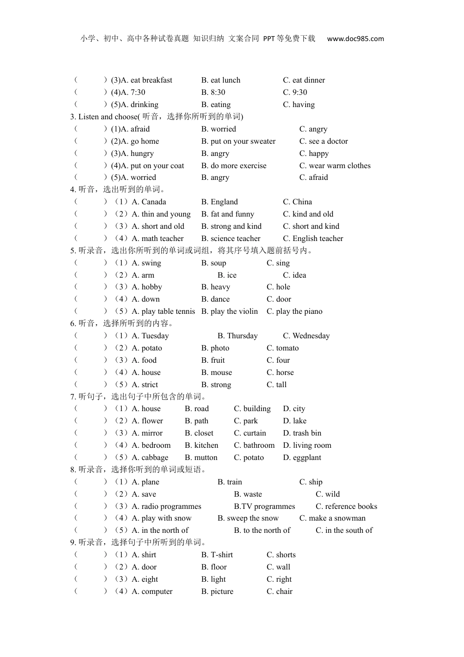小学、初中、高中各种试卷真题知识归纳文案合同PPT等免费下载www.doc985.com专题八听录音,选出句中含有的内容例题例1听句子,选出句中含有的内容。()(1)A.FebruaryB.JanuaryC.April()(2)A.goshoppingB.gofishingC.gorunning()(3)A.widestreetB.whitestreetC.wideriver()(4)A.sunnyandhotB.rainyandwetC.snowyandcold()(5)A.EnglishB.AustralianC.French答案:B;B;A;C;A听力原文:(1)MybirthdayisinJanuary.(2)ShallwegofishingthisSunday?(3)IsthereawidestreetinGuangzhou?(4)ItwillbesnowyandcoldinAmericatomorrow.(5)BenisfromtheUK,heisEnglish.例2听录音,选出你听到的单词或词组。()(1)A.flykitesB.planttreesC.makeasnowman()(2)A.niceB.sweetC.good()(3)A.gohikingB.goshoppingC.gofishing()(4)A.gotobedB.gotoschoolC.gotowork()(5)A.firstB.secondC.third答案:B;B;A;C;A听力原文:(1)—Canyouswim?—NoIcan’t.Icanplanttrees.(2)—What’syourfavouritefood?Ilikecakesbest.—Metoo.Theytastesweet.(3)—Whatdoyoudoontheweekend?—IoftenwatchTV.SometimesIgohiking.(4)Igetupat6:00andgotoworkat7:40.(5)—WhenistheNationalDay?—October1st.习题1.听句子,选出句中含有的信息。()(1)A.themostimportantB.veryimportantC.themostinteresting()(2)A.abluedressB.apurpleskirtC.aorangeshirt()(3)A.playtabletennisB.playbasketballC.playfootball()(4)A.modernbutdirtyB.modernanddirtyC.noisyanddirty()(5)A.inmyhouseB.atschoolC.inthepark2.听录音,选出你听到的单词或词组。()(1)A.springB.summerC.fall()(2)A.MarchB.MayC.April小学、初中、高中各种试卷真题知识归纳文案合同PPT等免费下载www.doc985.com()(3)A.eatbreakfastB.eatlunchC.eatdinner()(4)A.7:30B.8:30C.9:30()(5)A.drinkingB.eatingC.having3.Listenandchoose(听音,选择你所听到的单词)()(1)A.afraidB.worriedC.angry()(2)A.gohomeB.putonyoursweaterC.seeadoctor()(3)A.hungryB.angryC.happy()(4)A.putonyourcoatB.domoreexerciseC.wearwarmclothes()(5)A.worriedB.angryC.afraid4.听音,选出听到的单词。()(1)A.CanadaB.EnglandC.China()(2)A.thinandyoungB.fatandfunnyC.kindandold()(3)A.shortandoldB.strongandkindC.shortandkind()(4)A.mathteacherB.scienceteacherC.Englishteacher5.听录音,选出你所听到的单词或词组,将其序号填入题前括号内。()(1)A.swingB.soupC.sing()(2)A.armB.iceC.idea()(3)A.hobbyB.heavyC.hole()(4)A.downB.danceC.door()(5)A.playtabletennisB.playtheviolinC.playthepiano6.听音,选择所听到的内容。()(1)A.TuesdayB.ThursdayC.Wednesday()(2)A.potatoB.photoC.tomato()(3)A.foodB.fruitC.four()(4)A.houseB.mouseC.horse()(5)A.strictB.strongC.tall7.听句子,选出句子中所包含的单词。()(1)A.houseB.roadC.buildingD.city()(2)A.flowerB.pathC.parkD.lake()(3)A.mirrorB.closetC.curtainD.trashbin()(4)A.bedroomB.kitchenC.bathroomD.livingroom()(5)A.cabbageB.muttonC.potatoD.eggplant8.听录音,选择你听到的单词或短语。()(1)A.planeB.trainC.ship()(2)A.saveB.wasteC.wild()(3)A.radioprogrammesB.TVprogrammesC.referencebooks()(4)A.playwithsnowB.sweepthesnowC.makeasnowman()(5)A.inthenorthofB.tothenorthofC.inthesouthof9.听录音,选择句子中所听到的单词。()(1)A.shirtB.T-shirtC.shorts()(2)A.doorB.floorC.wall()(3)A.eightB.lightC.right()(4)A.computerB.pictureC.chair小学、初中、高中各种试卷真题知识归纳文案合同PPT等免费下载www.doc985.com()(5)A.lockB.clockC.book10.听录音选单词。()(1)A.tailB.tallC.talkD.take()(2)A.watchB.washC.wearD.wish()(3)A.30cmB.13cmC.33cmD.31cm()(4)A.flyB.flewC.friendD.flown()(5)A...