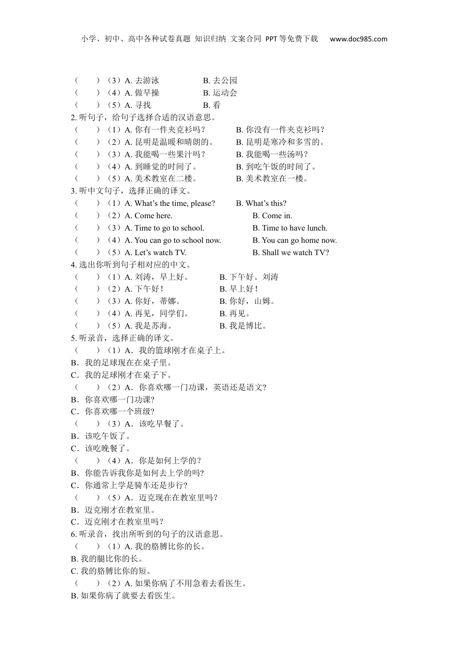 小学、初中、高中各种试卷真题知识归纳文案合同PPT等免费下载www.doc985.com专题四听录音,选择正确的译文例题:例1听句子,给句子选择合适的汉语意思。()(1)A.因为我喜欢寒假。B.因为我喜欢暑假。()(2)A.我可以游泳一天。B.我可以玩一天。()(3)A.我经常和我妈妈一起购物。B.我有时和我妈妈一起购物。()(4)A.你需要一个机器人帮你。B.你需要一个工人帮你。()(5)A.我们一点上课。B.我们一点下课。答案:(1)B;(2)A;(3)B;(4)A;(5)B听力原文:(1)BecauseIlikesummervacation.(2)Icanswimallday.(3)Isometimesgoshoppingwithmymum.(4)Youneedarobottohelpyou.(5)Wefinishclassatoneo’clock.例2听音,根据所给情景选择正确的表达方式。(1)你想知道今天天气是不是很凉爽,你问:()(2)想知道现在几点了,你问:()(3)有人来参观你的学校,你说:()(4)你想问人家有多少个铅笔盒,你问:()(5)你捡到一件衬衫,想知道是谁的,你问:()答案:(1)B;(2)A;(3)A;(4)B;(5)A听力原文:(1)A.What’stheweatherlike?B.Isitcooltoday?(2)A.Whattimeisit?B.Isitoneo’clock?(3)A.Welcometoourschool.B.Myschoolisbeautiful.(4)A.Howmuchisyourpencil-case?B.Howmanypencil-casesdoyouhave?(5)A.Whoseshirtisit?B.What’sthis?习题:1.听录音,选出你所听到的短语的汉语意思。()(1)A.上语文课B.上英语课()(2)A.散步B.上学小学、初中、高中各种试卷真题知识归纳文案合同PPT等免费下载www.doc985.com()(3)A.去游泳B.去公园()(4)A.做早操B.运动会()(5)A.寻找B.看2.听句子,给句子选择合适的汉语意思。()(1)A.你有一件夹克衫吗?B.你没有一件夹克衫吗?()(2)A.昆明是温暖和晴朗的。B.昆明是寒冷和多雪的。()(3)A.我能喝一些果汁吗?B.我能喝一些汤吗?()(4)A.到睡觉的时间了。B.到吃午饭的时间了。()(5)A.美术教室在二楼。B.美术教室在一楼。3.听中文句子,选择正确的译文。()(1)A.What’sthetime,please?B.What’sthis?()(2)A.Comehere.B.Comein.()(3)A.Timetogotoschool.B.Timetohavelunch.()(4)A.Youcangotoschoolnow.B.Youcangohomenow.()(5)A.Let’swatchTV.B.ShallwewatchTV?4.选出你听到句子相对应的中文。()(1)A.刘涛,早上好。B.下午好。刘涛()(2)A.下午好!B.早上好!()(3)A.你好,蒂娜。B.你好,山姆。()(4)A.再见,同学们。B.再见。()(5)A.我是苏海。B.我是博比。5.听录音,选择正确的译文。()(1)A.我的篮球刚才在桌子上。B.我的足球现在在桌子里。C.我的足球刚才在桌子下。()(2)A.你喜欢哪一门功课,英语还是语文?B.你喜欢哪一门功课?C.你喜欢哪一个班级?()(3)A.该吃早餐了。B.该吃午饭了。C.该吃晚餐了。()(4)A.你是如何上学的?B.你能告诉我你是如何去上学的吗?C.你通常上学是骑车还是步行?()(5)A.迈克现在在教室里吗?B.迈克刚才在教室里。C.迈克刚才在教室里吗?6.听录音,找出所听到的句子的汉语意思。()(1)A.我的胳膊比你的长。B.我的腿比你的长。C.我的胳膊比你的短。()(2)A.如果你病了不用急着去看医生。B.如果你病了就要去看医生。小学、初中、高中各种试卷真题知识归纳文案合同PPT等免费下载www.doc985.comC.如果病了就吃点药。()(3)A.妈妈打算给我买条新裙子我很高兴。B.妈妈不打算给我买裙子。C.妈妈给我了买条裙子我很高兴。()(4)A.在上午吴一凡打扫了他的房间,踢了足球。B.在下午吴一凡打扫了房间洗了衣服。C.下午,吴一凡将要洗衣服打扫房间。()(5)A.在星期三,我们打算去唱歌吃美食。B.在星期三,我们唱歌拍照去了。C.在星期三,我们唱歌跳舞去了。7.听录音,选择你所听到的句子的中文意思,把它的字母编号写在前面的括号里。()(1)A.他喜欢运动。()(2)B.他留短黑头发。()(3)C.你有多少支铅笔?()(4)D.让我来擦窗。()(5)E.我们有一间新教室。8.听录音,选择所听到的句子的汉语意思。()(1)A.你爸爸是做什么的?B.你...