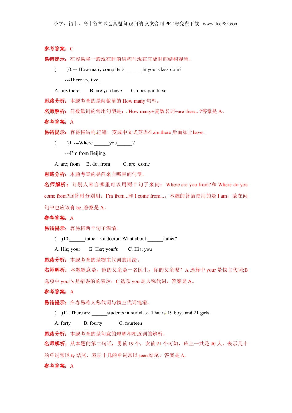 小学、初中、高中各种试卷真题知识归纳文案合同PPT等免费下载www.doc985.com【精品】2016小升初英语完全真题精选卷(解析卷)1(时间80分钟,满分100分)一、单项选择。(30分)()1.Therearetwo______inourschool.A.libraryB.librariesC.librarys思路分析:本题考查的名词的复数形式。名师解析:名词的复数形式一般情况在原形的后面加-s,以辅音字母+y结尾的词要把y变为i再加-es。本题中library以辅音字母+y结尾,复数形式为libraries。答案是B。参考答案:B易错提示:容易将字母r误认为是元音,将复数形式记错。()2.Therearen’t______applesinthebasket,buttherearesomeonthetable.A.someB.anyC.a思路分析:本题考查的是some和any的基本用法。名师解析:Some和any都有一些的意思,some用于肯定句,any用于疑问句和否定句。本题题意是,篮子里没有苹果了,但是桌子上有一些。是否定句,答案是B。[来源:学科网]参考答案:B易错提示:在做本题时容易混淆some和any的用法,要注意本题的关键词aren’t。()3.---Isthereadininghallinyourschool?---_______.A.Yes,thereareB.No,thereisC.Yes,thereis思路分析:本题考查的一般疑问句的答句。名师解析:回答一般疑问句要使用Yes\No。含be的一般疑问句回答时,肯定回答Yes后,将be放在主语后面,否定回答No,将be的否定式放在主语后面。答案是C。参考答案:C题号一二三四五六七得分小学、初中、高中各种试卷真题知识归纳文案合同PPT等免费下载www.doc985.com易错提示:在回答时容易将肯定回答与否定回答混淆。。()4.Look!Mygrandmotheris______mygrandfather.A.ontheleftofB.nextC.onrightof思路分析:本题考查的是方位短语的用法。名师解析:ontheleftof表示在...的左边;next下一个,与to连用时表示紧挨着;onrightof表示在右边,它是泛指在右边,并不具体指在某物或某人的右边。本题题意是,看!我的奶奶在我的爷爷的。根据题意应该选择A。参考答案:A易错提示:容易将短语ontheleftof和onrightof的意思混淆。()5.---Haveyougotadictionary?---______.A.Yes,IdoB.Yes,IgotC.Yes,Ihave思路分析:本题考查的是现在完成时的一般疑问句。名师解析:havegot是现在完成时,它的回答要用:Yes,Ihave./No,Ihaven't.答案是C。参考答案:C易错提示:容易误回答为Yes,Ido。()6.---Whereare______?---Theyareonthechair.A.Tony’sbooksB.Tony’sbookC.Tonybooks思路分析:本题考查的是名词所有格和名词的复数。名师解析:名词的所有格构成一般是在名词后加’s,表示某人的。从本题的问句中使用的are和答句中的Theyare可判断book应该使用复数形式。答案是A。参考答案:A易错提示:容易只考虑名词的所有格而忽略名词的复数形式的,做题时应注意关键词are。()7.He______anyauntsoruncles.A.doesn’thasgotB.haven’tgotC.hasn’tgot思路分析:本题考查的是一般现在时的否定句和现在完成时的否定句的区别。名师解析:本题题意是,他没有姑姑和叔叔。不含be的一般现在时的否定句结构是:主语+don’t\doesn’t+V原形,现在完成时的否定句结构是:主语+haven’t\hasn’t+V过去分词。A选项doesn’t的后面没有使用V的原形,是错误的;B选项中haven’t与主语不匹配;只有C选项是正确的。答案是C。小学、初中、高中各种试卷真题知识归纳文案合同PPT等免费下载www.doc985.com参考答案:C易错提示:在容易将一般现在时的结构与现在完成时的结构混淆。()8.---Howmanycomputers______inyourclassroom?---Therearetwo.A.arethereB.areyouhaveC.doesyouhave思路分析:本题考查的是问数量的Howmany句型。名师解析:问数量词的常用句型是:Howmany+复数名词+arethere...?答案是A。参考答案:A易错提示:容易将结构记错,变成中文式英语在arethere后面加上have。()9.---Where______you______?---I’mfromBeijing.A.are;fromB.do;fromC.are;come思路分析:本题考查的是问来自哪里的句型。名师解析:问别人来自哪里可以用两个句子来问:Whereareyoufrom?和Wheredoyoucomefrom?回答时分别用:I’mfrom...和Icomefrom...。本题的答语使用的是Iam,故在问句中也应该有be,答案是A。参...