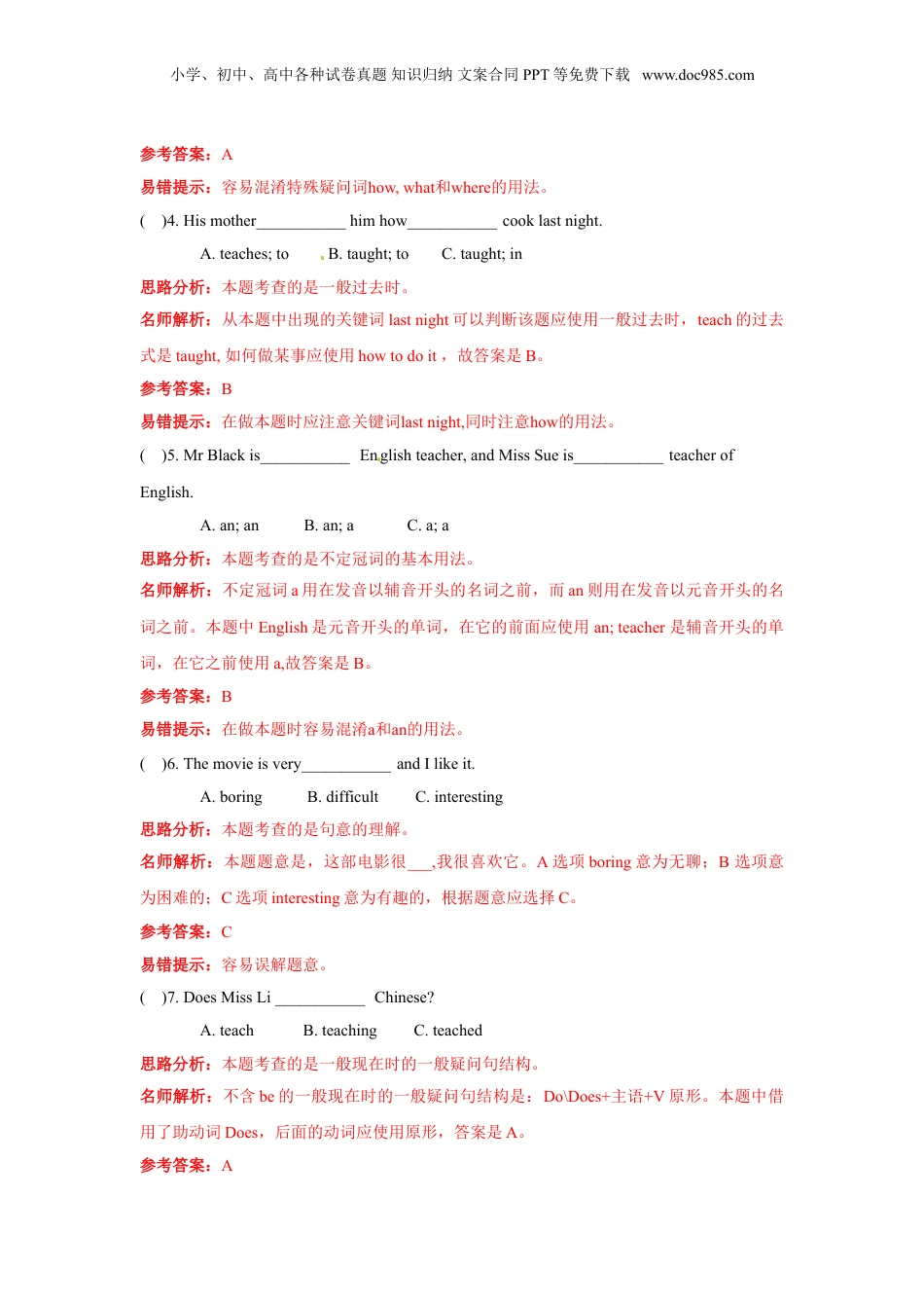 小学、初中、高中各种试卷真题知识归纳文案合同PPT等免费下载www.doc985.com【精品】2016小升初英语完全真题精选卷(解析卷)7(时间80分钟,满分100分)一、找出下列各组单词中画线部分读音与其他三个不同的单词。(10分)思路分析:本题考查的是对单词元音、元音字母组合、辅音及辅音字母组合在单词中发音的不同。在做辨音类型题时,需要了解字母的发音及单词的读音等,根据发音进行判断。名师解析:()1.A.dadB.gradeC.babyD.plane1.本题中,A选项中a发/æ/,B选项中a发/ei/,C选项中a发/ei/,D选项中a发/ei/。因此答案为A。()2.A.lookB.bookC.foodD.Good2.本题中,划线部分为oo字母组合,其发音是有规律可循的:I.重读音节词尾的字母组合oo发音素[u:]的音,如:too(太,也),zoo(动物园),room(房间)等;II.在辅音字母f,l,m,n,s前的字母组合oo也发音素[u:]的音,如:roof(屋顶),school(学校),soon(不久),goose(鹅)等,有一个特例词要特别注意,它就是:wool[u](羊毛);[来源:学科网ZXXK]III.在字母t前的字母组合oo发音素[u:]的音,如:boot(靴子),tooth(牙齿),特例词:foot[u](脚);IV.字母组合oo在字母d和k前发音素[u]的音,如:good(好),book(书),look(看),特例词:food[u:](食物);V.在复合词的非重读音节中的字母组合oo发音素[u]的音,如bedroom(卧室),classroom(教室)等;VI.在字母l和d之间的字母组合oo发音素[∧]的音,如blood(血),flood(洪水)等。因此答案为C。()3.A.waterB.perhapsC.underD.Different3.本题中,A选项中er发/ə/,B选项中er发/ə/,C选项中er发/ə/,D选项中e发/ə/,不是er。因此答案为D。()4.A.theseB.thisC.thanksD.That4.th---有清与浊两种读音:th位于词首时,可以从词性上判别其应有的读音。在名词、动词、形容词和数词中th发清辅音。如:thing,thunder,Thursday,throat,think,题号一二三四五六七得分小学、初中、高中各种试卷真题知识归纳文案合同PPT等免费下载www.doc985.comthank,thirteen等。在代词和一些功能词中th发浊辅音,如:them,their,theirs,there,the,than,then,they。只有介词through是个例外。因此答案为C。5.()5.A.veryB.byC.studyD.Strawberry5.本题中,A选项中y发/ɪ/,B选项中y发/ai/,C选项中y发/ɪ/,D选项中y发/ɪ/,因此答案为B。参考答案:1-5ACDCB易错提示:如果不清楚字母的发音规律,反复读单词,判断字母的在不同单词中的发音。二、单项选择。(20分)()1.Hecleaned___________bedroomlastSunday.A.he'sB.hisC.he思路分析:本题考查的是物主代词和人称代词的区别。名师解析:物主代词是表示所有关系的代词,指物体的主人。人称代词指你、我、他、你们、我们、他们。本题题意是,他上个星期天打扫了他的卧室。根据题意应使用物主代词答案是B。参考答案:B易错提示:在做题时容易混淆物主代词与人称代词。()2.1getup___________aboutsevenfifty-five.A.inB.onC.at思路分析:本题考查的是介词in,on,at的用法。名师解析:in,on和at都表示在...时候。In用于一段较长的时间前,如年月等;on用于具体的某一天;at用于具体的时间点前。本题中7点55分具体到了时间点,应用at,答案是C。[来源:Zxxk.Com]参考答案:C易错提示:在做题时容易混淆in,on,at的用法。()3.—___________didyougothere?—Iwentbybus.A.HowB.WhatC.Where思路分析:本题考查的是特殊疑问词的用法。名师解析:How怎么样,常用于提问方式;What什么,常用于提问事物;Where哪里,常用于提问地点。本题中的答语Iwentbybus.我是坐汽车去的,回答的是出行的方式,故答案是A。小学、初中、高中各种试卷真题知识归纳文案合同PPT等免费下载www.doc985.com参考答案:A易错提示:容易混淆特殊疑问词how,what和where的用法。()4.Hismother___________himhow___________cooklastnight.A.teaches;toB.taught;toC.taught;in思路分析:本题考查的是一般过去时。名师解析:从本题中出现的关键词lastnight可以判断该题应使用一般过去时,teach的过去式是taught,如何做某事应使用howtodoit,故答案是B。参考答案:B易错提示:在做本题时应注意关键词l...