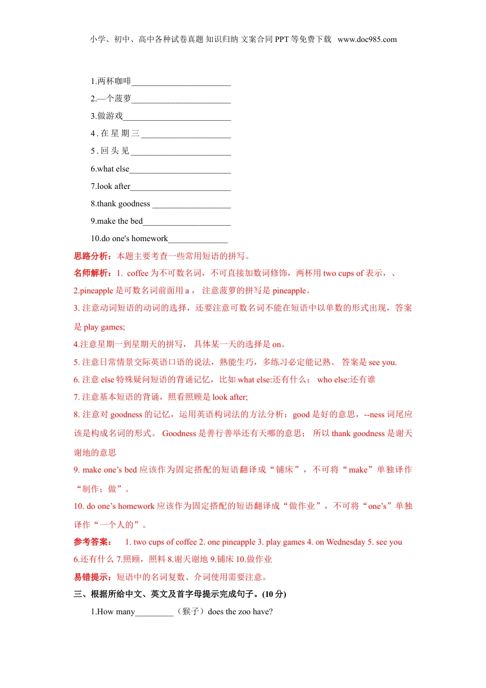 小学、初中、高中各种试卷真题知识归纳文案合同PPT等免费下载www.doc985.com【精品】2016小升初英语招生分班测试卷(解析卷)6(时间80分钟,满分100分)参考答案:―、读单词找出每组中不同类的一项。(10分)思路分析:本题考查的是单词的分类。要做对此题,需要判断清楚所列单词的基本语义。()1.A.fatherB.FamilyC.parentD.grandfather名师解析:四个单词的意思依次是A.父亲B.家庭C.父母D.祖父;外祖父,ACD都是家庭中成员的称呼;只有B.Family家庭的总称。因此,我们选B.Family参考答案:B易错提示:不认识各项项的基本语义,分不清家庭成员和家庭。()2.A.deskB.chairC.tableD.Fork名师解析:四个单词的意思依次是A.书桌B.椅子C.桌子D.叉子ABC都是桌椅有关的家具名字;只有D.Fork是餐具名。因此,我们选D.Fork参考答案:D易错提示:不认识各项项的基本语义,分不清餐具和家具。()3.A.driverB.nurseC.riceD.Salesperson名师解析:四个单词的意思依次是A.司机B.护士C.大米;米饭D.销售员;ABD都是具体的职业称呼;只有C.rice是食物的名字。因此,我们选C.Rice参考答案:C易错提示:不认识各项项的基本语义,分不清职业和食物。()4.A.yellowB.greenC.purpleD.Color名师解析:四个单词的意思依次是A.黄色的B.绿色的C.紫色的D.颜色;ABC都是具体的颜色名字;只有D.是颜色的总称。因此,我们选D.color参考答案:D易错提示:不认识各项项的基本语义,分不清具体颜色和颜色总称。()5.A.farmerB.horseC.cowD.Sheep名师解析:四个单词的意思依次是A.农民B.马C.奶牛题号一二三四五六七得分小学、初中、高中各种试卷真题知识归纳文案合同PPT等免费下载www.doc985.comD.绵羊;BCD都是具体的动物名字;只有A.farmer是职业的种类。因此,我们选A.farmer参考答案:A易错提示:不认识各项项的基本语义,分不清职业和动物的。()6.A.waterB.jumpC.runD.Climb名师解析:四个单词的意思依次是A.水B.跳C.跑D.爬;BCD都是具体的动作名称;只有A.water是具体的物质。因此,我们选A.water参考答案:A易错提示:不认识各项项的基本语义,分不清动作名称和具体的物质()7.A.longerB.tallerC.tiredD.Stronger名师解析:四个单词的意思依次是A.更长B.更高C.累D.更强;ACD都是形容词的比较级;只有C.tired是形容词的原型。因此,我们选C.tired参考答案:C易错提示:不认识各项项的基本语义,分不清形容词比较级和形容词的原型()8.A.teethB.longC.feetD.Arm名师解析:四个单词的意思依次是A.牙齿B.长的C.脚D.手臂;ACD都是身体部位的名称;只有B.long是形容词长的。因此,我们选B.long参考答案:B易错提示:不认识各项项的基本语义,分不清身体部位和长的()9.A.headB.handC.tallerD.Leg名师解析:四个单词的意思依次是A.头B.手C.更高的D.腿ABD都是身体部位的名称;只有C.taller是形容词长的。因此,我们选C.taller参考答案:C易错提示:不认识各项项的基本语义,分不清身体部位和更高的()10.A.bigB.oldC.tallD.How名师解析:四个单词的意思依次是A.大的B.老的C.高的D.怎么样ABC都是...的,是形容词词性;只有D.是特殊疑问词how因此,我们选D.how参考答案:D易错提示:不认识各项项的基本语义,分不清形容词和特殊疑问词二、中英文互译。(20分)小学、初中、高中各种试卷真题知识归纳文案合同PPT等免费下载www.doc985.com1.两杯咖啡________________________2.—个菠萝________________________3.做游戏__________________________4.在星期三_____________________5.回头见________________________6.whatelse________________________7.lookafter________________________8.thankgoodness___________________9.makethebed_____________________10.doone'shomework______________思路分析:本题主要考查一些常用短语的拼写。名师解析:1.coffee为不可数名词,不可直接加数词修饰,两杯用twocupsof表示,、2.pineapple是可数名词前面用a,注意菠萝的拼写是pineapple。3.注意动词短语的动词的选择,还要注意可数名词不能在短语中以单数的形式出现,答案是playgames;4.注意星期一到星期天的拼写,具体某一天的选择...