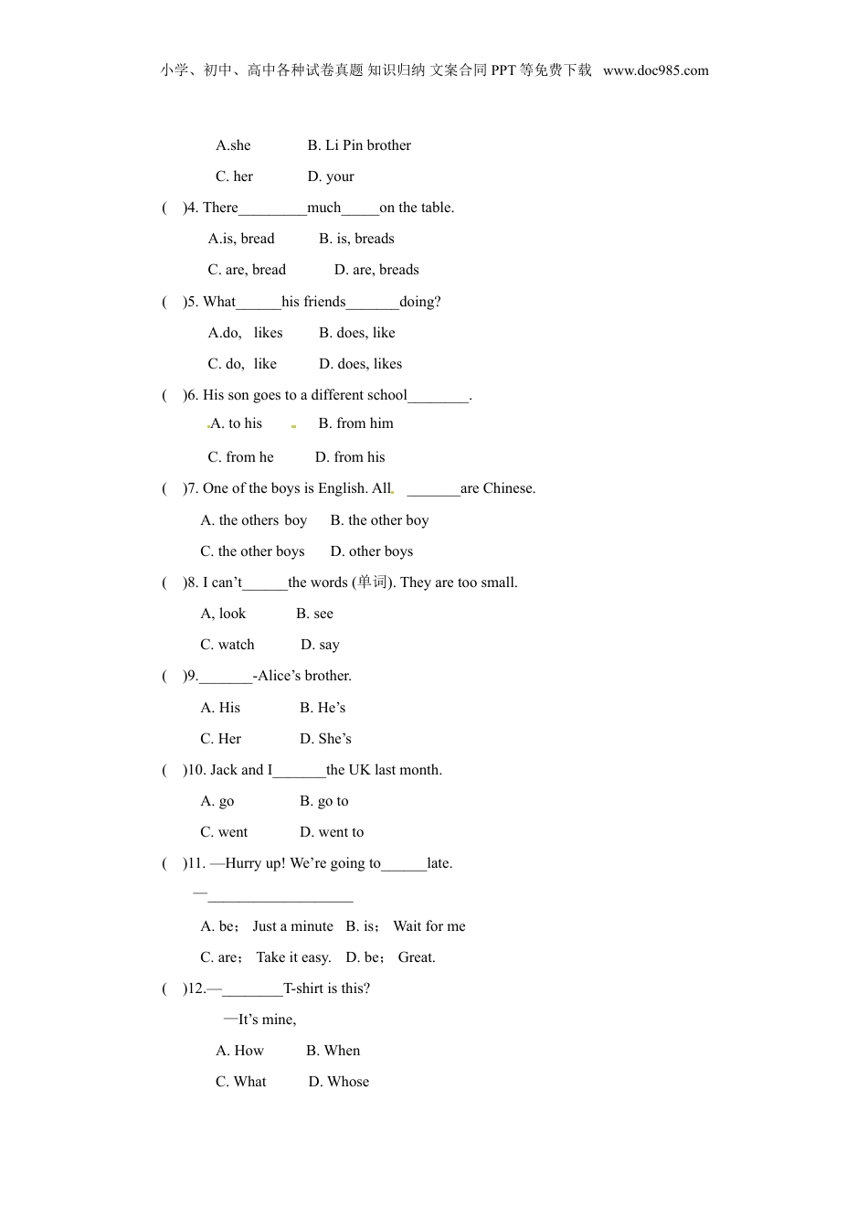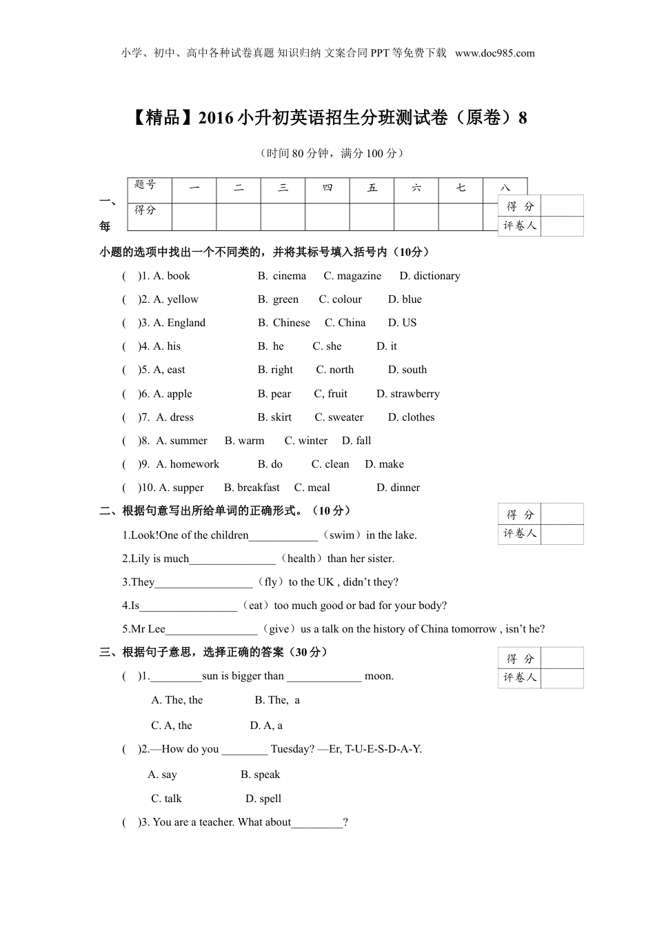 小学、初中、高中各种试卷真题知识归纳文案合同PPT等免费下载www.doc985.com【精品】2016小升初英语招生分班测试卷(原卷)8(时间80分钟,满分100分)一、在每个小题的选项中找出一个不同类的,并将其标号填入括号内(10分)()1.A.bookB.cinemaC.magazineD.dictionary()2.A.yellowB.greenC.colourD.blue()3.A.EnglandB.ChineseC.ChinaD.US()4.A.hisB.heC.sheD.it()5.A,eastB.rightC.northD.south()6.A.appleB.pearC,fruitD.strawberry()7.A.dressB.skirtC.sweaterD.clothes()8.A.summerB.warmC.winterD.fall()9.A.homeworkB.doC.cleanD.make()10.A.supperB.breakfastC.mealD.dinner[来源:学科网]二、根据句意写出所给单词的正确形式。(10分)1.Look!Oneofthechildren____________(swim)inthelake.2.Lilyismuch_______________(health)thanhersister.3.They_________________(fly)totheUK,didn’tthey?4.Is_________________(eat)toomuchgoodorbadforyourbody?5.MrLee________________(give)usatalkonthehistoryofChinatomorrow,isn’the?三、根据句子意思,选择正确的答案(30分)()1._________sunisbiggerthan_____________moon.A.The,theB.The,aC.A,theD.A,a()2.—Howdoyou________Tuesday?—Er,T-U-E-S-D-A-Y.A.sayB.speakC.talkD.spell()3.Youareateacher.Whatabout_________?题号一二三四五六七八得分得分评卷人得分评卷人得分评卷人小学、初中、高中各种试卷真题知识归纳文案合同PPT等免费下载www.doc985.comA.sheB.LiPinbrotherC.herD.your()4.There_________much_____onthetable.A.is,breadB.is,breadsC.are,breadD.are,breads()5.What______hisfriends_______doing?A.do,likesB.does,likeC.do,likeD.does,likes()6.Hissongoestoadifferentschool________.A.tohisB.fromhimC.fromheD.fromhis()7.OneoftheboysisEnglish.All_______areChinese.A.theothersboyB.theotherboyC.theotherboysD.otherboys()8.Ican’t______thewords(单词).Theyaretoosmall.A,lookB.seeC.watchD.say()9._______-Alice’sbrother.A.HisB.He’sC.HerD.She’s()10.JackandI_______theUKlastmonth.A.goB.gotoC.wentD.wentto()11.—Hurryup!We’regoingto______late.[来源:学科网]—___________________A.be;JustaminuteB.is;WaitformeC.are;Takeiteasy.D.be;Great.()12.—________T-shirtisthis?—It’smine,A.HowB.WhenC.WhatD.Whose小学、初中、高中各种试卷真题知识归纳文案合同PPT等免费下载www.doc985.com()13.—_______areyoudoingnow?—I’m_____TVinthelivingroom.A.What;watchtheB.What;watchC.What;watchingD.How;watching()14.Wouldyoulike_______?A.someteaB.anycoffeeC.someteasD.anycoffes()15.I'mgoingtoHainanshipnextweek.A.onB.inC.byD.for四、连词成句(10分)1.friend,teaches,me,My,to,sing________________________________________________2.be,want,one,a,day,teacher,I,to________________________________________________3.yourself,tell,something,me,about,Will,you________________________________________________4.is,your,food,favourite.What________________________________________________5.collecting,likes.He,stamps________________________________________________五、补全对话(10分)(在水果店,A和B两人正在买水果……)A:Oh,so1applesandbananas!B:I’dlike2apples.3isit?Salesgirl:3yuan.4doyouwant?B:2pounds,please.Salesgirl:OK,hereyouare.B:5.A:Haveyougot6oranges?Salesgirl:Of7.Lookhere.得分评卷人得分评卷人小学、初中、高中各种试卷真题知识归纳文案合同PPT等免费下载www.doc985.comA:Oh,hownice!8isit?Salesgirl:2yuanand5jiao.9doyouwanttobuy?A:5pounds,please.Salesgirl:10.[来源:学科网ZXXK]A:Thankyouverymuch.Salesgirl:You’rewelcome,1.______2._______3._______4._______5._______6._______7._______8._______10._______六、句型转换。按要求完成句子。(10分)1.Shedoesherhomeworkint...