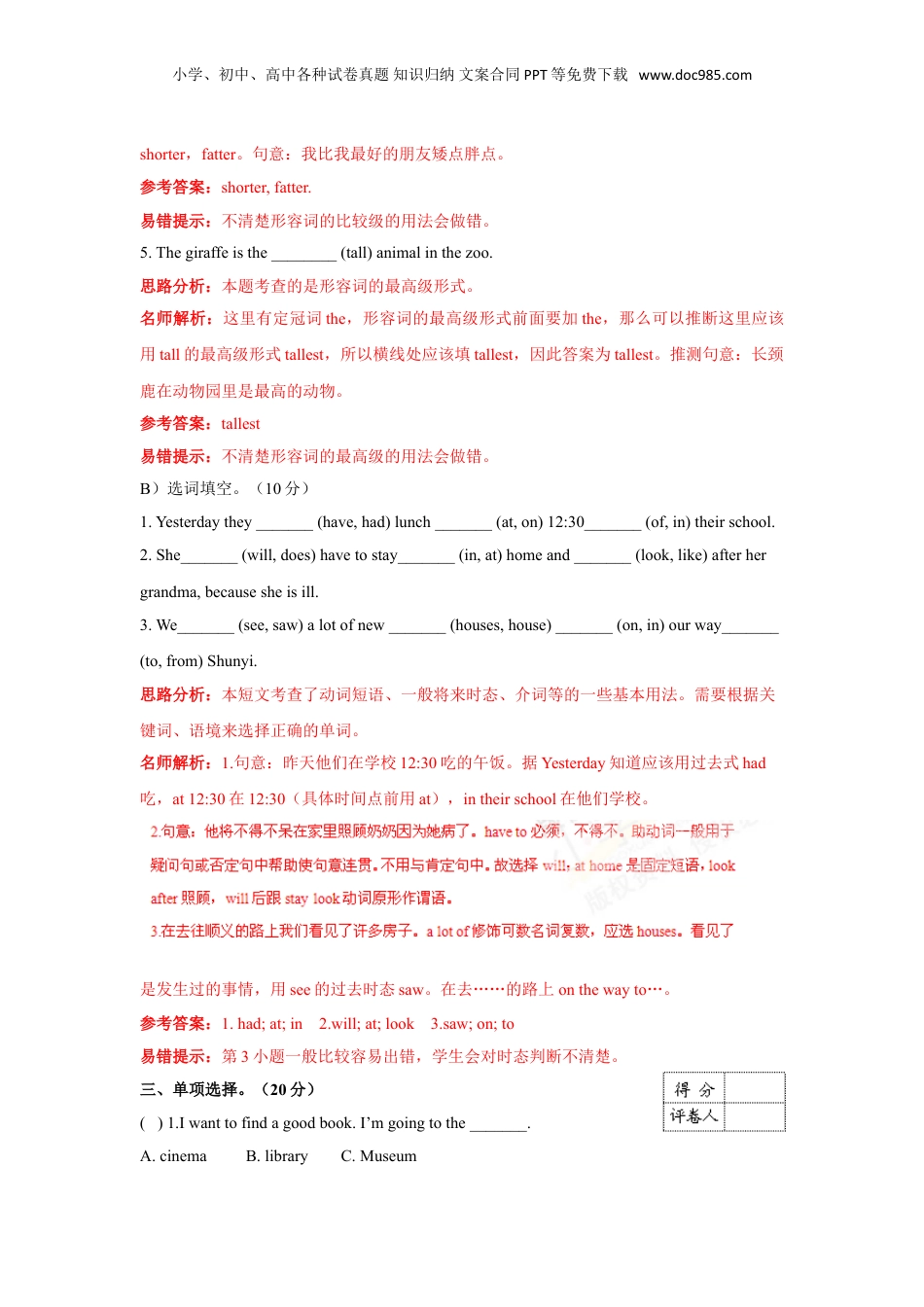 小学、初中、高中各种试卷真题知识归纳文案合同PPT等免费下载www.doc985.com2017小升初英语名校招生预测卷8(解析版)(时间90分钟,满分100分)一、语音知识。(5分)找出画线部分读音与其他三个不同的单词。()1.A.bookB.lookC.foodD.good()2.A.thinB.thatC.fatherD.brother()3.A.cakeB.clockC.faceD.cat()4.A.earB.pearC.hearD.tear()5.A.heB.penC.eggD.desk思路分析:本题考查的是单词的发音,其中有三个发音一样,一个发音与这三个不一样,要做对此题,需要清楚每个单词划线部分的发音。名师解析:1.我们来看一下oo的发音情况:在重读音节词尾的字母组合oo发/u:/的音;在辅音字母f,l,m,n,s前的字母组合oo也发/u:/的音;在字母t前的字母组合oo发/u:/的音;在字母d和k前发短音/u/的音;在复合词的非重读音节中的字母组合oo发短音/u/;在字母l和d之间的字母组合oo发短音/u/.那么根据发音规则我们可以知道四个选项的发音分别是A.符合在k前发音是短音即book/u/B.符合在k前发音是短音即look/u/。C.符合在d前发音是短音,需要说明一下food这个单词是特例,发长音即food/u:/。D.符合在d前发音是短音即good/u/。因此答案为C。2.A.thin/θ/B.that/ð/C.father/ð/D.brother/ð/,因此答案为A。3.A.cake/k/B.clock/k/C.face/s/D.cat/k/,因此答案为C。4.A.ear/ɪə/B.pear/eə/C.hear/ɪə/D.tear/ɪə/,因此答案为B。5.A.he/i/B.pen/e/C.egg/e/D.desk/e/,因此答案为A。参考答案:CACBA易错提示:第1个小题容易出错,不知道food是发长音的特例的话会做错,一定要注意oo字母组合的发音规律。题号[]一二三四五六七得分小学、初中、高中各种试卷真题知识归纳文案合同PPT等免费下载www.doc985.com二、词汇运用。(20分)A)用所给词的正确形式填空。(10分)1.I________________(see)afilmwithmybestfriendnextSunday.思路分析:本题考查的是一般将来时态。参考答案:willsee易错提示:注意这里给出了两个空格,不能填amgoingtosee。2.—Canyou________(fly)akite?—Ofcourse.思路分析:本题考查的是can的一般疑问句。名师解析:推测句意:——你会放风筝吗?——当然。can是情态动词,句子里的动词用原形,所以横线处应该填fly,因此答案为fly。参考答案:fly易错提示:不清楚can的用法会做错。3.—WhatshouldIdo?—Youmust________(open)thewindowand________(air)theroom.思路分析:本题考查的是情态动词。名师解析:做此题时要注意到air这个单词。and前后两个成分是并列的。整个句子只有一个主语you。具有并列的谓语和宾语。openthewindow是一个动宾短语。则air这个单词在此处应该是动词词性,air有空气的意思,此处是动词给……通风的意思。推测句意:——我应该怎么做?——你必须打开窗户让房间通通风。情态动词后面跟动词原形,所以横线处应该填open,air。参考答案:open;air易错提示:此处需要知道air具有动词词性。4.Iam________(short)and________(fat)thanmybestfriend.思路分析:本题考查的是形容词的比较级形式。名师解析:当词语than(比)出现时,前面的形容词应该用比较级形式。这里应该用short和fat的比较级形式shorter和fatter,所以横线处应该填shorter,fatter。因此答案为小学、初中、高中各种试卷真题知识归纳文案合同PPT等免费下载www.doc985.comshorter,fatter。句意:我比我最好的朋友矮点胖点。参考答案:shorter,fatter.易错提示:不清楚形容词的比较级的用法会做错。5.Thegiraffeisthe________(tall)animalinthezoo.思路分析:本题考查的是形容词的最高级形式。名师解析:这里有定冠词the,形容词的最高级形式前面要加the,那么可以推断这里应该用tall的最高级形式tallest,所以横线处应该填tallest,因此答案为tallest。推测句意:长颈鹿在动物园里是最高的动物。参考答案:tallest易错提示:不清楚形容词的最高级的用法会做错。B)选词填空。(10分)1.Yesterdaythey_______(have,had)lunch_______(at,on)12:30_______(of,in)theirschool.2.She_______(will,does)havetostay_______(in,at)homeand_______(look,like)afterhergrandma,becausesheisill.3.We...