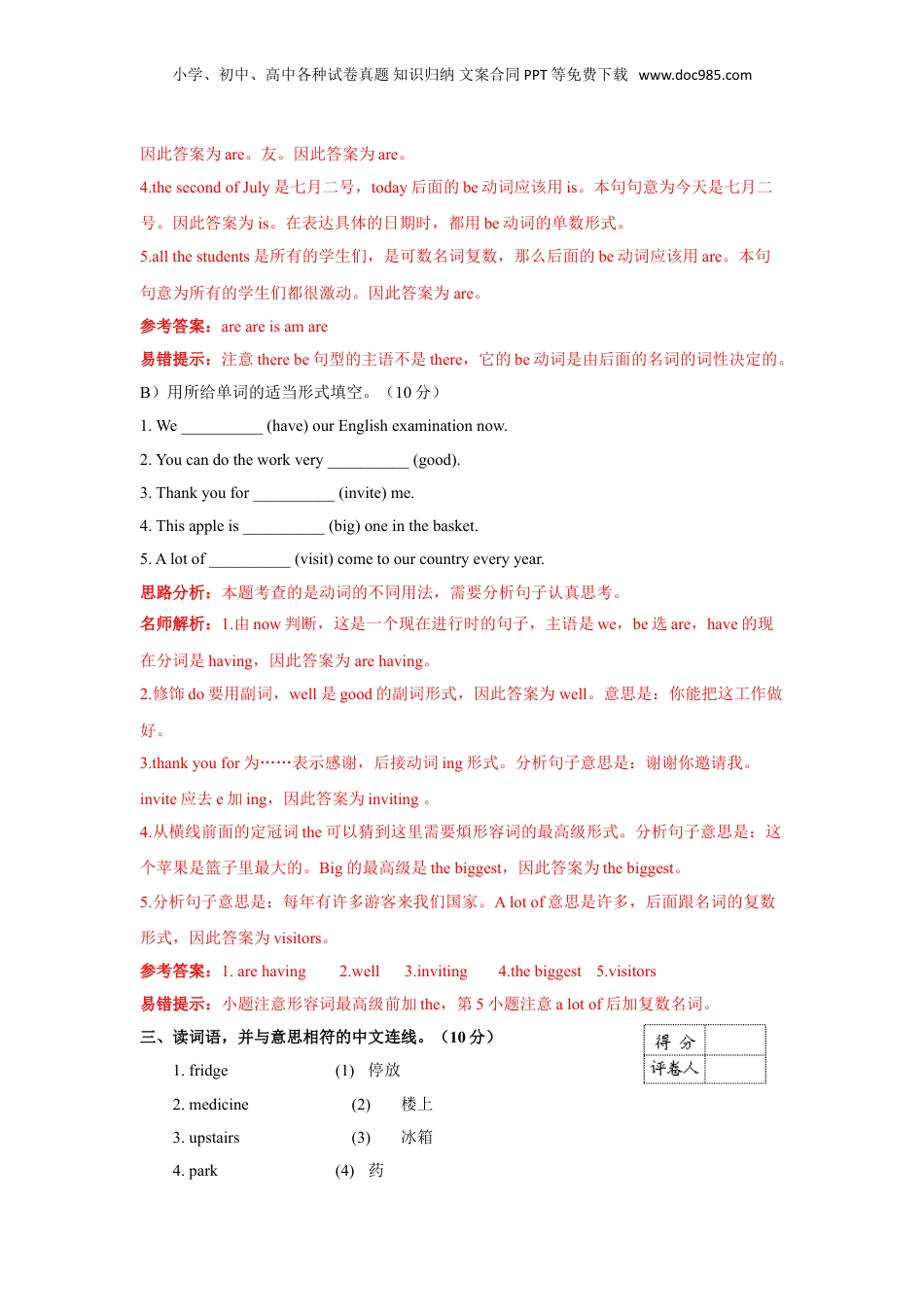 小学、初中、高中各种试卷真题知识归纳文案合同PPT等免费下载www.doc985.com2017小升初英语名校招生预测卷9(解析版)(时间90分钟,满分100分)一、语音知识。(10分)A)找出与例词画线部分发音相同的单词。()1.pearA.nearB.bearC.dear()2.firstA.herB.tigerC.brother()3.downA.blowB.brownC.know()4.meanA.readB.headC.bread()5.shootA.footB.cookC.balloon思路分析:本题考查的是字母组合的发音规则。名师解析:1.pear中ear组合发/eə/,选项A、C画线部分的发/ɪə/,选项B的画线部分发/eə/,故答案为:B。2.first中ir组合发/ɜ:/,选项B、C画线部分的发/ə/,选项A的画线部分发/ɜ:/,故答案为:A。3.down中ow组合发/aʊ/,选项A、C画线部分的发/əʊ/,选项B的画线部分发/aʊ/,故答案为:B。4.mean中ea组合发/i:/,选项B、C画线部分的发/e/,选项A的画线部分发/i:/,故答案为:A。5.shoot中oo组合发/u:/,选项A、B画线部分的发/ʊ/,选项C的画线部分发/u:/,故答案为:C。参考答案:1.B2.A3.B4.A5.C易错提示:相同的字母组合,不同的发音相互混淆。B)看单词画线部分的读音,圈出不属于每个家庭的成员。(5分)题号[]一二三四五六七得分小学、初中、高中各种试卷真题知识归纳文案合同PPT等免费下载www.doc985.com思路分析:本题主要考查一些字母组合的读音,做题关键是要能准确读出单词。名师解析:1.所给单词horse中or的发音是/ɔ:/;law中aw的发音是/ɔ:/;wait中ai的发音是/eɪ/;ball中al的发音是/ɔ:/。2.所给单词house中ou的发音是/aʊ/;loud中ou的发音是/aʊ/;now中ow的发音是/aʊ/;know中ow的发音是/əʊ/。3.所给单词boat中oa的发音是/əʊ/;home中o的发音是/əʊ/;room中oo的发音是/u:/;cold中o的发音是/əʊ/。4.所给单词boil中oi的发音是/ɔɪ/;say中ay的发音是/eɪ/;joy中oy的发音是/ɔɪ/;soy中oy的发音是/ɔɪ/。5.所给单词air中air的发音是/eə/;spare中are的发音是/eə/;care中are的发音是/eə/;park中ar的发音是/ɑ:/。参考答案:1.wait2.know3.room4.say5.park易错提示:学生误认为her中的er发/ɪə/。故选错。二、词汇运用。(15分)A)用be动词的适当形式填空。(5分)()1.I________anEnglishteachernow.()2.HelenandNancy________goodfriends.()3.Look,there________lotsofsheepthere.()4.Today________thesecondofJuly.()5.Allthestudents________veryexcited.思路分析:分析句子意思,横线处需要填一个be动词。名师解析:1.now是一般现在时,be动词都用一般现在时时态。anEnglishteacher是一名英语老师,那么be动词应该用am。本句句意为我现在是一名英语老师。因此答案为am。2.HelenandNancy是两个人,那么后面的be动词应该用are。本句句意为海伦和南希是好朋友。3.therebe句型表示有的意思,它的be动词的形式由后面的名词的单复数形式决定。lotsofsheep是许多只羊,那么there后面的be动词应该用are。本句句意为看,那儿有许多只羊。小学、初中、高中各种试卷真题知识归纳文案合同PPT等免费下载www.doc985.com因此答案为are。友。因此答案为are。4.thesecondofJuly是七月二号,today后面的be动词应该用is。本句句意为今天是七月二号。因此答案为is。在表达具体的日期时,都用be动词的单数形式。5.allthestudents是所有的学生们,是可数名词复数,那么后面的be动词应该用are。本句句意为所有的学生们都很激动。因此答案为are。参考答案:areareisamare易错提示:注意therebe句型的主语不是there,它的be动词是由后面的名词的词性决定的。B)用所给单词的适当形式填空。(10分)1.We__________(have)ourEnglishexaminationnow.2.Youcandotheworkvery__________(good).3.Thankyoufor__________(invite)me.4.Thisappleis__________(big)oneinthebasket.5.Alotof__________(visit)cometoourcountryeveryyear.思路分析:本题考查的是动词的不同用法,需要分析句子认真思考。名师解析:1.由now判断,这是一个现在进行时的句子,主语是we,be选are,have的现在分词是having,因此答案为arehaving。2.修饰do要用副词,well是good的副词形式,因...