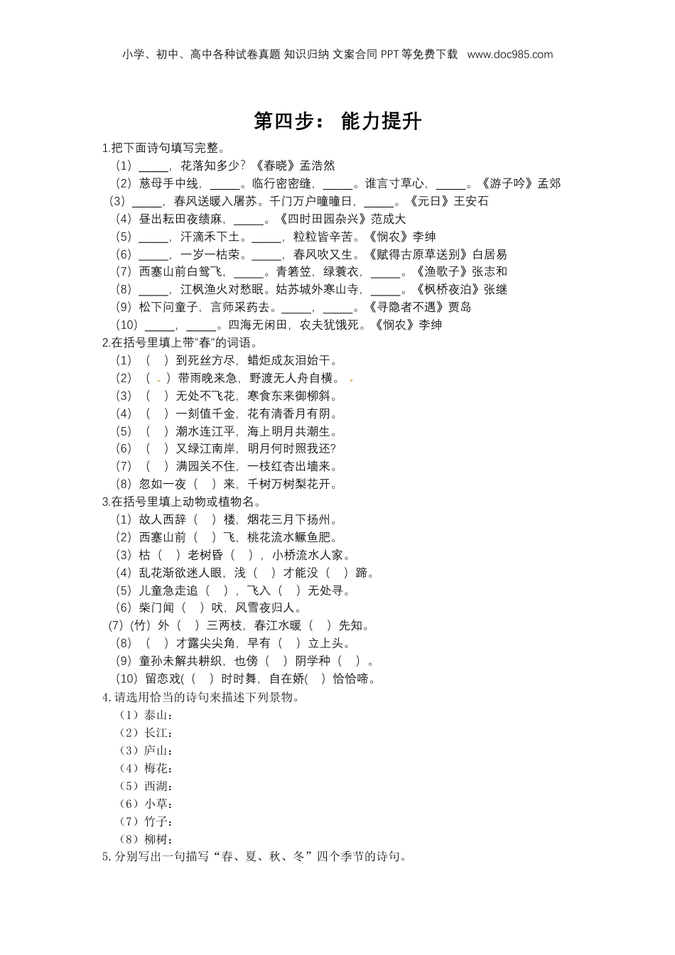 小学、初中、高中各种试卷真题知识归纳文案合同PPT等免费下载www.doc985.com第四步:能力提升1.把下面诗句填写完整。(1),花落知多少?《春晓》孟浩然(2)慈母手中线,。临行密密缝,。谁言寸草心,。《游子吟》孟郊(3),春风送暖入屠苏。千门万户曈曈日,。《元日》王安石(4)昼出耘田夜绩麻,。《四时田园杂兴》范成大(5),汗滴禾下土。,粒粒皆辛苦。《悯农》李绅(6),一岁一枯荣。,春风吹又生。《赋得古原草送别》白居易(7)西塞山前白鸳飞,。青箬笠,绿蓑衣,。《渔歌子》张志和(8),江枫渔火对愁眠。姑苏城外寒山寺,。《枫桥夜泊》张继(9)松下问童子,言师采药去。,。《寻隐者不遇》贾岛(10),。四海无闲田,农夫犹饿死。《悯农》李绅2.在括号里填上带"春"的词语。(1)()到死丝方尽,蜡炬成灰泪始干。(2)()带雨晚来急,野渡无人舟自横。(3)()无处不飞花,寒食东来御柳斜。(4)()一刻值千金,花有清香月有阴。(5)()潮水连江平,海上明月共潮生。(6)()又绿江南岸,明月何时照我还?(7)()满园关不住,一枝红杏出墙来。(8)忽如一夜()来,千树万树梨花开。3.在括号里填上动物或植物名。(1)故人西辞()楼,烟花三月下扬州。(2)西塞山前()飞,桃花流水鳜鱼肥。(3)枯()老树昏(),小桥流水人家。[来源:学科网](4)乱花渐欲迷人眼,浅()才能没()蹄。(5)儿童急走追(),飞入()无处寻。(6)柴门闻()吠,风雪夜归人。(7)(竹)外()三两枝,春江水暖()先知。(8)()才露尖尖角,早有()立上头。(9)童孙未解共耕织,也傍()阴学种()。(10)留恋戏(()时时舞,自在娇()恰恰啼。4.请选用恰当的诗句来描述下列景物。(1)泰山:(2)长江:(3)庐山:(4)梅花:(5)西湖:(6)小草:(7)竹子:(8)柳树:5.分别写出一句描写“春、夏、秋、冬”四个季节的诗句。小学、初中、高中各种试卷真题知识归纳文案合同PPT等免费下载www.doc985.com(1)描写春天的:(2)描写夏天的:(3)描写秋天的:(4)描写冬天的:(5)描写山水的诗句:(6)歌颂情谊的诗句:(7)反映科学哲理的诗句:(8)反映边疆将士的诗句:(9)表现爱国主义的诗句:(10)表达思乡情感的诗句:6.判断对错,对的画“√”错的画“×”。(1)《春夜喜雨》是唐朝诗人杜牧的作品。()(2)《送元二使安西》、《九月九日忆山东兄弟》、《鹿柴》都是唐朝诗人王维写的。()(3)杨万里的《小池》描绘了一幅饶有风味的“初夏荷池”水墨画。()(4)“但使龙城飞将在,不教胡马度阴山。”一句中“龙城飞将”指的是卫青。“阴山”指阴山山脉,在现在有内蒙古境内。()7.选择题。(1)《天净沙·秋思》的作者是元代()的。A.张养浩B.马致远C.元好问(2)“野火烧不尽,春风吹又生。”出自()。A.白居易《赋得古原草送别》B.王昌龄《出塞》C.杜牧《江南春》(3)“忽如一夜春风来,千树万树梨花开。”写的是()。A.春色B.梨花C.雪景(4)“春蚕到死丝方尽,蜡炬成灰泪始干。”出自()的《无题》。[来源:学科网]A.李贺B.李清照C.李商隐(5)龚自珍的《己亥杂诗》”落红不是无情物,化着春泥更护花。“中的“红”指的是()。A.红色B.红花C.树叶(6)“海上生明月,()共此时”是张九龄的诗句。A.天地B.天下C.天涯(7)杜甫的《春夜喜雨》中的“晓看红湿处”的下句是()。A.花重绵阳城B.花重锦州城C.花重锦官城(8)以下最能表达诗人和老朋友依依惜别的诗句是()。A.落花时节又逢君B.朝辞白帝彩云间C.闻郎江上唱歌声D.劝君更尽一杯酒E.青春作伴好还乡F.山外青山楼外楼8.写出合适的诗句。(1)《暮江吟》这首诗,“”一句交待“半江瑟瑟半江红”的原因。(2)“故人西辞黄鹤楼,烟花三月下扬州。”诗中故事发生的时间是,地点是,被送的人要去的地方是。原诗中借景抒情的句子是,。(3)《清平乐·村居》中的词牌名是清平乐,词的作者是,抒发了词人的向往,你知道的词牌名还有、、等。小学、初中、高中各种试卷真题知识归纳文案合同PPT等免费下载www.doc985.com(4)当我们在外地过年时,常常引用唐代诗人王维在《九月九日...