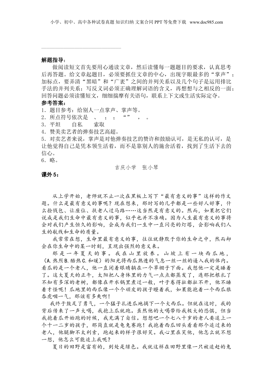 小学、初中、高中各种试卷真题知识归纳文案合同PPT等免费下载www.doc985.com小学语文经典题(课外语段阅读)课外2:我爱水,所以我爱大海,爱长江,也爱小溪流。但是,我最爱的还是湖。静静的湖,像是一块无瑕的翡翠,在阳光的照耀下,闪烁着美丽的光泽。我喜欢独自一个人坐在湖畔,看着平静的湖面幻想。我想湖中一定有一个明亮的水晶宫,那是鱼儿的家园,不然它们怎么整天那么欢乐?水晶宫里一定有一块巨大的、发光的翡翠,不然湖水为什么会绿得这么美?我凝视湖面,偶尔投一枚石子,让它激起一道道波纹;或是放一只纸船,让它随着湖波飘荡。静静的湖是可爱的,但雨中的湖更动人。细丝般的雨丝飘下来,不停地织啊织,织出湖——这块绿色的“锦”。“锦”上无穷无尽的圆环,像美丽的姑娘绣出的朵朵鲜花。雷雨到来时的湖真热闹。你看,天空中一道道亮光,那是开幕的礼花上了天。你听,“轰轰”,礼炮响了,大会就开始了。等大雨一落,联欢会立刻开始。你看到湖面上朵朵竞相开放的雨花了吗?那是正在翩翩起舞的金色姑娘头上的玉花。你想知道节目是否精彩吗?那“哗哗”的雷鸣般的“掌声”会把一切都告诉你。湖是美的……1、给短文加上题目,写在横线上。2、用“——”画出文中的过渡句。用“~~”画出文中前后照应的句子。3、作者从哪几方面描写了雨中湖的什么特点?4、文中的“礼花”指的是,“礼炮”指的是,“玉花”指的是,“掌声”指的是。解题指导:新大纲明确要求:语文课程应“指导学生正确理解和运用祖国语文,丰富语言的积累,培育语感,发展思维”。如何让学生学会分析文章,领悟主要精神?一是读懂短文,知道短文讲的主要内容,作者所要表达的情感;二是指导学生抓住短文的开头和结尾,因为一般人用文字表达思想的时候总喜欢把最为重要的东西放在开头和结尾,诸如开场白、压轴戏;三是掌握常用的修辞手法。四是抓住短文的关键句子,进行分析,以便更好地把握文章的内容。五是回答问题,答题要简单明了,答案要紧扣题目要求。参考答案:1、美丽的湖。2、过渡句:静静的湖是可爱的,但雨中的湖更动人。相照应的句子:我爱水,所以我爱大海,爱长江,也爱小溪流。但是,我最爱的还是湖。湖是美的……3、细雨中的湖像块绿色的锦;雷雨到来时的湖很热闹。4、闪电、雷声、雨花、雨点落在湖面上的声音小学、初中、高中各种试卷真题知识归纳文案合同PPT等免费下载www.doc985.com海安县开发区实验小学葛海燕课外4:_______________________________一个在巴黎旅游的外国人,在车站附近遇到一个街头卖艺者,其琴声悠扬,令人感伤,吸引不少行人。拉完一曲,周围的人纷纷向钱罐里丢钱,有的面额还不小。转眼工夫,钱已装满了罐子。但卖艺者的脸上并没有一丝欣喜的表情。“已赚到不少钱了,他为什么还不快乐?”旅游者望着卖艺人那依旧忧郁的面孔,疑惑地问。“也许他需要掌声吧。”他的朋友谈谈地说了一句。旅游者的心被触动了,她缓缓抬起手来,为之鼓掌。果然,卖艺人那张黯淡消瘦的脸慢慢绽开了,眼睛里还溢出了感激的泪水。不错,卖艺者心底最终期待的是掌声!钱只不过是别人因可怜他而给予的一种恩赐,而掌声则是他对人生经历的赞许和鼓励,是真正发自内心的无私认可。人生旅途往往险峻崎岖,不满辛辣,不幸与灾难随时都可能降临你的头上,人为了生活,不得不与之斗争。在斗争的过程中,难免会坠入危难的境地。此时,最好的帮助就是给予一点掌声,为之喝彩,因为这能给人以生之动力和生之信心。这掌声能帮助一个水手在黑暗□广袤的海洋中找到希望之灯□这掌声能使一个求知者在断壁悬崖边找到通幽之捷径□这掌声能使一个绝望者的□冰心□解冻□重整生活之旗鼓□这掌声使人感到自己受到了关注,得到了赞许。他们因为有了掌声而倍感欣慰,他们也因为有了掌声而信心百倍。很多时候,你的举手之劳或许正是别人的真正需要,不要吝啬你的掌声,慷慨赋予吧,它会给别人带来快乐。或许是一切。1.给文章加个题目。2.在□中点上正确的标点符号。3.写出下列词语的反义词。崎岖——无私——给予——4.“其琴声悠扬,令人感伤,吸引不少行人。”这句话说明了什么?______________________...
