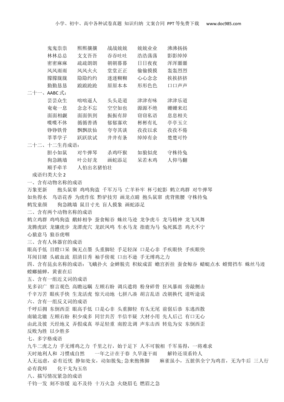 小学、初中、高中各种试卷真题知识归纳文案合同PPT等免费下载www.doc985.com一、描写人的品质:平易近人宽宏大度冰清玉洁持之以恒锲而不舍废寝忘食大义凛然临危不俱光明磊落不屈不挠鞠躬尽瘁死而后已二、描写人的智慧:料事如神足智多谋融会贯通学贯中西博古通今才华横溢出类拔萃博大精深集思广益举一反三三、描写人物仪态、风貌:憨态可掬文质彬彬风度翩翩相貌堂堂落落大方斗志昂扬意气风发威风凛凛容光焕发神采奕奕四、描写人物神情、情绪:悠然自得眉飞色舞喜笑颜开神采奕奕欣喜若狂呆若木鸡喜出望外垂头丧气无动于衷勃然大怒五、描写人的口才:能说会道巧舌如簧能言善辩滔滔不绝伶牙俐齿出口成章语惊四座娓娓而谈妙语连珠口若悬河六、来自历史故事的成语:三顾茅庐铁杵成针望梅止渴完璧归赵四面楚歌负荆请罪精忠报国手不释卷悬梁刺股凿壁偷光七、描写人物动作:走马观花欢呼雀跃扶老携幼手舞足蹈促膝谈心前俯后仰奔走相告跋山涉水前赴后继张牙舞爪八、描写人间情谊:恩重如山深情厚谊手足情深形影不离血浓于水志同道合风雨同舟赤诚相待肝胆相照生死相依九、说明知事晓理方面:循序渐进日积月累温故知新勤能补拙笨鸟先飞学无止境学海无涯滴水穿石发奋图强开卷有益十、来自寓言故事的成语:自相矛盾滥竽充数画龙点睛刻舟求剑守株待兔叶公好龙亡羊补牢画蛇添足掩耳盗铃买椟还珠十一、描写事物的气势、气氛:无懈可击锐不可当雷厉风行震耳欲聋惊心动魄铺天盖地势如破竹气贯长虹万马奔腾如履平地十二、形容四季特点:春寒料峭春意盎然春暖花开满园春色春华秋实春风化雨骄阳似火暑气蒸人烈日炎炎秋风送爽秋高气爽秋色宜人冰天雪地寒气袭人寒冬腊月十三、形容繁荣兴盛景象:济济一堂热火朝天门庭若市万人空巷座无虚席高朋满座如火如荼蒸蒸日上欣欣向荣川流不息十四、描写美的景和物:美不胜收蔚为壮观富丽堂皇金碧辉煌玉宇琼楼美妙绝伦巧夺天工锦上添花粉妆玉砌别有洞天十五、描写山水美景:锦绣河山高耸入云水天一色波光粼粼湖光山色重峦叠嶂山明水秀高山流水白练腾空烟波浩渺十六、描写花草树木:繁花似锦绿草如茵郁郁葱葱古树参天万木争荣百花齐放花团锦簇万紫千红桃红柳绿绿树成荫十七、描写日月风云:大雨如注滂沱大雨银装素裹皓月千里晨光熹微云雾迷蒙风清月朗春风化雨暴风骤雨风驰电掣十八、带有近义词的成语:兴国安邦翻山越岭百依百顺背井离乡长吁短叹道听途说丢盔弃甲调兵遣将甜言蜜语眼疾手快十九、带有反义词的成语:东倒西歪南辕北辙前赴后继前俯后继左推右挡承前启后舍近求远扬长避短弃旧图新优胜劣汰二十、AABB式:小学、初中、高中各种试卷真题知识归纳文案合同PPT等免费下载www.doc985.com鬼鬼祟祟熙熙攘攘战战兢兢兢兢业业沸沸扬扬林林总总支支吾吾吞吞吐吐浩浩荡荡影影绰绰密密麻麻疏疏朗朗朝朝暮暮日日夜夜浑浑噩噩风风雨雨风风火火堂堂正正偷偷摸摸轰轰烈烈朦朦胧胧隐隐约约迷迷糊糊心心念念挨挨挤挤勤勤恳恳踉踉跄跄原原本本形形色色口口声声二十一、AABC式:芸芸众生咄咄逼人头头是道津津有味津津乐道奄奄一息念念不忘空空如也源源不绝姗姗来迟面面相觑面面俱到振振有辞窃窃私语息息相关喋喋不休循循善诱郁郁寡欢彬彬有礼亭亭玉立铮铮铁骨飘飘欲仙夸夸其谈孜孜以求孜孜不倦莘莘学子跃跃欲试井井有条绰绰有余楚楚可怜二十二、十二生肖成语:胆小如鼠对牛弹琴杀鸡吓猴如狼似虎守株待兔狗急跳墙叶公好龙画蛇添足呆若木鸡人仰马翻顺手牵羊人怕出名猪怕壮成语归类大全2一、含有动物名称的成语万象更新抱头鼠窜鸡鸣狗盗千军万马亡羊补牢杯弓蛇影鹤立鸡群对牛弹琴如鱼得水鸟语花香为虎作伥黔驴技穷画龙点睛抱头鼠窜虎背熊腰守株待兔鹤发童颜狗急跳墙鼠目寸光盲人摸象画蛇添足二、含有两个动物名称的成语鹤立鸡群鸡鸣狗盗鹬蚌相争蚕食鲸吞蛛丝马迹龙争虎斗龙马精神龙飞凤舞龙腾虎跃龙骧虎步龙潭虎穴龙跃凤鸣车水马龙指鹿为马兔死狐悲鸡犬不宁心猿意马狼吞虎咽三、含有人体器官的成语眼高手低目瞪口呆胸无点墨头重脚轻手足轻深口是心非手疾眼快手疾眼快耳闻目睹头破血流眉清目秀袖手傍观口出不逊手无缚鸡之力四、含有昆虫名称的成语:飞蛾扑火金蝉脱壳积蚊成雷蟾宫折挂...