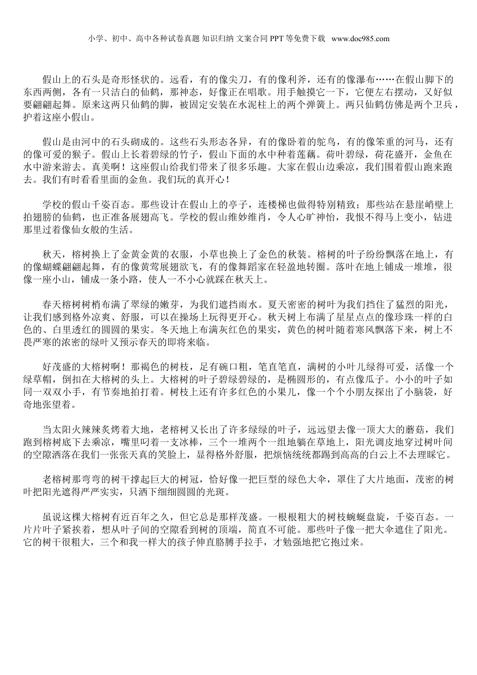 小学、初中、高中各种试卷真题知识归纳文案合同PPT等免费下载www.doc985.com假山上的石头是奇形怪状的。远看,有的像尖刀,有的像利斧,还有的像瀑布……在假山脚下的东西两侧,各有一只洁白的仙鹤,那神态,好像正在唱歌。用手触摸它一下,它便左右摆动,又好似要翩翩起舞。原来这两只仙鹤的脚,被固定安装在水泥柱上的两个弹簧上。两只仙鹤仿佛是两个卫兵,护着这座小假山。假山是由河中的石头砌成的。这些石头形态各异,有的像卧着的鸵鸟,有的像笨重的河马,还有的像可爱的猴子。假山上长着碧绿的竹子,假山下面的水中种着莲藕。荷叶碧绿,荷花盛开,金鱼在水中游来游去。真美啊!这座假山给我们带来了很多乐趣。大家在假山边乘凉,我们围着假山跑来跑去。我们有时看看里面的金鱼。我们玩的真开心!学校的假山千姿百态。那些设计在假山上的亭子,连楼梯也做得特别精致;那些站在悬崖峭壁上拍翅膀的仙鹤,也正准备展翅高飞。学校的假山维妙维肖,令人心旷神怡,我恨不得马上变小,钻进那里过着像仙女般的生活。秋天,榕树换上了金黄金黄的衣服,小草也换上了金色的秋装。榕树的叶子纷纷飘落在地上,有的像蝴蝶翩翩起舞,有的像黄莺展翅欲飞,有的像舞蹈家在轻盈地转圈。落叶在地上铺成一堆堆,很像一座小山,铺成一条小路,使人一不小心就踩在秋天上。春天榕树树梢布满了翠绿的嫩芽,为我们遮挡雨水。夏天密密的树叶为我们挡住了猛烈的阳光,让我们感到格外凉爽、舒服,可以在操场上玩得更开心。秋天树上布满了星星点点的像珍珠一样的白色的、白里透红的圆圆的果实。冬天地上布满灰红色的果实,黄色的树叶随着寒风飘落下来,树上不畏严寒的浓密的绿叶又预示春天的即将来临。好茂盛的大榕树啊!那褐色的树枝,足有碗口粗,笔直笔直,满树的小叶儿绿得可爱,活像一个绿草帽,倒扣在大榕树的头上。大榕树的叶子碧绿碧绿的,是椭圆形的,有点像瓜子。小小的叶子如同一双双小手,有节奏地拍打着。树枝上还有许多红色的小果儿,像一个个小朋友探出了小脑袋,好奇地张望着。当太阳火辣辣炙烤着大地,老榕树又长出了许多绿绿的叶子,远远望去像一顶大大的蘑菇,我们跑到榕树底下去乘凉,嘴里叼着一支冰棒,三个一堆两个一组地躺在草地上,阳光调皮地穿过树叶间的空隙洒落在我们一张张天真的笑脸上,显得格外舒服,把烦恼统统都踢到高高的白云上不去理睬它。老榕树那弯弯的树干撑起巨大的树冠,恰好像一把巨型的绿色大伞,罩住了大片地面,茂密的树叶把阳光遮得严严实实,只洒下细细圆圆的光斑。虽说这棵大榕树有近百年之久,但它总是那样茂盛。一根根粗大的树枝蜿蜒盘旋,千姿百态。一片片叶子紧挨着,想从叶子间的空隙看到树的顶端,简直不可能。那些叶子像一把大伞遮住了阳光。它的树干很粗大,三个和我一样大的孩子伸直胳膊手拉手,才勉强地把它抱过来。小学、初中、高中各种试卷真题知识归纳文案合同PPT等免费下载www.doc985.com春暖花开,万物复苏。从冬天走过来的芒果树,本来就不怎么落叶,经春风一吹,新芽嫩叶竟相从树枝上钻了出来,虽然一排只有六棵,却也显得蓊蓊郁郁蓬蓬勃勃,慢慢地淡黄淡黄的芒果花也竞相跑出了青青绿绿茂茂盛盛的枝头。夏季,天气渐热,窗前的芒果树已是芒果累累挂满枝头,每天清晨,几只小麻雀在枝头上跳来跳去乐悠悠,唧唧喳喳叫不停,好像是在为芒果树唱着丰收的欢歌,跳着庆祝的喜舞。校园的芒果树我们的校道上有一棵棵的芒果树,一排排,像一排排的卫兵保护着我们的校园。春天,春雨绵绵,春风习习,春风姑娘一吹,百花齐放,芒果树吹醒了,长出了新芽,看我们的校园。很柔软也很舒服。夏天,夏日炎炎,骄阳似火,在太阳公公的照耀下芒果树长高了,叶子绿油油的,很茂盛,像碧绿的大伞,可是时间长了,它被太阳晒的头晕了,。秋天,秋高气爽,天高云淡,秋风一吹,把芒果树上的芒果吹熟了,黄澄澄的,可爱极了,诱人极了。芒果树上的叶子吹黄了,各个老师都来摘芒果,了、你轻轻尝一口,又酸又甜,真好吃。秋风又吹了一吹,芒果树上的叶子一片又一片地掉落在地上,走上去“沙沙”地响。冬天,寒风刮了起来,芒果树就觉得有点冷,好象在说:“好冷啊的...