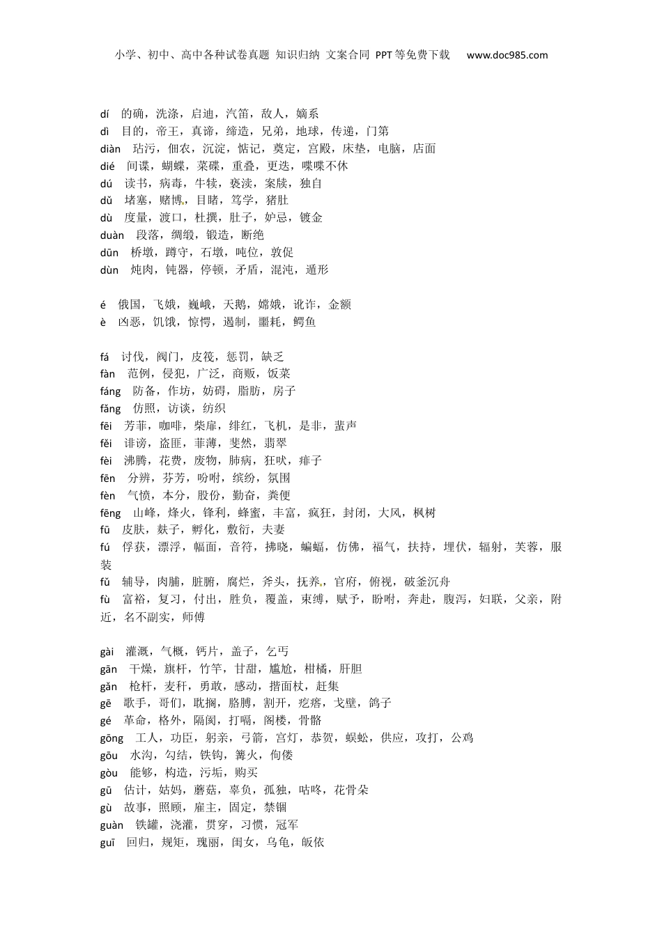 小学、初中、高中各种试卷真题知识归纳文案合同PPT等免费下载www.doc985.com同音字大全āi尘埃,挨近,唉声叹气,哀伤,哎呀àn按时,暗道,黯然,答案ào骄傲,奥妙,澳洲,懊悔bān班门弄斧,颁奖,斑痕,搬运bàn伙伴,搅拌,绊脚石,装扮,花瓣bāo花苞,同胞,书包,剥皮,褒奖,煲汤bào暴风雨,爆炸,报酬,抱歉,曝光bèi长辈,贝壳,狼狈,背景,准备,疲惫bǐ比赛,鄙视,匕首,彼此,毛笔bì隐蔽,墙壁,完壁归赵,逃避,弊端,必须,毕业,闭塞,包庇,辟邪,碧绿,臂膀biàn辩论,辨认,辫子,变革,方便,遍地bīn贵宾,海滨,缤纷,濒临,彬彬有礼bǐng秉烛夜游,手柄,屏气凝神,烧饼,禀性bō广播,波涛,拨款,剥削,玻璃,菠菜bó博学,拼搏,赤膊上阵,磅薄,反驳,停泊,柏林,船舶,刻薄,伯仲cāng仓库,苍茫,沧海,船舱cè厕所,侧重,测算,对策,手册chá察觉,查找,茶水,麦茬chà岔道,诧异,差不多,树杈,古刹,姹紫嫣红chán婵娟,蝉联,馋嘴,禅理,缠绕,蟾蜍,谗言cháng品尝,赔偿,经常,长江,肠胃,徜徉,打场chàng唱歌,舒畅,惆怅,倡导chéng路程,惩处,呈现,承办,诚信,澄清,成功,乘机,橙红,城镇,盛饭chí池塘,松弛,奔驰,保持,迟到,汤匙chì斥责,翅膀,赤诚,炽热,叱咤,敕勒歌chóu丝绸,范畴,报酬,稠密,报仇,筹划,忧愁chú厨房,橱窗,雏形,踌躇,除非,锄头chù到处,接触,抽搐,矗立,牲畜chuò啜泣,辍学,绰号,龌龊cí慈祥,陶瓷,磁铁,辞职,词汇,雌雄[来源:学|科|网]chuì脆弱,翠绿,憔悴,精粹,荟萃cuò挫折,措施,错误dài等待,逮捕,代替,带领,大夫,贷款,怠慢,袋子,爱戴dān担忧,单独,耽搁,丹青,殚精竭虑dàn弹药,重担,诞生,淡水,但是,元旦,鸡蛋dǎo捣毁,倒闭,舞蹈,祈祷,导致,岛屿dào到处,倒退,稻谷,盗窃,悼念,道路小学、初中、高中各种试卷真题知识归纳文案合同PPT等免费下载www.doc985.comdí的确,洗涤,启迪,汽笛,敌人,嫡系dì目的,帝王,真谛,缔造,兄弟,地球,传递,门第diàn玷污,佃农,沉淀,惦记,奠定,宫殿,床垫,电脑,店面dié间谍,蝴蝶,菜碟,重叠,更迭,喋喋不休dú读书,病毒,牛犊,亵渎,案牍,独自dǔ堵塞,赌博,目睹,笃学,猪肚dù度量,渡口,杜撰,肚子,妒忌,镀金duàn段落,绸缎,锻造,断绝dūn桥墩,蹲守,石墩,吨位,敦促dùn炖肉,钝器,停顿,矛盾,混沌,遁形é俄国,飞娥,巍峨,天鹅,嫦娥,讹诈,金额è凶恶,饥饿,惊愕,遏制,噩耗,鳄鱼fá讨伐,阀门,皮筏,惩罚,缺乏fàn范例,侵犯,广泛,商贩,饭菜fáng防备,作坊,妨碍,脂肪,房子fǎng仿照,访谈,纺织fēi芳菲,咖啡,柴扉,绯红,飞机,是非,蜚声fěi诽谤,盗匪,菲薄,斐然,翡翠fèi沸腾,花费,废物,肺病,狂吠,痱子fēn分辨,芬芳,吩咐,缤纷,氛围fèn气愤,本分,股份,勤奋,粪便fēng山峰,烽火,锋利,蜂蜜,丰富,疯狂,封闭,大风,枫树fū皮肤,麸子,孵化,敷衍,夫妻fú俘获,漂浮,幅面,音符,拂晓,蝙蝠,仿佛,福气,扶持,埋伏,辐射,芙蓉,服装fǔ辅导,肉脯,脏腑,腐烂,斧头,抚养,官府,俯视,破釜沉舟fù富裕,复习,付出,胜负,覆盖,束缚,赋予,盼咐,奔赴,腹泻,妇联,父亲,附近,名不副实,师傅gài灌溉,气概,钙片,盖子,乞丐gān干燥,旗杆,竹竿,甘甜,尴尬,柑橘,肝胆gǎn枪杆,麦秆,勇敢,感动,揩面杖,赶集gē歌手,哥们,耽搁,胳膊,割开,疙瘩,戈壁,鸽子gé革命,格外,隔阂,打嗝,阁楼,骨骼gōng工人,功臣,躬亲,弓箭,宫灯,恭贺,蜈蚣,供应,攻打,公鸡gōu水沟,勾结,铁钩,篝火,佝偻gòu能够,构造,污垢,购买gū估计,姑妈,蘑菇,辜负,孤独,咕咚,花骨朵gù故事,照顾,雇主,固定,禁锢guàn铁罐,浇灌,贯穿,习惯,冠军guī回归,规矩,瑰丽,闺女,乌龟,皈依小学、初中、高中各种试卷真题知识归纳文案合同PPT等免费下载www.doc985.comhán寒冬,包含,涵养,函授,邯郸,韩国,可汗hàn翰林,遗憾,浩瀚,震撼,干旱,电焊,捍卫,菡萏,颔首,汉字,凶悍,流...
