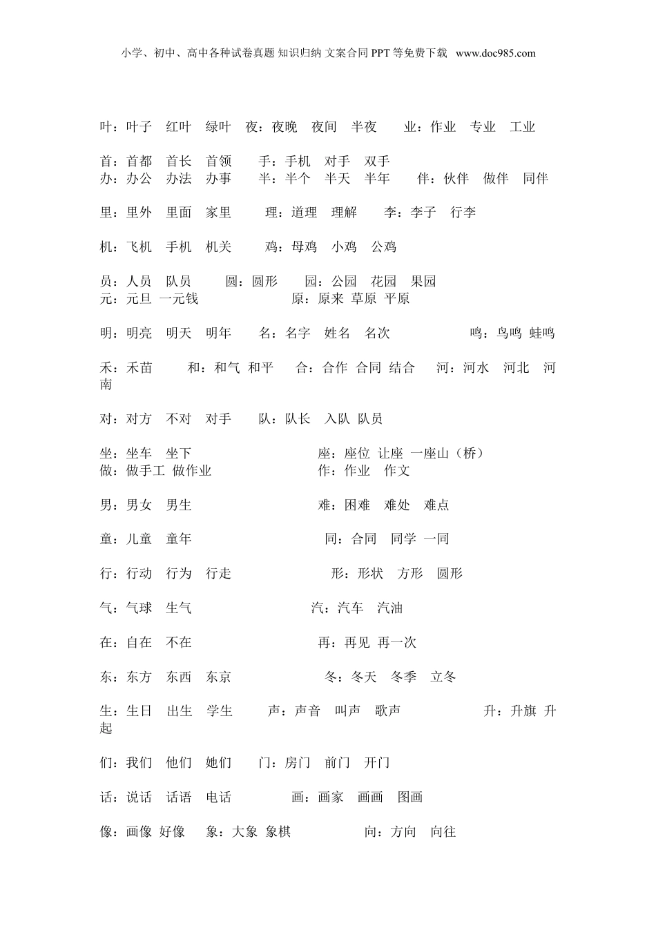 小学、初中、高中各种试卷真题知识归纳文案合同PPT等免费下载www.doc985.com反义词软--硬(yìng)高--低(矮(ǎi))胖(肥)--瘦开--关开--谢开--闭开--合分--合有--无多--少老--少对--错粗--细粗心--细心笑--哭里--外脱--穿早--晚男--女亮--黑黑--白长--短去--来来——回进--出近--远出--入香--臭(chòu)送--迎(yíng)借--还(huán)弯曲--笔直直--弯真--假干--湿动--静新--旧重--轻苦--甜收--放前--后左--右快--慢死--活生--死生--熟是--非沉--浮美--丑明--暗忙--闲天--地这--那爱--恨冷--热输--赢淡--浓饱--饿问--答方--圆东--西南--北古--今虚心--骄傲热情--冷淡诚实--虚伪好——坏高——低外——内无——有大——小上——下天——地日——月水——火情黑暗——光明失败——成功安全——危险旧——()冷——()早——()长——()甜——()慢——()黑——()近——()前——()冷淡——()黑暗——()南——()低——()闲——()开——()哭——()臭——()丑——()出——()东——()有——()多——()假——()合——()收——()去——()前——()以后——()短——()死——()答——()丑——()沉——(浮)粗——(细)虚——(实)谦虚——(骄傲)勤——(懒)轻——(重)脱——(穿)借——(还)明——(暗)胖——(瘦)高——(矮)弯——(直)宽——(直)同音字长:长处长短长春常:常常往常经常非:非常是非飞:飞机起飞工:工作工时电工公;办公公园公车有:有人有事没有友:朋友友好工友时:时间同时时光石:石头宝石玉石力:力气主力力量立:立正起立成立小学、初中、高中各种试卷真题知识归纳文案合同PPT等免费下载www.doc985.com叶:叶子红叶绿叶夜:夜晚夜间半夜业:作业专业工业首:首都首长首领手:手机对手双手办:办公办法办事半:半个半天半年伴:伙伴做伴同伴里:里外里面家里理:道理理解李:李子行李机:飞机手机机关鸡:母鸡小鸡公鸡员:人员队员圆:圆形园:公园花园果园元:元旦一元钱原:原来草原平原明:明亮明天明年名:名字姓名名次鸣:鸟鸣蛙鸣禾:禾苗和:和气和平合:合作合同结合河:河水河北河南对:对方不对对手队:队长入队队员坐:坐车坐下座:座位让座一座山(桥)做:做手工做作业作:作业作文男:男女男生难:困难难处难点童:儿童童年同:合同同学一同行:行动行为行走形:形状方形圆形气:气球生气汽:汽车汽油在:自在不在再:再见再一次东:东方东西东京冬:冬天冬季立冬生:生日出生学生声:声音叫声歌声升:升旗升起们:我们他们她们门:房门前门开门话:说话话语电话画:画家画画图画像:画像好像象:大象象棋向:方向向往小学、初中、高中各种试卷真题知识归纳文案合同PPT等免费下载www.doc985.com香:香油香水乡:家乡乡村老乡到:到达到站买到道:过道知道道路往:向往来往网:网吧上网节:节日节目春节一节课结:总结结果偏旁一字部:丁万百再更干井共面画在草字头:花草节苦苗言字旁:说话认语诗许讲请让谁走之旁:连远送过边这选道人字头:全会走字旁:赶起单人旁:你他们伙伴位像什借做绞丝旁:红绿级练给双人旁:行往得很提手旁:扫拉把找女字旁:妈奶她姐妹口字旁:听唱吹吃吗吧吓叫呢呀父字头:爷爸哪叶知和古后同只向合名两点水:冷净凉方框儿:园因三点水:洗江河湖海活没淡沙汽法门字框:问间闭四点底:点照热虫字旁:蚂蚁虾双耳旁:阳那都队足字旁:跑跟跳竖心旁:忙快情怕秃宝盖:军写心字底:忘想念总急宝盖头:完家定木字旁:林桃树李桥机朵穴宝盖:空禾字旁:种秀香秋王字旁:球玩日字旁:明春早星晚是时量最立刀旁:到刚别目字旁:看着眼睛反文旁:放收语文一年级下册复习※四字词语:春回大地柳绿花红泉水丁冬百花齐放万里无云古往今来春暖花开春风拂面五颜六色欢歌笑语山清水秀万紫千红和风细雨鸟语花香聪明活泼四面八方波浪滚滚各种各样鲜花盛开飞驰而过※常用的词语搭配:“地”字短语:仔细地看笔直地站愉快地走轻轻地送还高高兴兴地走轻轻地走慢慢地走认真地清扫懒洋洋地晒太阳慢吞吞地说兴冲冲地走进来高兴地拉着急地说不安地说惊奇地问快活地游轻轻...