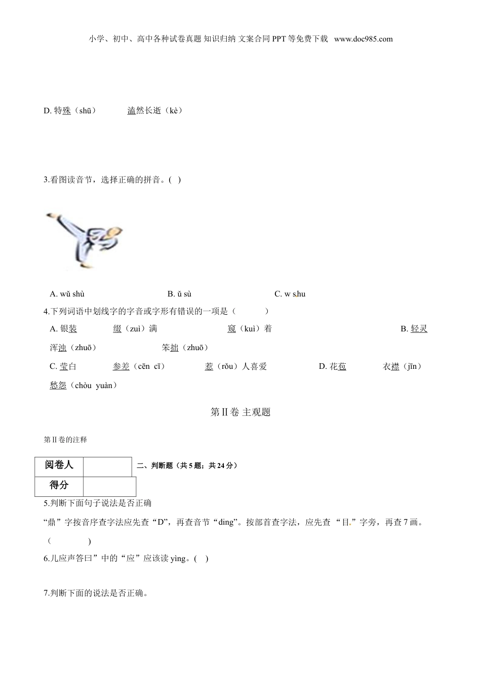 小学、初中、高中各种试卷真题知识归纳文案合同PPT等免费下载www.doc985.com【高分攻略】小升初语文专项训练专题01《拼音》(含答案)语文考试考试时间:120分钟满分:100分姓名:__________班级:__________考号:__________题号一二三四五六七八总分评分*注意事项:1、填写答题卡的内容用2B铅笔填写2、提前xx分钟收取答题卡第Ⅰ卷客观题第Ⅰ卷的注释阅卷人一、单选题(共4题;共8分)得分1.下列四组音节,都是整体认读音节的一组是()A.wuwosiyingB.yueyuzhiyunC.chiriyangyue2.下列同语中加横线字读音不正确的是第()个。A.要挟(xié)衣冠不整(guàn)B.潜伏(qián)奄奄一息(yān)C.自束(shù)面面相觑(qù)小学、初中、高中各种试卷真题知识归纳文案合同PPT等免费下载www.doc985.comD.特殊(shū)溘然长逝(kè)3.看图读音节,选择正确的拼音。()A.wǔshùB.ǔsùC.wshu4.下列词语中划线字的字音或字形有错误的一项是()A.银装缀(zuì)满窥(kuì)着B.轻灵浑浊(zhuō)笨拙(zhuō)C.莹白参差(cēncī)惹(rǒu)人喜爱D.花苞衣襟(jīn)愁怨(chòuyuàn)第Ⅱ卷主观题第Ⅱ卷的注释阅卷人二、判断题(共5题;共24分)得分5.判断下面句子说法是否正确“鼎”字按音序查字法应先查“D”,再查音节“ding”。按部首查字法,应先查“目”字旁,再查7画。()6.儿应声答曰”中的“应”应该读yìng。()7.判断下面的说法是否正确。小学、初中、高中各种试卷真题知识归纳文案合同PPT等免费下载www.doc985.com“耸立”的“耸”应读“shǒng”。()8.判断对错。水藻放在月球的尘土中,马上就枯萎了。9.判断每组划线读音是否正确。(1)剥削(xiē)石蕊(xīn)直戳(chuō)(2)倒毙(bì)蒙胧(lóng)黑糊糊(hū)(3)抽噎(yē)枞(cóng)树见微知著(zhuó)(4)艰难(nán)薄(báo)弱附和(hè)阅卷人三、填空题(共4题;共19分)得分10.看拼音,写词语。nǎojīnsǐwángláofángdiūshīgàobié________________________________________11.照样子,写词语。又说又跳又________又________又________又________又________又________12.请选出划线字的正确读音。妖娆________(ráonào)隧________(suìshuì)道机械________(jièxiè)青藏________(zàngcáng)狰狞________(nínglíng)巍________(wèiwēi)峨13.根据拼音写汉字。好rén________dà________地yuè________亮ér________子两tóu________lǐ________面kě________是dōngxī________春tiān________阅卷人四、语言表达(共2题;共10分)得分14.照样子,写一写。例:chchīmāmɑxǐhuɑnchīshuǐɡuǒ.小学、初中、高中各种试卷真题知识归纳文案合同PPT等免费下载www.doc985.com①inɡyīnɡ②ünyún15.按音序从新排列下列各字。恃、翡、翠、胖、墩、褂、巧、绽、跤阅卷人五、默写(共1题;共5分)得分16.默写六个单韵母阅卷人六、诗歌鉴赏(共1题;共11分)得分[来源:Zxxk.Com]17.阅读诗歌,回答问题。题西林壁[来源:Z,xx,k.Com]横看成岭侧成峰,远近高低各不同。________________,________________。(1)把这首诗写完整,这首诗的作者是________诗人________。横看成岭侧成峰,远近高低各不同。________,________。(2)解释词语:①题:________②缘:________③不识:________(3)前两句写了诗人从________、________不同的角度,处在________、________、________、________不同位置观看庐山的感觉。这两句诗的意思是________。(4)所谓“当局者迷”,诗中表示这个道理的诗句是:________,________。(5)从《题西林壁》这首诗中得到的启发是()A.对复杂的事物,只要看到一方面,就可以推断出其它方面。B.对复杂的事物,应多角度观察,多方面调查了解,抓住主要的方面思考。C.对复杂的事物,既要多方面观察,又要亲身去体验,去分析。小学、初中、高中各种试卷真题知识归纳文案合同PPT等免费下载www.doc985.com阅卷人七、连线题(共1题;共5分)得分18.连一连,看谁读得准。阅卷人八、语段阅读(共1题;共18分)得分19.阅读下文,回答问题春天的小雨滴滴滴陈木城雨已...