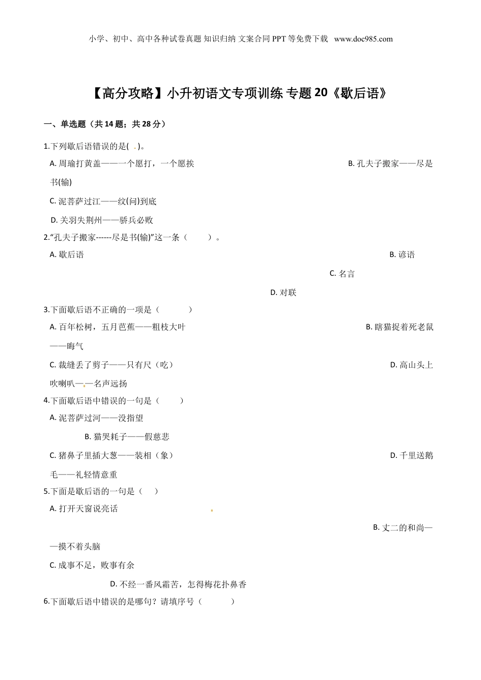 小学、初中、高中各种试卷真题知识归纳文案合同PPT等免费下载www.doc985.com【高分攻略】小升初语文专项训练专题20《歇后语》一、单选题(共14题;共28分)1.下列歇后语错误的是()。A.周瑜打黄盖——一个愿打,一个愿挨B.孔夫子搬家——尽是书(输)C.泥菩萨过江——纹(问)到底D.关羽失荆州——骄兵必败2.“孔夫子搬家------尽是书(输)”这一条()。A.歇后语B.谚语C.名言D.对联3.下面歇后语不正确的一项是()A.百年松树,五月芭蕉——粗枝大叶B.瞎猫捉着死老鼠——晦气C.裁缝丢了剪子——只有尺(吃)D.高山头上吹喇叭——名声远扬4.下面歇后语中错误的一句是()A.泥菩萨过河——没指望B.猫哭耗子——假慈悲C.猪鼻子里插大葱——装相(象)D.千里送鹅毛——礼轻情意重5.下面是歇后语的一句是()A.打开天窗说亮话B.丈二的和尚——摸不着头脑C.成事不足,败事有余D.不经一番风霜苦,怎得梅花扑鼻香6.下面歇后语中错误的是哪句?请填序号()小学、初中、高中各种试卷真题知识归纳文案合同PPT等免费下载www.doc985.comA.泥菩萨过河——没指望B.猫哭耗子——假慈悲C.猪鼻子里插大葱——装相(象)D.隔着门风吹喇叭——名声在外[来源:学科网ZXXK]7.下列歇后语前后连接不正确的一组是()A.狗撵鸭子——呱呱叫B.隔着门缝吹喇叭——名声(鸣声)在外C.韩信点兵——大将风度D.脚踏西瓜皮——滑到哪里是哪里8.下列歇后语不是源自《三国演义》的一项是()A.孔明弹琴退仲达——临危不乱B.阿斗的江山——白送C.关公赴会——单刀直入D.林冲到了野猪林——绝处逢生9.下列歇后语不正确的是()。A.拉牛入鼠洞——走不通B.卢沟桥的狮子——自由自在C.林冲误闯白虎堂——单刀直入D.棉花里藏针——软中有硬10.下列歇后语中错误的一句是()A.泥菩萨过河——没指望B.猫哭耗子——假慈悲C.猪鼻子里插大葱——装象D.隔着门风吹喇叭——名声在外11.给下列的俗语、歇后语和名言依次填上意思相近的词语,正确的一项是()①三个臭皮匠,胜过一个诸葛亮。②十五个吊桶打水——七上八下。[来源:Z.xx.k.Com]③知之为知之,不知为不知,是知也。④千里送鹅毛——礼轻情义重。小学、初中、高中各种试卷真题知识归纳文案合同PPT等免费下载www.doc985.comA.忐忑不安实事求是雪中送炭集思广益B.集思广益忐忑不安实事求是雪中送炭C.集思广益忐忑不安雪中送炭实事求是12.下面歇后语中错误的一句是()A.泥菩萨过河——没指望B.猫哭耗子——假慈悲C.猪鼻子里插大葱——装相D.隔着门风吹喇叭——名声在外13.下列歇后语错误的是()A.外甥打灯笼——照舅(旧)B.孔子搬家——净是书(输)C.泥菩萨过河——纹(问)到底D.周瑜打黄盖——一个愿打,一个愿挨14.我们的生活条件越来越好,真是()啊!A.水滴石穿——非一日之功B.砌墙的石头——后来居上C.芝麻开花——节节高二、填空题(共20题;共95分)15.把下面歇后语补充完整。①下雨出太阳——________②八十岁老汉吹唢呐——________③小葱拌豆腐——________④看戏淌眼泪——________⑤笔杆子吞进肚——________16.在下列歇后语中填上人名。①________的居处——开门见山②________大摆空城计——化险为夷③________败走华容道——不出所料④________断案——铁面无私17.根据语境,补充古诗词句或歇后语。①苏东坡缓歌徐吟,唱出对亲人的思念,也唱出对天下人的祝福:________小学、初中、高中各种试卷真题知识归纳文案合同PPT等免费下载www.doc985.com②满池的荷花映人眼帘,有两句诗能恰如其分地把这种美景表达出来:________③有一道数学题,我绞尽脑汁,也百思不得其解。就在我“________”时,老师一点拨,我豁然开朗,真是“________”啊!④春雨最珍贵,它让万物得到滋养,焕发出生机和活力。老师啊,您的教育也像春雨一样“________,________”让我一生受用。⑤改革开放后,人们的生活水平真是“________”。(请填一句歇后语)18.写出动物的名称________给鸡拜年——没安好心________过街——横行霸道________扑火——自取灭亡________哭________——假慈悲________屁股——摸不得热锅上的________——团团转骑________追快马——望尘莫及19.根据括号中的提示...