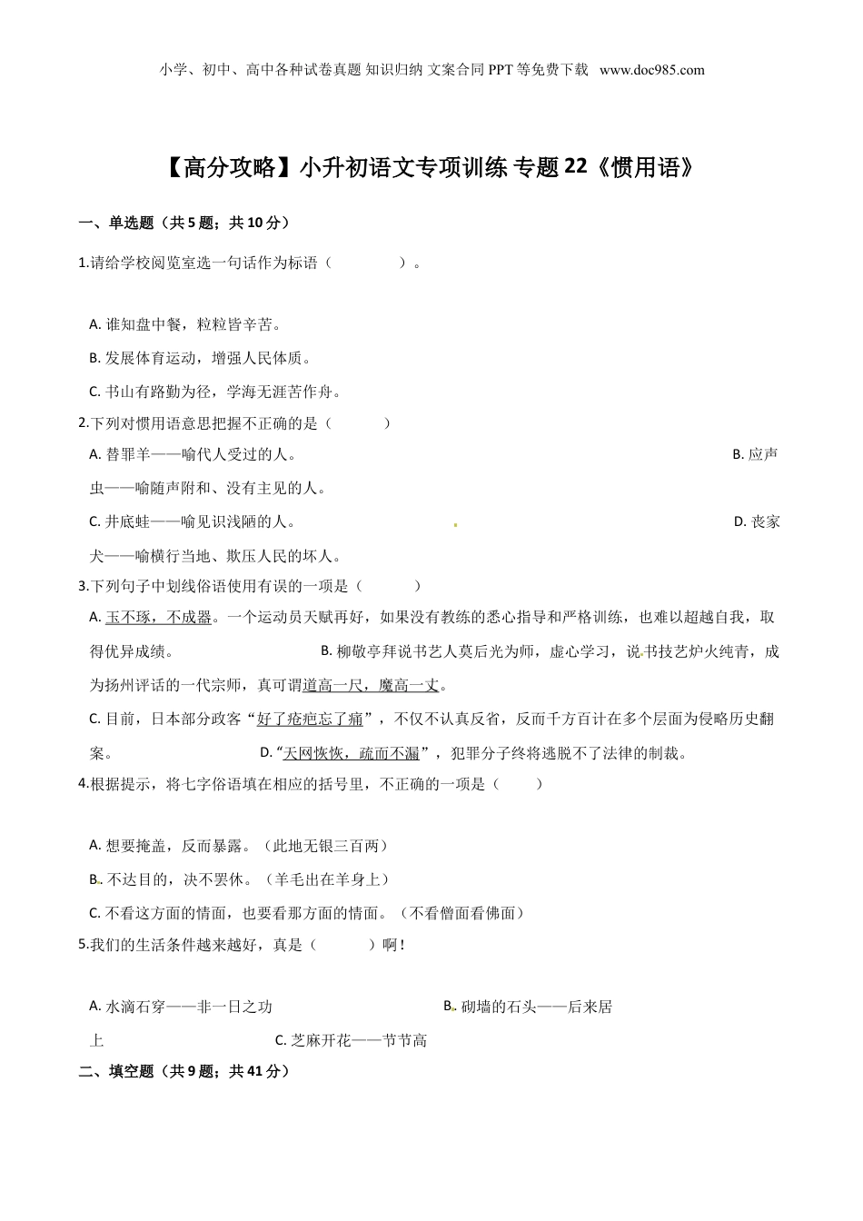 小学、初中、高中各种试卷真题知识归纳文案合同PPT等免费下载www.doc985.com【高分攻略】小升初语文专项训练专题22《惯用语》一、单选题(共5题;共10分)1.请给学校阅览室选一句话作为标语()。A.谁知盘中餐,粒粒皆辛苦。B.发展体育运动,增强人民体质。C.书山有路勤为径,学海无涯苦作舟。2.下列对惯用语意思把握不正确的是()A.替罪羊——喻代人受过的人。B.应声虫——喻随声附和、没有主见的人。C.井底蛙——喻见识浅陋的人。D.丧家犬——喻横行当地、欺压人民的坏人。3.下列句子中划线俗语使用有误的一项是()A.玉不琢,不成器。一个运动员天赋再好,如果没有教练的悉心指导和严格训练,也难以超越自我,取得优异成绩。B.柳敬亭拜说书艺人莫后光为师,虚心学习,说书技艺炉火纯青,成为扬州评话的一代宗师,真可谓道高一尺,魔高一丈。C.目前,日本部分政客“好了疮疤忘了痛”,不仅不认真反省,反而千方百计在多个层面为侵略历史翻案。D.“天网恢恢,疏而不漏”,犯罪分子终将逃脱不了法律的制裁。4.根据提示,将七字俗语填在相应的括号里,不正确的一项是()A.想要掩盖,反而暴露。(此地无银三百两)B.不达目的,决不罢休。(羊毛出在羊身上)C.不看这方面的情面,也要看那方面的情面。(不看僧面看佛面)5.我们的生活条件越来越好,真是()啊!A.水滴石穿——非一日之功B.砌墙的石头——后来居上C.芝麻开花——节节高二、填空题(共9题;共41分)小学、初中、高中各种试卷真题知识归纳文案合同PPT等免费下载www.doc985.com6.词语连线。小小________的声音又大又漂亮________的网飞快________地爬叽叽________地响吱吱呀呀________地叫着7.根据意思写词语夏令营活动中,小明把小丽带的面包给偷吃了。小丽问小明是否吃了她的面包。小明不仅不承认,还对小丽发脾气:“谁看到了?我带的饮料是不是你喝的?”小丽委屈的哭了。你觉得的用一个词语________来说小明最合。8.结合语境,填写俗语。这本书让我找得好苦,差不多把整个房间都翻遍了,也没有找到。没想到它却在桌子底下待着,真是“________,________”。9.你知道下面的惯用语是什么吗?①把吝啬钱财、一毛不拔的人喻为________②把浑浑噩噩、不明事理的人喻为________③把世故圆滑的人喻为________④把没有专业知识的外行人喻为________10.填空。机灵的________翠绿的________蓬松的________快乐的________11.把能搭配的词语用线连起来。一册________A、石头一块________B、密林一条________C、书一片________D、鱼12.添枝加叶(补充词语)。________的湖面________的涟漪________的月光________的目光________的夜晚________的大鲈鱼________地欣赏________地操纵________地抖动小学、初中、高中各种试卷真题知识归纳文案合同PPT等免费下载www.doc985.com13.你知道下面的惯用语是什么吗?①把公堂台阶下受审的囚犯喻为________②把足智多谋的人喻为________③把接待宾客的当地主人喻为________④把在团体中起主导的人喻为________14.把下列句子补充完整,并试着写一个环保宣传标语。(1)善待地球就是________。(2)________就是拯救未来。(3)但存方寸地,________。(4)有限的________,无限的________。(5)________自然资源,________生命绿色。(6)环保宣传标语:________[来源:Z。xx。k.Com]三、语言表达(共5题;共25分)15.用文明用语,将下列句子换个说法①喂,妈,今天开学了,快给钱。②奶奶,快给我盛饭。③喂,老头,去图书馆怎么走?④小丽,把窗户关上。⑤开门!干什么呢?16.口语交际问路谁都会,可是面对不同的人,你知道怎样问才最合适吗?如果向下面的人问去长安公园的路怎么走,该怎样问?请你写在横线上。问同龄人:问六七十岁的老人:小学、初中、高中各种试卷真题知识归纳文案合同PPT等免费下载www.doc985.com17.读读,想想,填填。①告别语②道歉语18.读读,想想,写写。①问候语:②答谢语:③道歉语:19.黄河是我们的“母亲河”,现在要发起一个“保护母亲河”的活动,请你设计一条公益广告语。四、默写(共2题;共14分)20.把句子补充完整。(1)________走遍天下,________寸步难行...