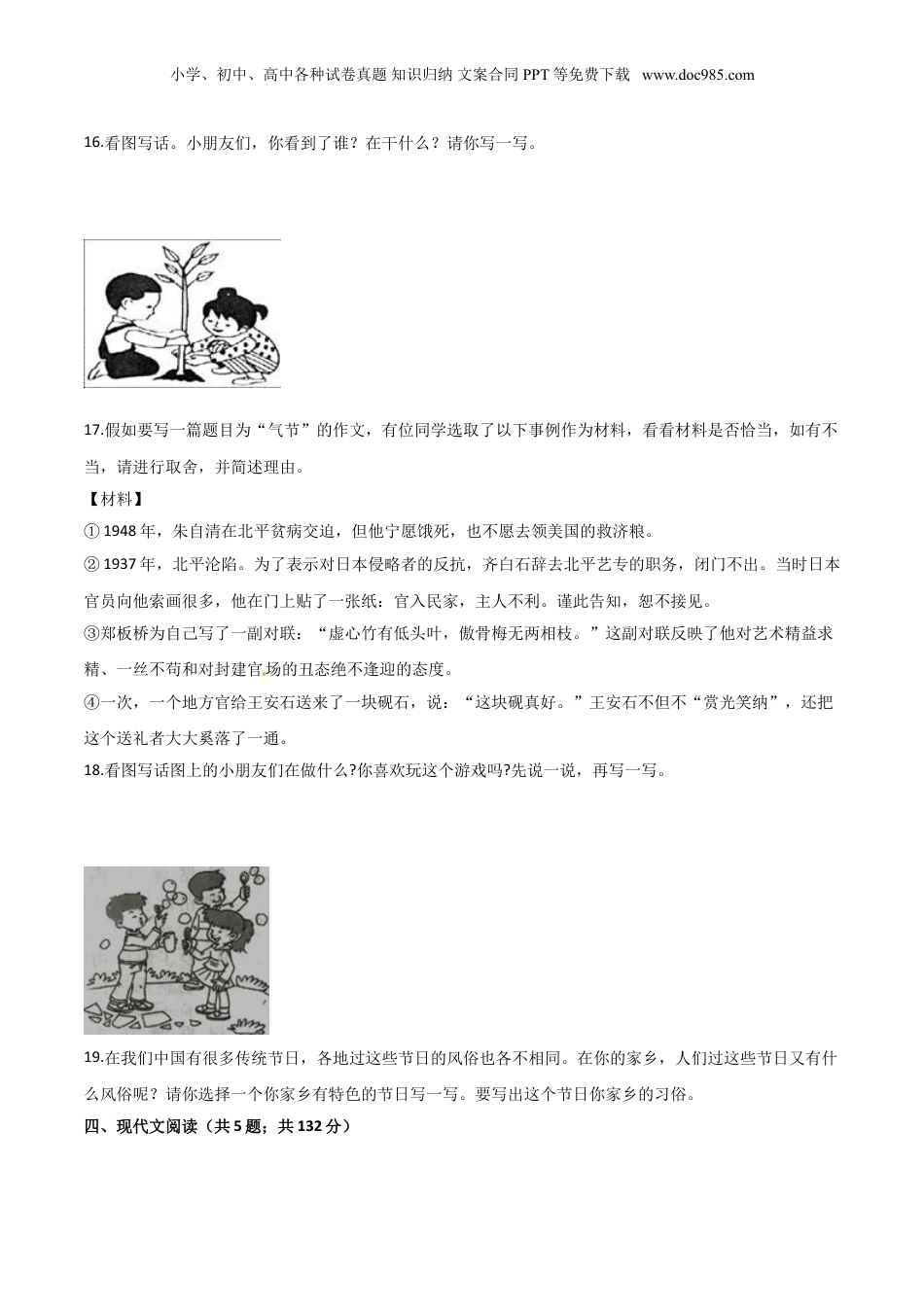 小学、初中、高中各种试卷真题知识归纳文案合同PPT等免费下载www.doc985.com【高分攻略】小升初语文专项训练专题25《作文训练》一、填空题(共10题;共32分)1.发言稿的________要根据具体需要、具体情境而定。要做到________具体,真实,________通顺。2.比一比,说说下列一组题目的相同点和不同点。童年往事童年趣事①相同点:________。②不同点:________。3.在平时的学习生活中,你一定经历过许多有趣的或开心的事,选一件令你印象最深刻的事情写下来,与同学们分享一下。4.按要求把下列题目分类,只写序号①我的假期②幽默的老爸③春天的早晨④小英雄雨来⑤我的小猫⑥故乡的芦苇⑦班级趣事⑧爸爸抓小偷⑨我最敬佩的人⑩我爱秋天的原野Ⅰ写人的题目:________。Ⅱ写事的题目:________。Ⅲ写景的题目:________。Ⅳ写物的题目:________。5.阅读下面刘菲的十个事例,然后分别以“热爱劳动的刘菲”、“刻苦学习的刘菲”为题,从事例中选择材料,拟出作文提纲。要求中心与材料一致。(只填序号)①带病坚持到校上课。②春天,与爸爸妈妈在院子里垒花坛。③帮助军属王大爷搞卫生。④下雨了,总是撑着伞接送小同学。⑤热心帮助同学补习功课。⑥积极参加清扫街道活动。⑦作业认真经常受到老师表扬。⑧一篇作文反复修改。⑨拾到钱包交给民警叔叔。⑩刻苦练习跳高。《热爱劳动的刘菲》:________。《刻苦学习的刘菲》:________。6.根据要求,把“难忘的XXX”这一题目补充完整。①以写人为主的作文题目:________小学、初中、高中各种试卷真题知识归纳文案合同PPT等免费下载www.doc985.com②以写事为主的作文题目:________③以写景为主的作文题目:________7.同是叙述一件事,《一件有意义的事》《一件难忘的趣事》的写作重点不同。《一件有意义的事》应突出这件事的________所在,而《一件难忘的趣事》叙述的事情必须________。8.语文实践活动。[来源:Zxxk.Com]春天是一个美好的季节,各种花次第开放,把我们的生活点缀得美丽芬芳,细心的同学们一定曾驻足观赏过它们吧?请把你所见所闻所感写下来,并至少用上一句诗词,好吗9.下面是一位同学写的写作提纲,请你把应该详写和略写的部分标出来:作文题目:有趣的蜗牛比赛中心:通过对蜗牛比赛的记叙,反映少年儿童课外生活的丰富多彩,表现少年儿童的生活情趣。材料安排:①我和表弟捉到几只蜗牛,想举行一次比赛。________②为参赛蜗牛命名,做好赛前准备。________③比赛中蜗牛各自的表现。________④比赛结果。________⑤结尾。________10.习作。生活中并不缺少美,缺少的是发现美的眼睛。你都发现了生活中哪些美丽的场景?请以“最美丽的________”为题,写一篇文章。补充题目时,可以参考诸如“心灵”“语言”“瞬间”“画面”“风景”等。二、问答题(共5题;共25分)11.“消息传来,聂将军收到了大批来自日本各地的电报和书信。”在信中日本人民会对聂将军说些什么呢?请展开想象,以一个日本国民的身份给聂将军写一封信。12.阅读“梗概”,想一想:鲁滨孙在荒岛上生活了多少年?做了哪些事?用自己的话简单写一写。13.实践园地写出几个你熟悉的中外科学家的名字,并借助工具书查找相关资料,了解他们的主要成就。14.“不高兴”会变成什么样子呢?想象一下,写下来。15.选取《不会叫的狗》中三个结局的其中一个结局,想一想,接下来会发生什么?三、语言表达(共4题;共20分)小学、初中、高中各种试卷真题知识归纳文案合同PPT等免费下载www.doc985.com16.看图写话。小朋友们,你看到了谁?在干什么?请你写一写。17.假如要写一篇题目为“气节”的作文,有位同学选取了以下事例作为材料,看看材料是否恰当,如有不当,请进行取舍,并简述理由。【材料】①1948年,朱自清在北平贫病交迫,但他宁愿饿死,也不愿去领美国的救济粮。②1937年,北平沦陷。为了表示对日本侵略者的反抗,齐白石辞去北平艺专的职务,闭门不出。当时日本官员向他索画很多,他在门上贴了一张纸:官入民家,主人不利。谨此告知,恕不接见。③郑板桥为自己写了一副对联:“虚心竹有低头叶,傲骨梅无两相枝。”这副对联反映了他对艺术精益求精、一丝不苟和...