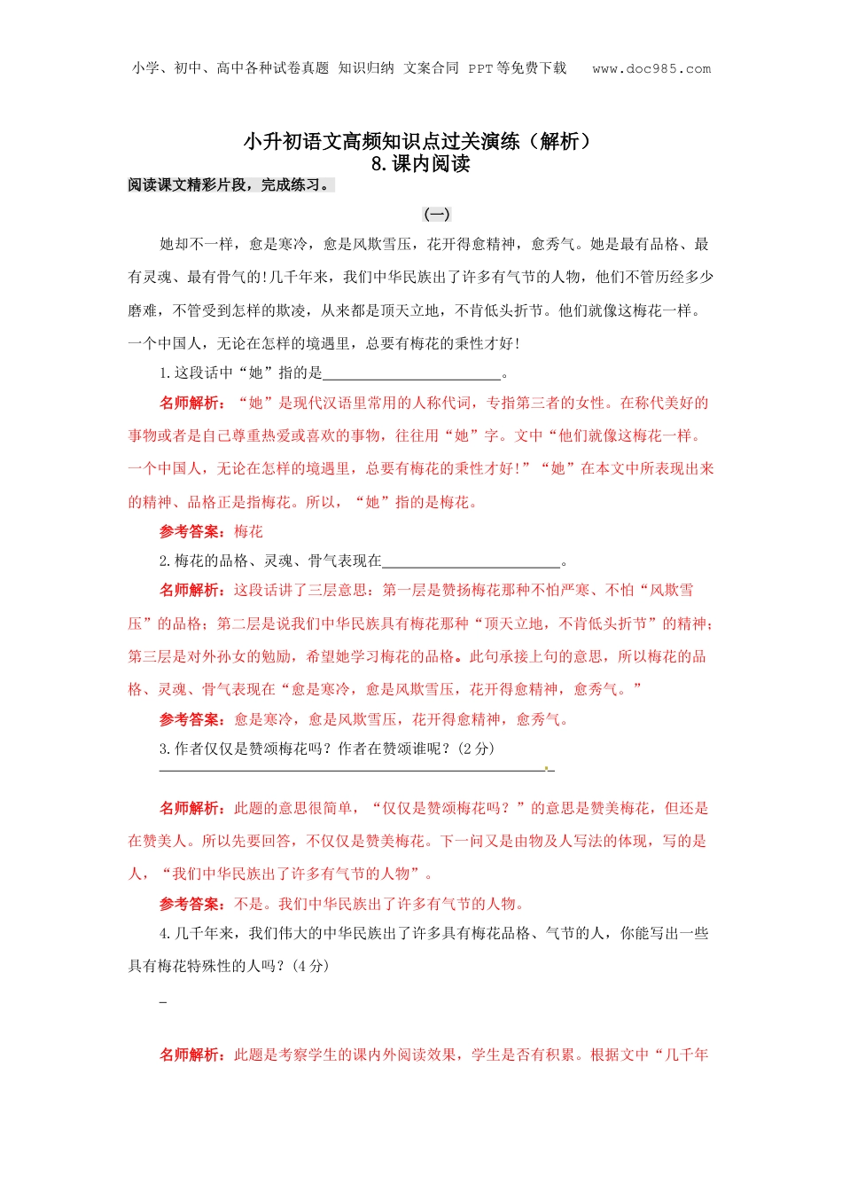 小学、初中、高中各种试卷真题知识归纳文案合同PPT等免费下载www.doc985.com小升初语文高频知识点过关演练(解析)8.课内阅读阅读课文精彩片段,完成练习。(一)她却不一样,愈是寒冷,愈是风欺雪压,花开得愈精神,愈秀气。她是最有品格、最有灵魂、最有骨气的!几千年来,我们中华民族出了许多有气节的人物,他们不管历经多少磨难,不管受到怎样的欺凌,从来都是顶天立地,不肯低头折节。他们就像这梅花一样。一个中国人,无论在怎样的境遇里,总要有梅花的秉性才好!1.这段话中“她”指的是。名师解析:“她”是现代汉语里常用的人称代词,专指第三者的女性。在称代美好的事物或者是自己尊重热爱或喜欢的事物,往往用“她”字。文中“他们就像这梅花一样。一个中国人,无论在怎样的境遇里,总要有梅花的秉性才好!”“她”在本文中所表现出来的精神、品格正是指梅花。所以,“她”指的是梅花。参考答案:梅花2.梅花的品格、灵魂、骨气表现在。名师解析:这段话讲了三层意思:第一层是赞扬梅花那种不怕严寒、不怕“风欺雪压”的品格;第二层是说我们中华民族具有梅花那种“顶天立地,不肯低头折节”的精神;第三层是对外孙女的勉励,希望她学习梅花的品格。此句承接上句的意思,所以梅花的品格、灵魂、骨气表现在“愈是寒冷,愈是风欺雪压,花开得愈精神,愈秀气。”参考答案:愈是寒冷,愈是风欺雪压,花开得愈精神,愈秀气。3.作者仅仅是赞颂梅花吗?作者在赞颂谁呢?(2分)[来源:学.科.网Z.X.X.K]名师解析:此题的意思很简单,“仅仅是赞颂梅花吗?”的意思是赞美梅花,但还是在赞美人。所以先要回答,不仅仅是赞美梅花。下一问又是由物及人写法的体现,写的是人,“我们中华民族出了许多有气节的人物”。参考答案:不是。我们中华民族出了许多有气节的人物。4.几千年来,我们伟大的中华民族出了许多具有梅花品格、气节的人,你能写出一些具有梅花特殊性的人吗?(4分)名师解析:此题是考察学生的课内外阅读效果,学生是否有积累。根据文中“几千年小学、初中、高中各种试卷真题知识归纳文案合同PPT等免费下载www.doc985.com来,我们中华民族出了许多有气节的人物,他们不管历经多少磨难,不管受到怎样的欺凌,从来都是顶天立地,不肯低头折节。他们就像这梅花一样。”学生就要想到我们的民族英雄们,把自己的阅读积累体现出来。例如,古代的文天祥、岳飞、近代的谭嗣同,现代的邱少云,董存瑞等等。参考答案:文天祥、岳飞、马宝玉、黄继光(二)[来源:学+科+网]詹天佑不怕困难,也不怕嘲笑,毅然接受了任务,开始勘测线路。哪里要开山,哪里要架桥,哪里要把陡坡铲平,哪里要把弯度改小,都要经过勘测,进行周密计算。詹天佑经常勉励工作人员说:“我们工作首先要精密,不能有一点儿马虎。‘大概’,‘差不多’,这类说法不应该出自工程人员之口。”他亲自带着学生和工人,背着标杆、经纬仪,在峭壁上定点、构图。塞外常常是狂风怒号,黄沙满天,一不小心就有坠入深谷的危险。詹天佑不管条件怎样恶劣,始终坚持在野外工作。白天,他攀山越岭,勘测线路;晚上,他就在油灯下绘图,计算。为了寻找一条合适的线路,他还常常请教当地的农民。遇到困难,他总是想:“这是中国人自己修筑的第一条铁路,一定要把它修好。否则,不但那些外国人要讥笑我们,而且会使中国工程师失掉信心。”1.这一自然段是围绕哪一句话写的,用波浪线把它划下来。名师解析:本题是在考查学生能否掌握中心句。文章开头的总起句,一般都揭示了全文内容,所以就是中心句。中心句在文中的作用①一般在段的开头的中心句起概括和总述作用。②一般在段的中间的中心句起承上启下作用。③一般在段的末尾的中心句起归纳和总结作用。④起强调和增强印象作用的中心句一般在段的开头和结尾。本段的的第一句就起概括和总述作用,下文中“塞外常常是狂风怒号,黄沙满天,一不小心就有坠入深谷的危险。詹天佑不管条件怎样恶劣,始终坚持在野外工作。”体现的是不怕困难;“哪里要开山,哪里要架桥,哪里要把陡坡铲平,哪里要把弯度改小,都要经过勘测”体现的是勘测线路。所以第一句话就是中心句。参考答案:詹天佑不怕困难,...