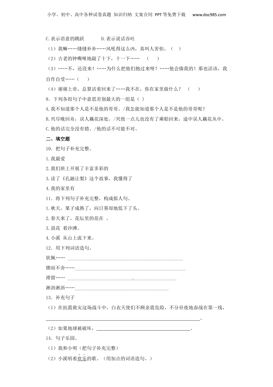 小学、初中、高中各种试卷真题知识归纳文案合同PPT等免费下载www.doc985.com小升初语文专项训练单句基础题一、选择题1.下列句子与例句同类的一句是()例:奶奶提着篮子上街买菜。A.爸爸让我们说说花生的好处。B.老师要求我们积极举手发言。C.我打开书包开始做作业。D.母亲叫闰土坐下来。2.下面的横线上应填的句子是()在我的梦里,所有被砍伐的森林重新绿叶葱茏,__________。梦境如此美好,能忍心让它仅仅是个梦吗?A.受污染的所有河流重新清波荡漾B.所有受污染的河流重新清波荡漾C.所有河流不再受污染而重新清波荡漾D.所有清波荡漾的河流不再受污染3.结合语境,填入横线处最恰当的一项是()。有人说,宽容是一种润滑剂,;宽容是一种镇定剂,;宽容是一束阳光,;宽容是一座桥梁,。①可以消融彼此间的猜疑积雪②可以消除人与人之间的摩擦[来源:Z,xx,k.Com]③可以将彼此间的心灵沟通④可以使人在众多纷扰中恪守平静A.②①④③B.④①③②C.②④①③D.②①③④4.句子训练营。将对应的序号填在括号里。小学、初中、高中各种试卷真题知识归纳文案合同PPT等免费下载www.doc985.com①壮丽的山川;②中华少年的英姿;③东方文化的美丽;④中华少年的誓言。(1)碧波环抱的宝岛,苍苍茫茫的草原。()(2)要像利剑把贫穷斩断,要用爱心把世界相连。()(3)从苍苍茫茫的草原走来,我是蓝天下翱翔的雏鹰。()(4)五月端阳,心随龙舟把诗魂追赶;八月中秋,借皎皎圆月遥寄思念。()5.选择下面各句的正确答案,并把答案的序号填在横线上。(1)下面哪一句广告语将出了“永不停步,不断进取”的精神?()A.李宁:一起皆有可能。B.澳柯玛:没有最好,只有更好。C.新飞:广告做得好,不如新飞冰箱好。D.科龙:质量取胜。(2)以下句子词序变化后意思差别最大的一句是()A.他家来客了。――――他家客来了。B.我吃了饭再去。――――我去了再吃饭。C.也只有他这样怕冷。――――这样怕冷也只有他。D.有你们看的书。――――书有你们看的。6.读读下面人物的语言,想想应分别读出怎样的语气。(选择正确的序号填在括号里)A.充满同情、爱意、遗憾、内疚B.迫切C.诚恳、热情D.体谅、安慰(1)一个姑娘说:“这首曲子多难弹啊!我只听别人弹过几遍,总是记不住该怎样弹要是能听一听贝多芬自己是怎样弹的,那有多好啊!”()(2)一个男的说:“是啊,可是音乐会的入场券太贵了,咱们又太穷。”()(3)姑娘说:“哥哥,你别难过,我不过随便说说罢了。”()(4)贝多芬朔:“不,我是来弹一首曲子给这位姑娘听的。”()7.句子训练营。将对应的序号填在括号里。①壮丽的山川;②中华少年的英姿;③东方文化的美丽;④中华少年的誓言。(1)碧波环抱的宝岛,苍苍茫茫的草原。()(2)要像利剑把贫穷斩断,要用爱心把世界相连。()(3)从苍苍茫茫的草原走来,我是蓝天下翱翔的雏鹰。()(4)五月端阳,心随龙舟把诗魂追赶;八月中秋,借皎皎圆月遥寄思念。()8.下列句中的省略号有不同的作用,请找出正确的答案把序号填在句后的括号里。A.表示省略递增的次数B.表示心理活动时断时续小学、初中、高中各种试卷真题知识归纳文案合同PPT等免费下载www.doc985.comC.表示语意的跳跃D.表示说话吞吐(1)我嘛……缝缝补补……风吼得这么凶,真叫人害怕。()(2)古老的钟嘶哑地敲了十下,十一下……()(3)……不,还没来!……为什么把他们抱过来呀?……他会揍我的!那也活该,我自作自受……()(4)谢谢上帝,总算活着回来了……我不在,你在家里做什么?()9.下列各组句子中意思差别最大的一组是()A.我不知道那个人是不是他的哥哥。/我怎能知道那个人是不是他的哥哥呢?B.兴尽晚回舟,误人藕花深处。/兴致一点儿也没有了乘船回来,途中误人藕花丛中。C.他的话完全没有错。/他的话不可能不对。二、填空题10.把句子补充完整。1.我最爱2.我们班上开展了丰富多彩的3.读了《孔融让梨》这个故事,我懂得了4.我的家里有11.将下列句子补充完整,构成拟人句。1.秋天,果子成熟了,向日葵却地低下了头。2.春天来了,花坛里的花在。3.浪花着沙滩。4.小溪从山上流下来。12.用下列词语造句。钦...