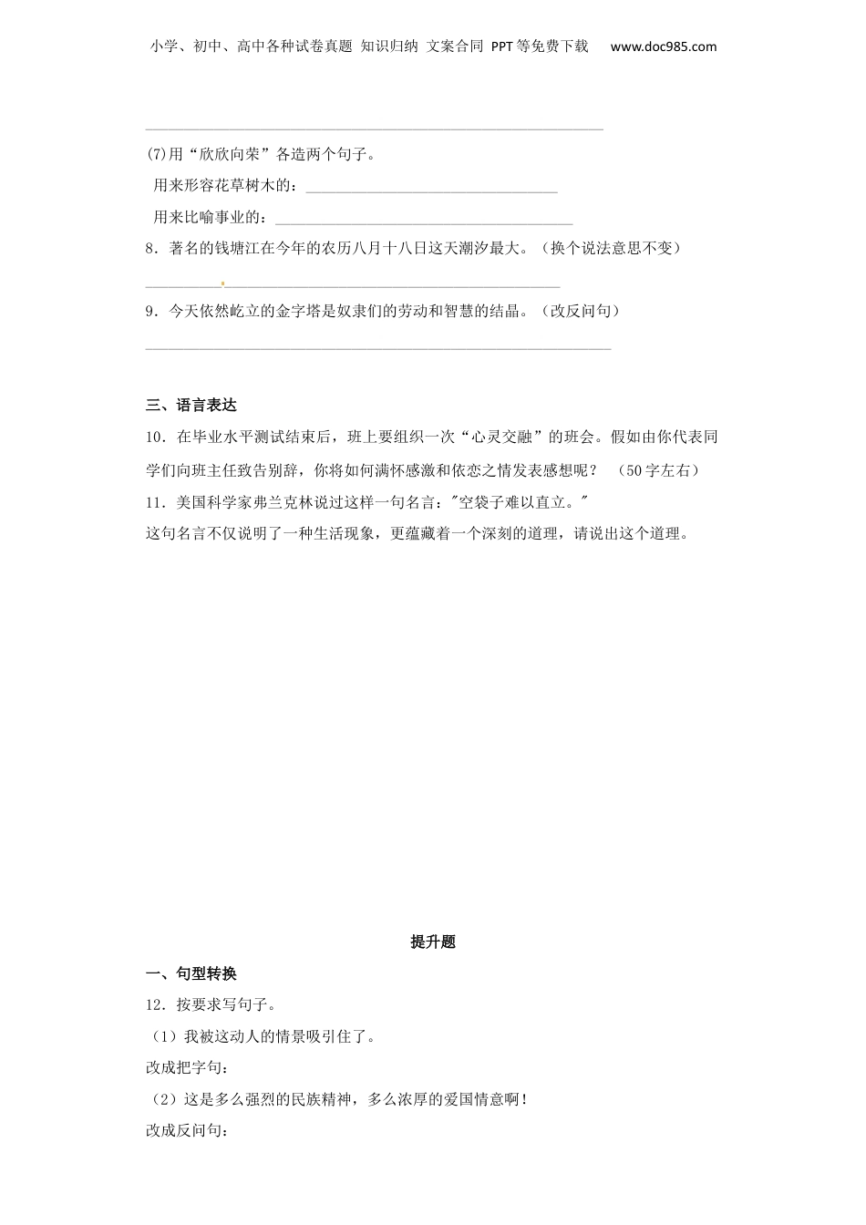 小学、初中、高中各种试卷真题知识归纳文案合同PPT等免费下载www.doc985.com小升初语文专项训练句式转换基础题一、选择题1.指出下列句子是什么句式。A设问句B疑问句C反问句D感叹句E陈述句(1)灰尘大多具有吸湿性能。()(2)假如空中没有灰尘,大自然将是多么单调啊!()(3)你的作业完成了吗?()(4)海底是否没有一点儿声音呢?不是的,海底的动物常常在窃窃私语。()(5)难道灰尘对我们一点好处都没有吗?()2.下列句子与例句同类的一句是()例:奶奶提着篮子上街买菜。A.爸爸让我们说说花生的好处。B.老师要求我们积极举手发言。C.我打开书包开始做作业。D.母亲叫闰土坐下来。二、填空题3.按要求写句子。1.黄叶随风飘落。(任意选一种修辞手法改写句子)2.树的幸福,在于以翠绿点染大地,净化空气,保持水土。(仿写句子)()的幸福,在于3.知识是无止境的,我们没有理由骄傲自满。(改成反问句)4.日发略维夫老爷家里守夜的爷爷是一个非常有趣的瘦小的老头儿。(缩句)5.妈妈对我说:“我明天,你外婆家去看看。”(改为转述句)4.按要求改写句子。老人诗一般的语言打动了我。改为“把”字句:_______________________________________改为“被”字句:_______________________________________5.按要求完成句子练习。小学、初中、高中各种试卷真题知识归纳文案合同PPT等免费下载www.doc985.com1.贝利有着精湛的球艺好高尚的体育道德,被誉为“世界足球之王”。(改写成反问句)2.一面面红旗在阳光的映照下显得十分鲜艳。(缩句)3.体育馆门前。(扩句)4.邓亚萍登上舞台(扩句)5.取得胜利。她经常一练一身汗。(用关联词把两句话连起来)6.句子训练营。我能按照要求完成下列句子练习。(1)晚上,月亮慢慢地升起来了。(运用拟人的写法把句子写得更生动)(2)敌人已经感觉到他们的前沿阵地不太安全了。没有胆量冒着我军的炮火出来搜查。(用上关联词语把两个句子合成一个句子)(3)扁鼻子军官的眼光立刻变得凶猛可怕。(修改病句)(4)妈妈纠正说:“你说得不对。他是人,人没有翅膀。”(改为间接转述的句子)(5)这一次你必须采到桑叶。(改为双重否定句)(6)中央电视台宣布了即将在全国招聘节目主持人的消息。(缩句)7.按要求改写句子。(l)高粱的全身具有鲜明的个性。(改双重否定句)___________________________________________________________(2)李校长说:“我今天要去开会,不能参加你们班的活动。”(改转述句)_________________________________________________________________(3)你敢说这支笔不是你偷的?(改陈述句)_________________________________________________________________(4)他的房子真小。(改夸张句)_________________________________________________________________(5)沿着这条小路走,能到小明家。(改成疑问句)________________________________________________________(6)改写句中画线部分,使它和未画线部分形成对偶。石间溪流脉脉,如线如缕。水塘中闪闪的碧波,就像锦缎一样。小学、初中、高中各种试卷真题知识归纳文案合同PPT等免费下载www.doc985.com____________________________________________________________(7)用“欣欣向荣”各造两个句子。用来形容花草树木的:_________________________________用来比喻事业的:_______________________________________8.著名的钱塘江在今年的农历八月十八日这天潮汐最大。(换个说法意思不变)______________________________________________________[来源:学科网ZXXK]9.今天依然屹立的金字塔是奴隶们的劳动和智慧的结晶。(改反问句)_____________________________________________________________三、语言表达10.在毕业水平测试结束后,班上要组织一次“心灵交融”的班会。假如由你代表同学们向班主任致告别辞,你将如何满怀感激和依恋之情发表感想呢?(50字左右)11.美国科学家弗兰克林说过这样一句名言:"空袋子难以直立。"这句名言不仅说明了一种生活现象,更蕴藏着一个深刻的道理,请说出这个道理。提升题一、句型转换12.按要求写句子。[来...