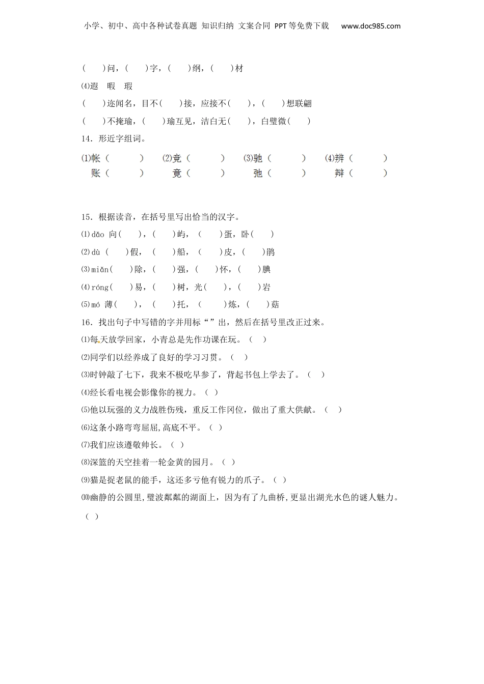小学、初中、高中各种试卷真题知识归纳文案合同PPT等免费下载www.doc985.com小升初语文专项训练形近字的辨析基础题第I卷一、填空题1.比较组词。茵()券()腊()屡()菌()卷()蜡()缕()吨()谱()盲()醒()纯()普()育()醉()瞎()恬()键()涛()割()括()健()滔()2.比较组词。敖()赐()裹()遨()踢()衷()熬()惕()哀()3.比一比,组词语。纱()绕()环()稳()[来源:Z§xx§k.Com]沙()烧()坏()隐()4.比一比,再组词。拟()赴()似()赵()躇()枕()著()沈()5.比较组词。缘()练()栽()增()绿()炼()载()僧()6.比较组词。恋()钮()综()博()小学、初中、高中各种试卷真题知识归纳文案合同PPT等免费下载www.doc985.com峦()纽()棕()搏()蛮()扭()踪()膊()7.比较组词。善()期()饿()破()膳()欺()峨()坡()8.比较组词。哨()稍()徒()延()捎()梢()徙()廷()链()朦()惕()舔()涟()蒙()踢()添()9.比较组词。寇()躁()遭()欲()冠()燥()糟()浴()博()碑()僻()筒()搏()脾()劈()桶()10.比一比,再组词。挽()倍()逢()佳()异()晚()培()缝()挂()导()11.辨字组词。津()袖()扒()泼()律()抽()趴()拔()12.根据读音,在括号里写出恰当的汉字。1.dǎo向()()屿()蛋卧()2.dù()假()船()皮()鹃3.miǎn()除()强()怀()腆4.róng()易()树光()()岩5.mó薄()()托()炼()菇13.选字组词。⑴建健()康,()设,()身,()议⑵形型()状,造(),()态,典()⑶题提小学、初中、高中各种试卷真题知识归纳文案合同PPT等免费下载www.doc985.com()问,()字,()纲,()材⑷遐暇瑕()迩闻名,目不()接,应接不(),()想联翩()不掩瑜,()瑜互见,洁白无(),白璧微()14.形近字组词。15.根据读音,在括号里写出恰当的汉字。⑴dǎo向(),()屿,()蛋,卧()⑵dù()假,()船,()皮,()鹃⑶miǎn()除,()强,()怀,()腆⑷róng()易,()树,光(),()岩[来源:学科网ZXXK]⑸mó薄(),()托,()炼,()菇16.找出句子中写错的字并用标“”出,然后在括号里改正过来。⑴每天放学回家,小青总是先作功课在玩。()⑵同学们以经养成了良好的学习习贯。()⑶时钟敲了七下,我来不极吃早参了,背起书包上学去了。()⑷经长看电视会影像你的视力。()⑸他以玩强的义力战胜伤残,重反工作冈位,做出了重大供献。()⑹这条小路弯弯屈屈,高底不平。()⑺我们应该遵敬帅长。()⑻深篮的天空挂着一轮金黄的园月。()⑼猫是捉老鼠的能手,这还多亏他有锐力的爪子。()⑽幽静的公圆里,璧波粼粼的湖面上,因为有了九曲桥,更显出湖光水色的谜人魅力。()小学、初中、高中各种试卷真题知识归纳文案合同PPT等免费下载www.doc985.com提升题第II卷一、选择题17.用“√”画出正确的拼音或字词。度假(jiàjiǎ)倾听(qīnɡqīn)摩天大厦(shàxià)鳞次栉比(jiézhì)(漫曼)步举世闻(明名)(宽阔宽广)的街道(观赏欣赏)音乐(轻柔轻轻)的海风(闪动闪耀)的灯光18.给带点字选择正确的解释:①不相同②特别③另外的④惊奇(1)独在异乡为异客。()(2)大海深处景色奇异。()(3)同学们异口同声地回答:“好!”()(4)看到日全食的景象,我们惊异地喊道:“太神奇了!”()19.选词填空。(1)幕慕暮()色银()爱()(2)戒诫械()备机()劝()20.选字组词21.选字填空。小学、初中、高中各种试卷真题知识归纳文案合同PPT等免费下载www.doc985.com22.我会选,给加横线的字音选择正确的读音。差异(chāchāi)比较(jiǎojiào)筛(shīshāi)选辐(fúfū)射淘汰(tàitāi)佳肴(yáoxiáo)盐碱(jiànjiǎn)浩瀚(hànhān)23.选字填空。娃洼蛙挂哇1.小明大声喊:“多么可爱的小葫芦()!”2.荷叶上蹲着一只小青()。3.妈妈送我的礼物是一个漂亮的洋()()。4.苍耳靠()住动物的皮毛走遍田野、山()。24.阅读下面文字,按要求答题。元霄上市,春节的又一个高潮到了。正[]月十五,处处zhāngd...