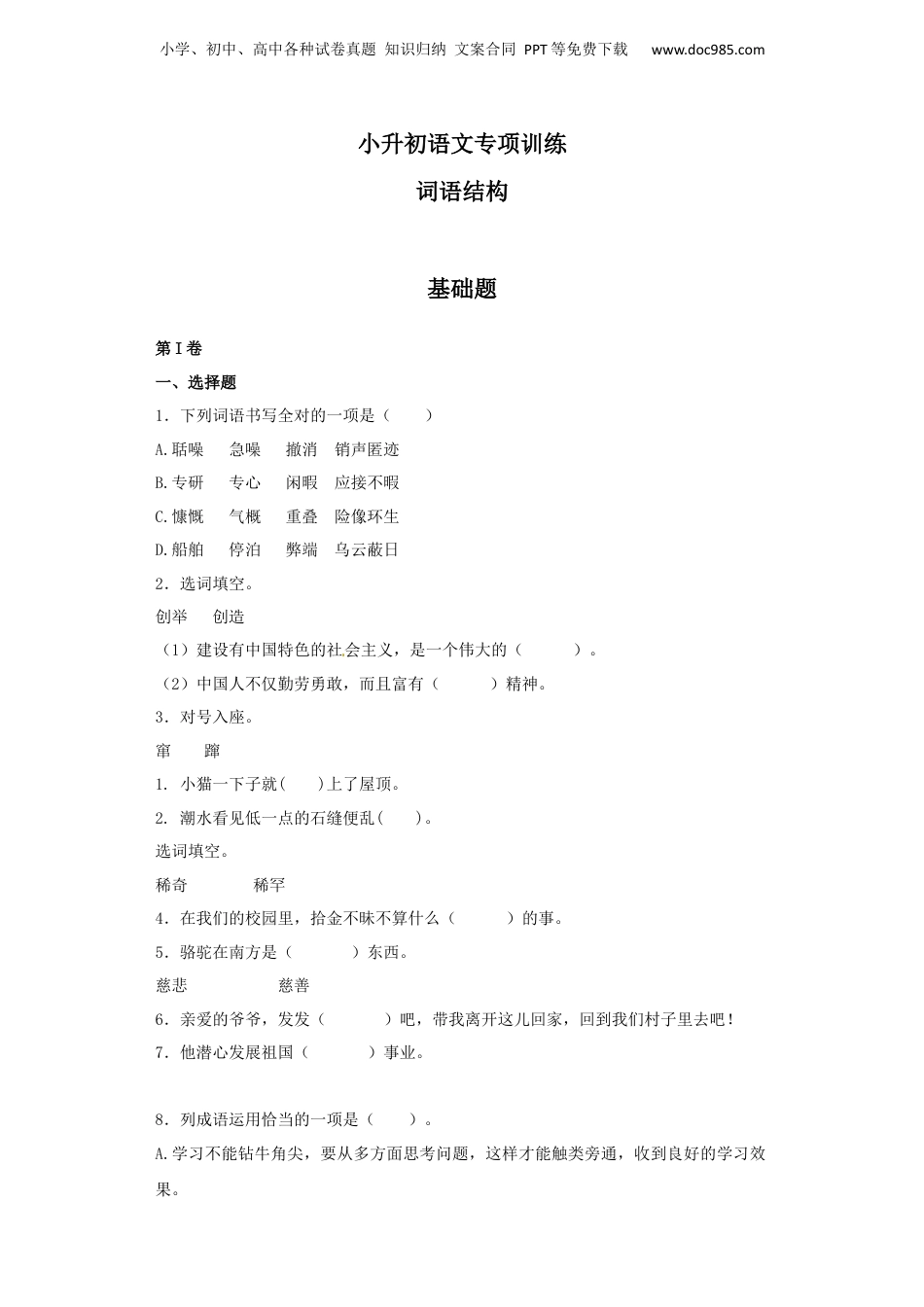 小学、初中、高中各种试卷真题知识归纳文案合同PPT等免费下载www.doc985.com小升初语文专项训练词语结构基础题第I卷一、选择题1.下列词语书写全对的一项是()A.聒噪急噪撤消销声匿迹B.专研专心闲暇应接不暇C.慷慨气概重叠险像环生D.船舶停泊弊端乌云蔽日2.选词填空。创举创造(1)建设有中国特色的社会主义,是一个伟大的()。(2)中国人不仅勤劳勇敢,而且富有()精神。3.对号入座。窜蹿1.小猫一下子就()上了屋顶。2.潮水看见低一点的石缝便乱()。选词填空。稀奇稀罕4.在我们的校园里,拾金不昧不算什么()的事。[来源:学科网ZXXK]5.骆驼在南方是()东西。慈悲慈善6.亲爱的爷爷,发发()吧,带我离开这儿回家,回到我们村子里去吧!7.他潜心发展祖国()事业。8.列成语运用恰当的一项是()。A.学习不能钻牛角尖,要从多方面思考问题,这样才能触类旁通,收到良好的学习效果。小学、初中、高中各种试卷真题知识归纳文案合同PPT等免费下载www.doc985.comB.导演冯小刚《集结号》中最重要的角色给了谷子地,其他演员几乎成了举重若轻的人物。C.佛山陈阿婆救小悦悦的事迹,一经新闻媒体报道,就被传得满城风雨,感动了无数市民。D.篝火映红了天空,原本寒风凜冽的大草原上顿时热火朝天。9.选择恰当的词语填空。祝愿心愿(1)这也是全世界爱好和平的人民的共同()。(2)世纪宝鼎表达了中国人民对联合国的美好()。10.下列句子中加横线的词语用得恰当的一句是()。A.赵明明的故事讲得很生动,同学们个个听得绘声绘色。B.这次活动大家积极性很高,三三两两地举手报名参加。C.“球进了”,大家欢呼着,跳跃着,高兴得张牙舞爪。D.我国的长城是举世闻名的古代伟大建筑。[来源:学科网ZXXK]11.下列各组词语中搭配不得当的一组是()A.变换一手法变革一体制B.表示一谢意表达一情感C.截然一反对断然一不同D.提髙一水平提升一素质12.“这是电影院”一句中,“电影院”的修饰词语排列正确的一项是()a.—座b.现代化的c.青岛市d.唯一的e.新型的A.dacbeB.aebcdC.cdabeD.bdace13.下列词组中搭配不当的一组词是()。A.改正缺点改变面貌改善生活B.严格要求严厉批评严肃形势C.结构紧凑联系紧密关系紧张D.缺乏勇气缺少资金性格缺陷14.在最搭配的词语下面画√。(8分)(搭升听)积木(搭升听)国旗(搭升听)音乐(发现学会发生)秘密(发现学会保护)环境(发现学会保护)骑车(珍惜学会保护)时间15.给画线的字选择正确的解释。()诚实和信任比金钱更宝贵。小学、初中、高中各种试卷真题知识归纳文案合同PPT等免费下载www.doc985.comA.真实的(心意)B.实在,的确C.如果;果真16.下列词语搭配完全正确的一项是()。A.提高认识;价钱便宜;解决疑难;保卫公物B.反映情况;身体强大;发扬风格;灌溉稻田C.发现问题;远大理想;参观演出;改正错误D.改善生活;天气晴朗;安排工作;工作认真17.下列关于笑的词语,说法不正确的一组是()A.最舒心的笑——微笑B.最无奈的笑——苦笑C.最阴险的笑——狞笑D.最真诚的笑——哄笑18.下列句中加点词语使用恰当的一项是()(2分)A.经过大家一番呕心沥血的开导,他终于明白了团队精神的重要性。B.读完《学生危机自救手册》后,同学们恍然大悟:原来学会自救可以躲过许多灾难。C.在专家们进行了一番严谨的论证后,总经理心血来潮地决定:新产品于下个月投放市场。D.三年不见了,李丽萍激动地对我说:“我俩真是有缘啊,这是我们第三次萍水相逢了!”19.一年一度的春节庙会吸引了国内外众多游客。庙会上有踩高跷、舞狮子、跑旱船、闹花灯……如果用一个四字词语形容庙会的内容,最恰当的是第()个。①津津乐道②摩肩接踵③丰富多彩④色彩斑斓二、填空题20.我会填,我能照样子在括号里填上合适的词。1.例大—小黑暗——()反——()虚假——()进步——()贫——()巨大——()2.例:碧绿的(叶子)机灵的()雪白的()快乐的()寒冷的()平静的()热烈的()3.例:摇摇摆摆小学、初中、高中各种试卷真题知识归纳文案合同PPT等免费下载www.doc985.com________________________________________4.例:一片片叶子一棵棵____...