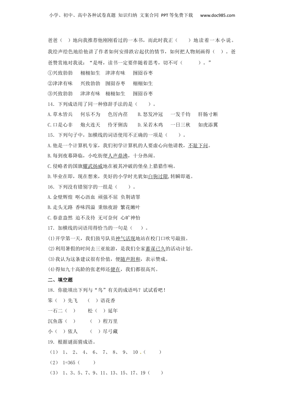 小学、初中、高中各种试卷真题知识归纳文案合同PPT等免费下载www.doc985.com小升初语文专项训练成语和熟语基础题第I卷一、选择题1.选择恰当词语的序号填在句子中的括号里。①独具匠心②妙笔生花③张冠李戴④囫囵吞枣很多文学作品的构思都(),我们阅读的时候不应该()。2.加横线字解释不正确的一项是()。(1)因人而异(不相同)(2)景色奇异(特别)(3)顾名思义(情谊)(4)至仁至义(正义,合乎情理)3.下列句子中,加横线的成语使用不正确的一项是()。A.更奇怪的是,桃花心木苗有时莫名其妙地枯萎了。B.台上,顶碗少年呆呆地站着,脸上全是汗珠,他有些不知所措了。C.那是个停电的晚上,沙尘暴蜂拥而至地撕扯着黑暗中的一切,我缩在被窝里惊恐地竖耳听着。D.我们为人民而死,就是死得其所。4.下列句子加横线的成语运用不恰当的一项是()A.他望着八百里起伏的沂蒙群山,文思泉涌,一首《沂蒙颂》一气呵成。[来源:学科网]B.对于各种网络游戏,一些年轻人沉溺其中,乐此不疲,浪费了不少宝贵的青春时光。C.得到朋友的鼓励与支持,她勇敢地走向赛场,成为当天最耀眼的一颗明星,真是相得益彰啊。D.教语女尚主去师讲课幽默风趣,同学们常常忍俊不禁,学习语文的兴趣越来越高。5.下列句子中加横线成语使用恰当的一项是()A.这间卧室布置得大方得体,每件物品都放得恰到好处,令人赏心悦目。B.在新的形势下,我们更应当不断学习,见异思迁,积极进取。C.事情还没有到山重水复的地步,只要我们不放弃,就一定会有转机。D.刚一开局,他就带着一个“炮”杀一儆百地闯过来。小学、初中、高中各种试卷真题知识归纳文案合同PPT等免费下载www.doc985.com6.下列各组词语中,加横线字的读音全部正确的一项是()A.阴晦(huì)押解(jiè)奄奄一息(yān)风靡全球(mǐ)B.艄公(shāo)蜷伏(quán)鳞次栉比(zhì)翘首远望(qiáo)C.攫取(jué)刽子手(kuài)硕果累累(léi)舐犊之情(shì)D.躯壳(ké)诘难(jié)气吞斗牛(dǒu)唯唯连声(wěi)7.小学最后一个新年该怎么过?针对这个问题同学们展开了激烈的讨论,纷纷发表自己的看法。如果用恰当的词语来形容这个场面,应该选用第()个。①欢呼雀跃②口若悬河③各抒己见④滔滔不绝8.“张老师退休后一直义务打扫小区卫生,别人都不以为然,可张老师却很喜欢做这件事而不知疲倦。”替换画线句子最恰当的词是第()个。①孜孜不倦②乐此不疲③跃跃欲试④情有独钟9.我会选词填空囫囵吞枣牵肠挂肚与众不同悲欢离合别出心裁如饥似渴不知从什么时候开始,我喜欢上了阅读,爸爸书架上的一些,差不多都被我翻过了。刚开始,我读的很快,(),大有“不求甚解”的味道,慢慢地,故事中人物的命运遭遇吸引了我,他们()常常使我()。我开始()地阅读,不知不觉中,得到了丰厚的报偿。从小学三年级开始,我的作文构思就(),落笔也()。10.下列词语书写全对的一项是()A.聒噪急噪撤消销声匿迹B.专研专心闲暇应接不暇C.慷慨气概重叠险像环生D.船舶停泊弊端乌云蔽日11.下列加横线的成语使用不恰当的一项是()。A.民主街成了商业街后,行人从早到晚川流不息。B.这部电影,故事情节曲折,人物形象生动,确实引人入胜。C.实现四化,需要各族人民同心协力地奋斗。D.他明知难以抵赖,但表面却从容不迫地抽着烟,看着审讯人员。12.词语中,写法全部正确的一组是()A.唱念坐打余音绕梁B.粉妆玉砌银装素裹C.匪疑所思莫衷一是D.白驹过隙穿流不息13.根据句子的意思依次选词填空,正确的是第()组。小学、初中、高中各种试卷真题知识归纳文案合同PPT等免费下载www.doc985.com爸爸()地向我推荐他刚刚看过的一本书,而此时我正()地读着一本小说。我绘声绘色地给他讲了作者如何安排跌宕起伏的情节,如何把人物刻画得()。爸爸赞赏地对我说:“是呀,读书一定要伴随着思考,切不可()。”①兴致勃勃栩栩如生津津有味囫囵吞枣②津津有味兴致勃勃囫囵吞枣栩栩如生③兴致勃勃津津有味栩栩如生囫囵吞枣14.下列成语用了同一种修辞手法的是()。A.草木皆兵何乐不为色厉内荏B.怒发冲冠一发千钧肝肠寸断C.口是心非炮火连天伶牙俐齿D.呆若木鸡一...